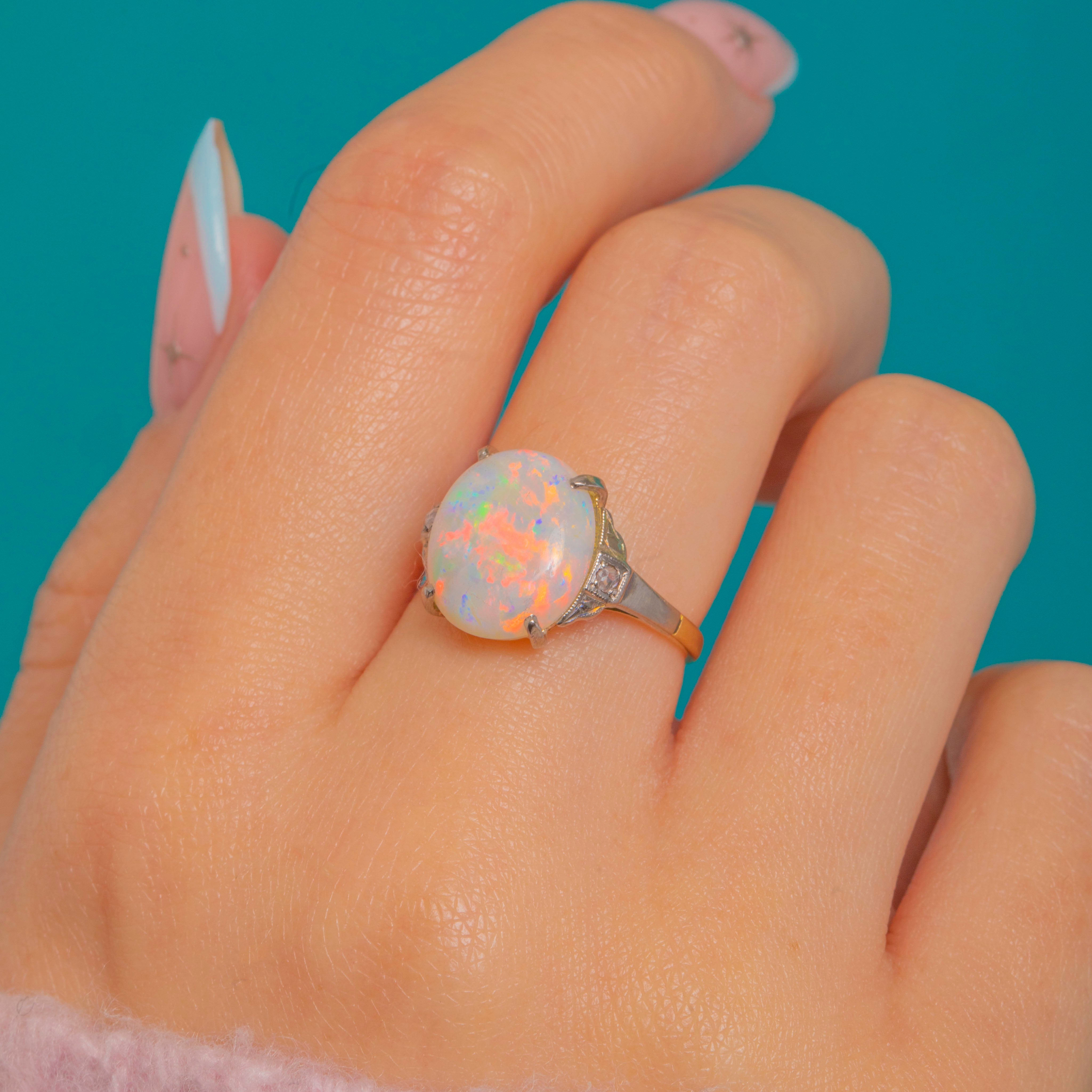 VERY GOOD-EXCELLENT: The Opal is smooth and glossy with vibrant play-of-colour and no chips observed; only light, age-appropriate surface wear. The White Gold settings are crisp with secure claws and fine milgrain detail, showing gentle patina consistent with age. The Yellow Gold shank is strong with a neat previous sizing seam visible to the underside.