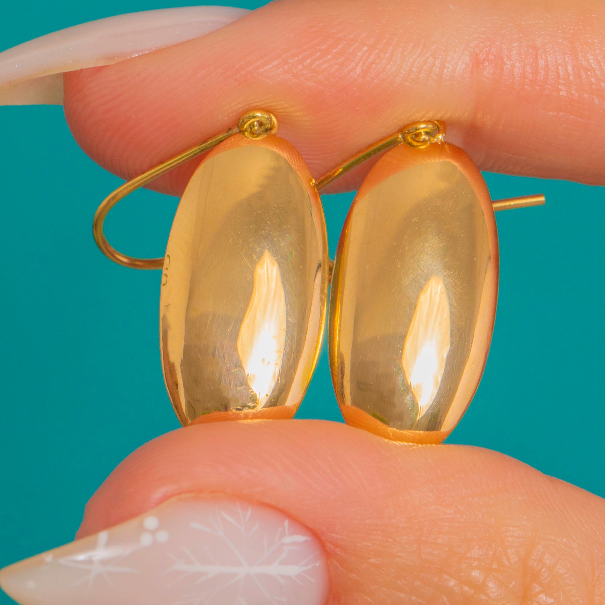 These Art Deco 18ct Gold drop earrings distil sleek design into its purest form. Each elongated, high-domed oval glows with a mirror-bright polish, offering a sculptural silhouette that dances with the light as you move.