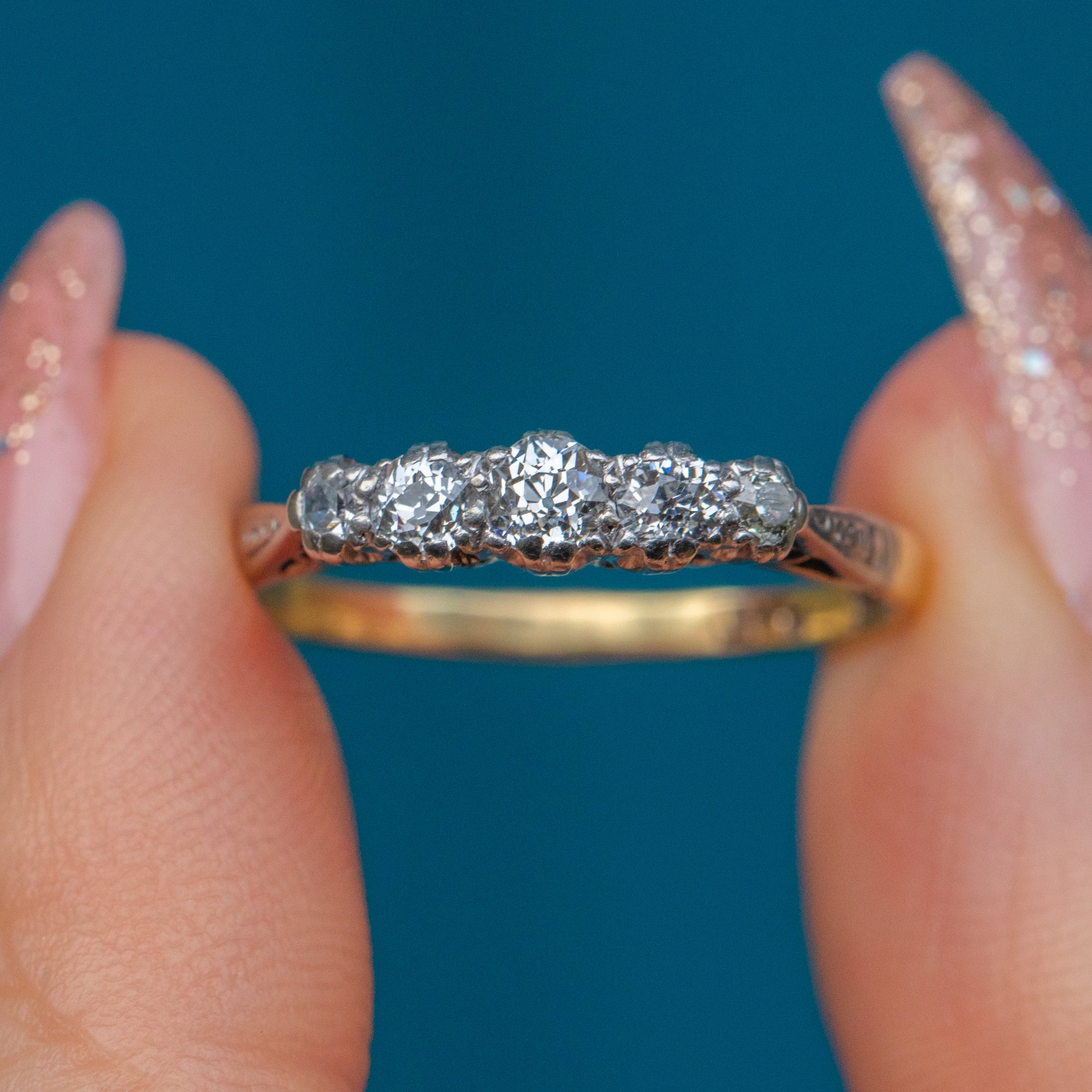 Five twinkling Diamonds sit on an 18ct Gold band, oozing glamour and sophistication as she sits on your finger. With a combined carat weight of 0.25ct, each Old-European cut Diamond scintillates in the light and sits comfortably within lustrous Platinum settings, flaunting a 4.5mm profile with her gorgeous gallery.