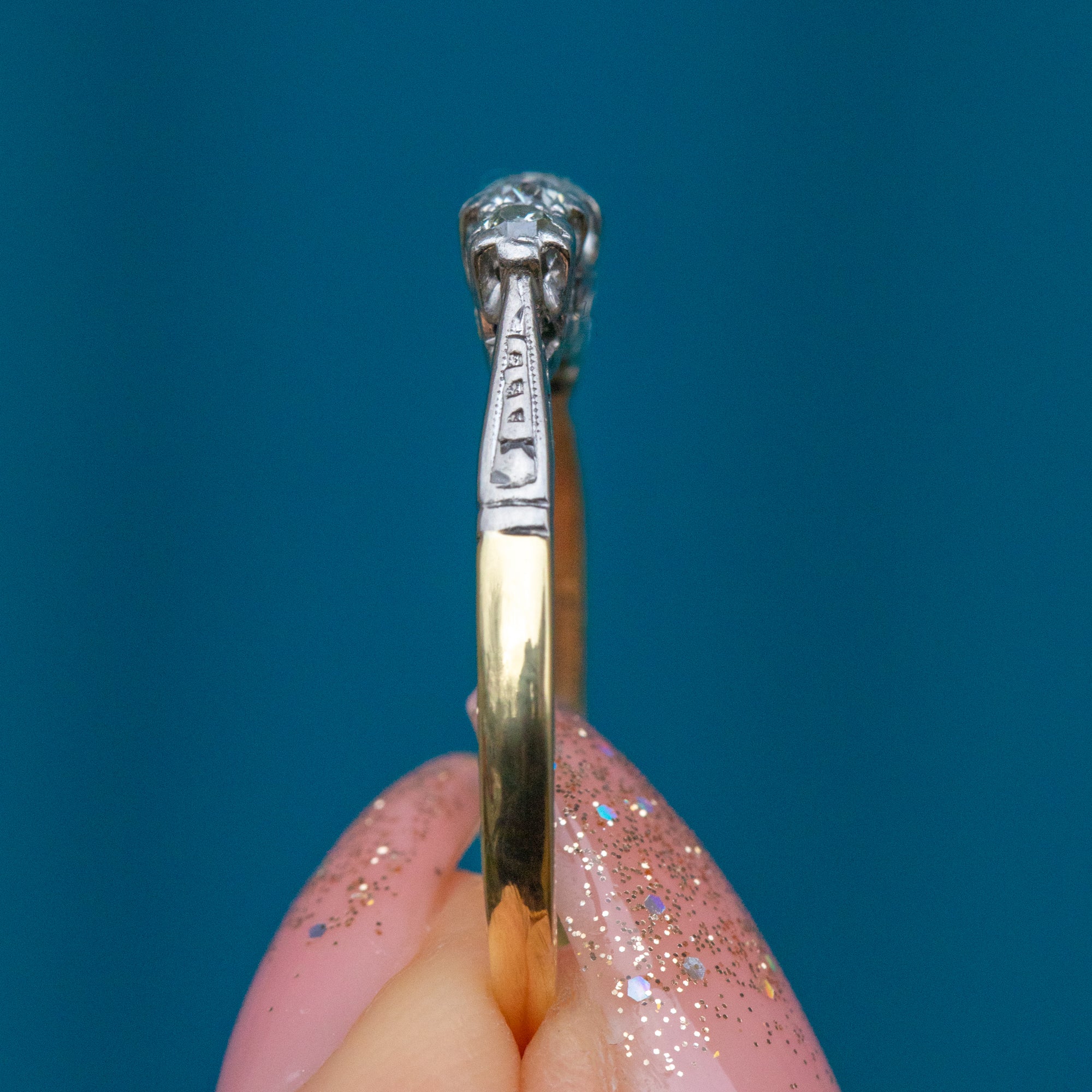 EXCELLENT: This Art Deco 18ct Gold and Platinum Diamond ring is in excellent condition. Each of her Diamond are free from any scuffs or scratches and sit comfortably within their Platinum settings. With little else to note, she is a must-have.