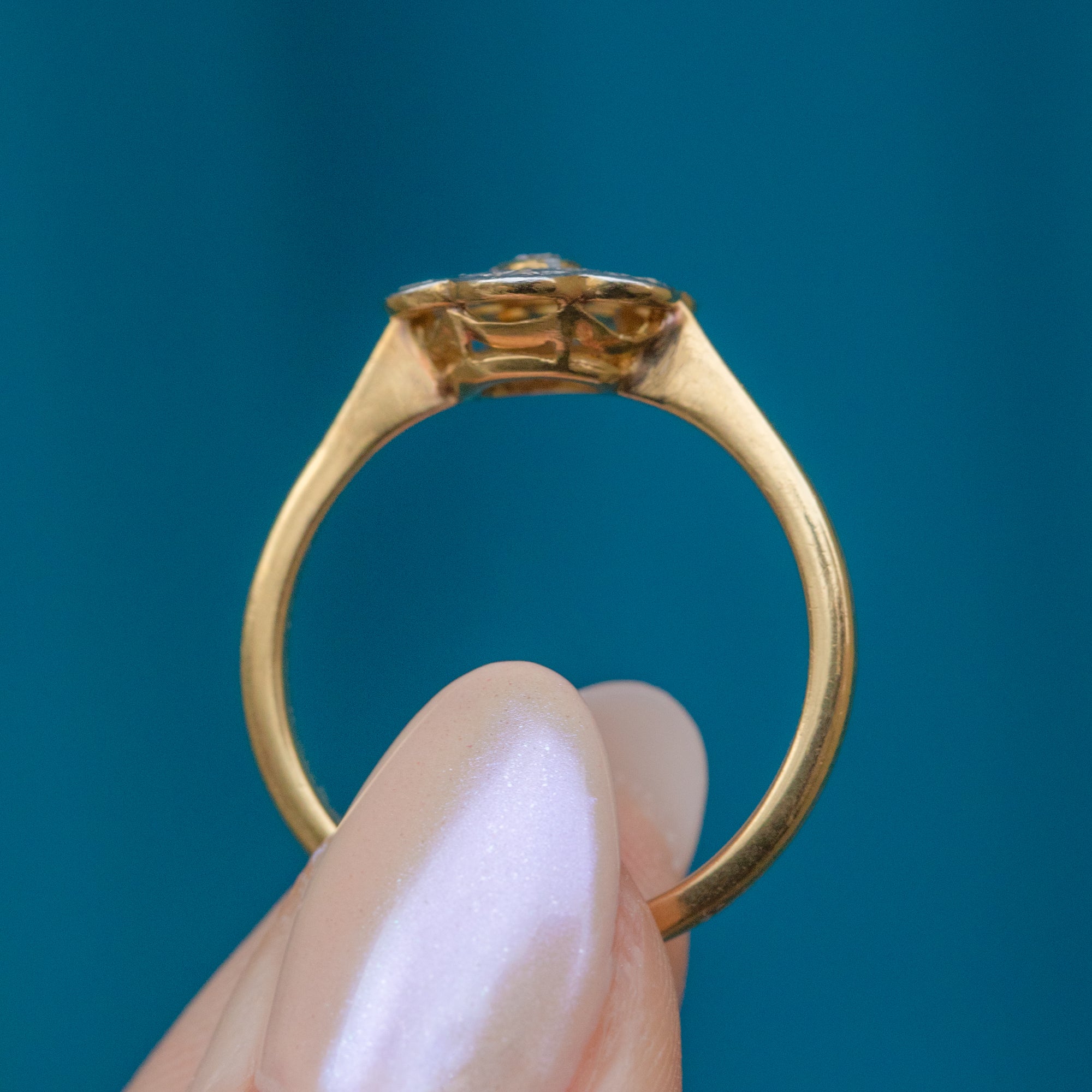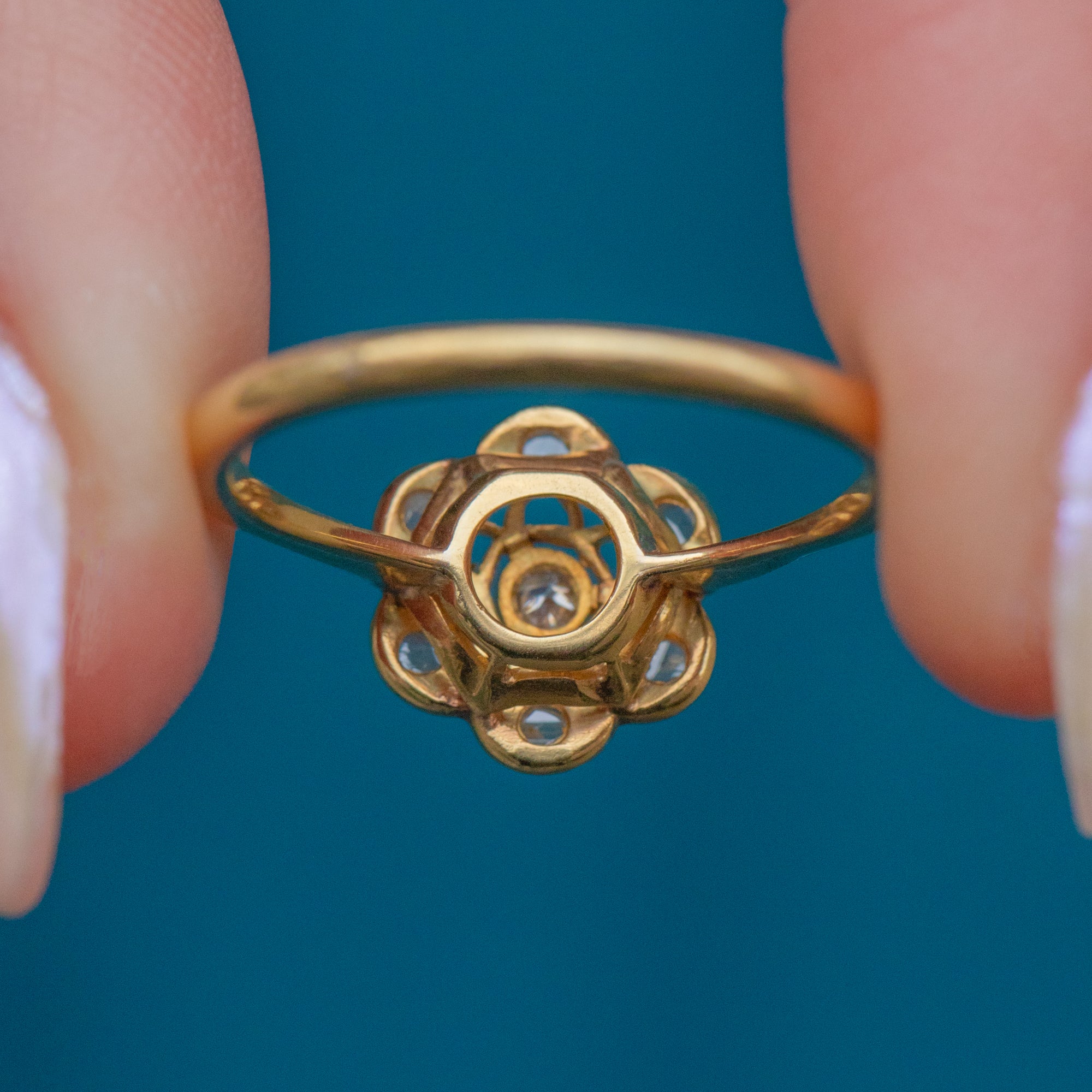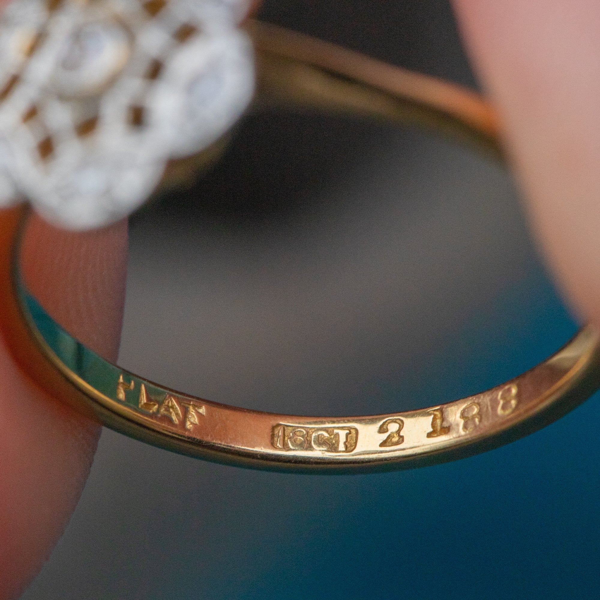 EXCELLENT. This Art Deco 18ct Gold & Platinum Diamond openwork ring is in excellent condition. All of the Diamonds are securely set and each is free from damage of any kind. Her openwork Platinum settings are stunning too, with her dainty flower keeping in pristine condition for nearly 100 years!