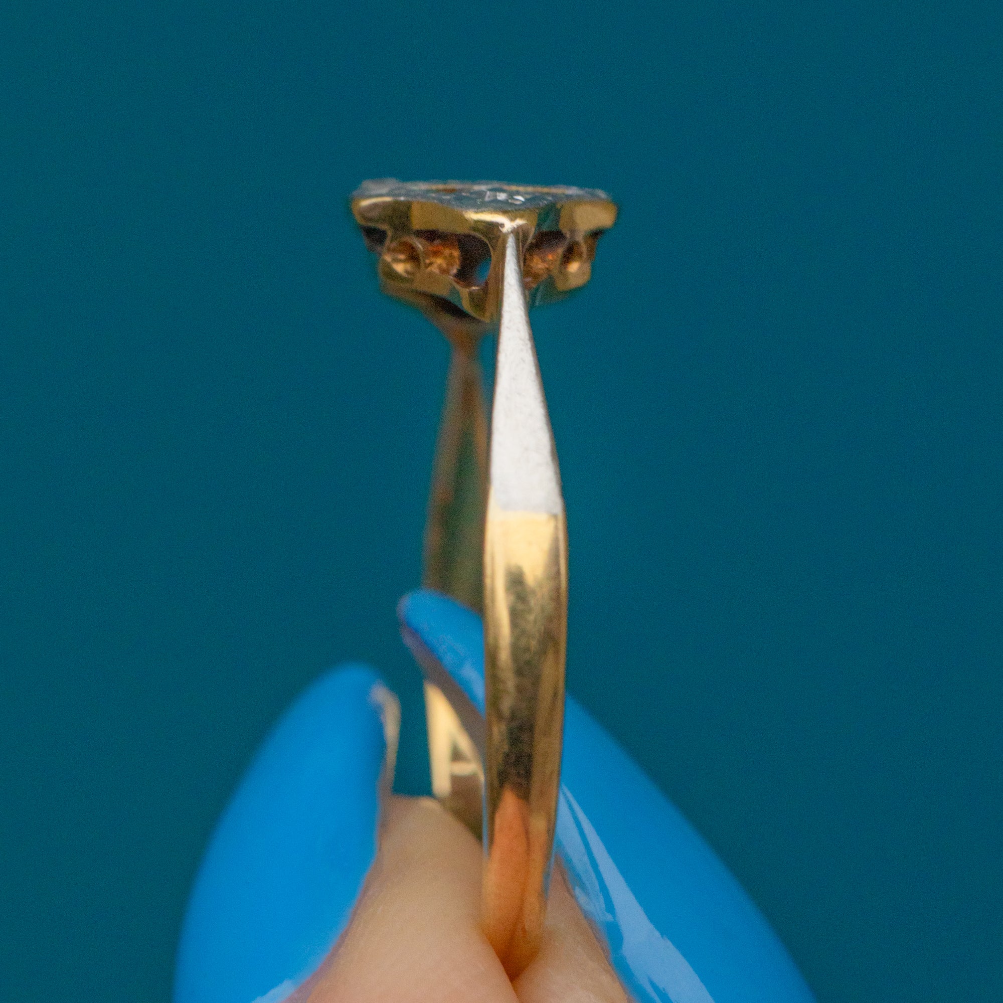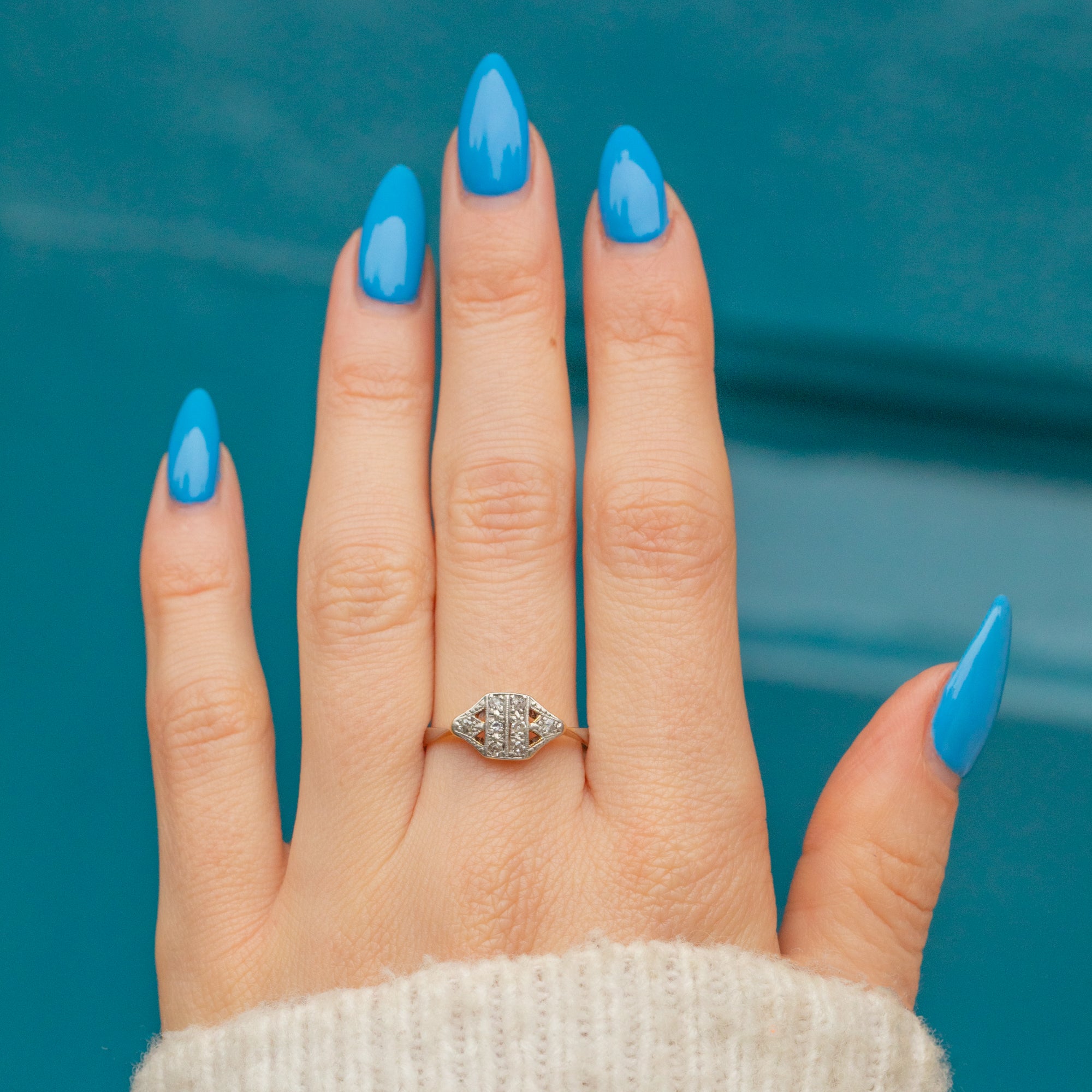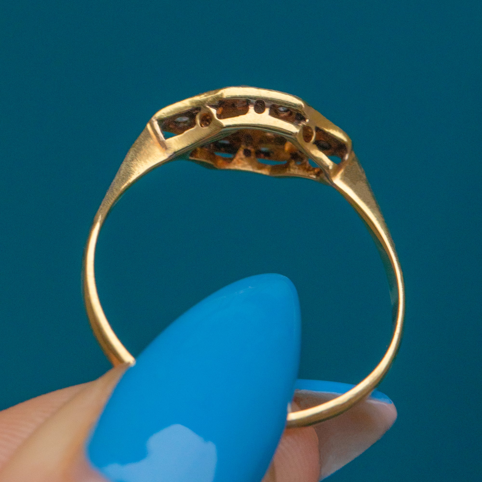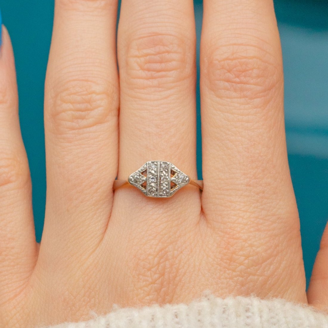 Crafted from sumptuous 18ct Gold and sprinkled with Diamonds set in Platinum, this Art Deco ring exudes luxury from every angle. With a low profile making this piece perfect for everyday wear, this antique Diamond ring will bring elegance to your curated ring stack!