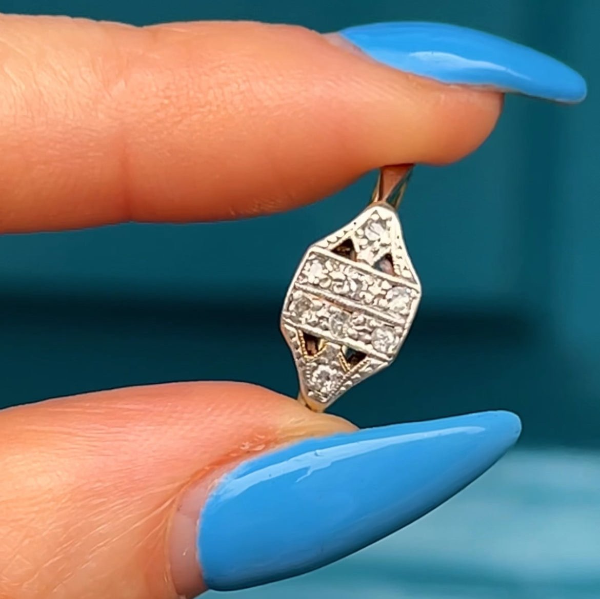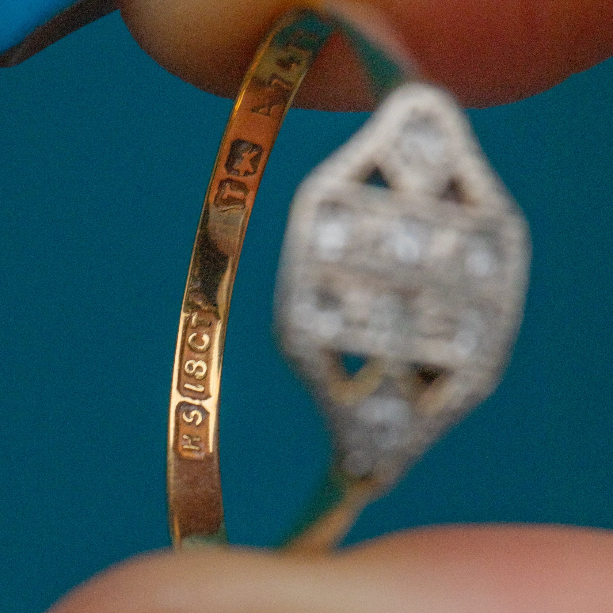 VERY GOOD-EXCELLENT. This Art Deco 18ct Gold & Platinum Diamond lozenge cluster ring is in wonderful condition. The Diamonds are all present and secure with their illusion settings and each component is firmly affixed. There is some general age-related wear, and some of the hallmarks have been lost to a previous resizing, but overall this Art Deco ring is lovely and will make a fab addition to your collection!