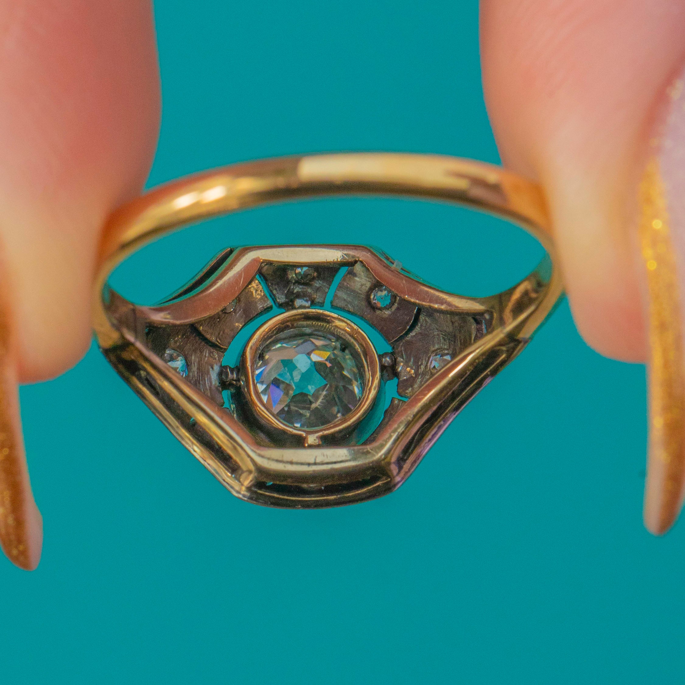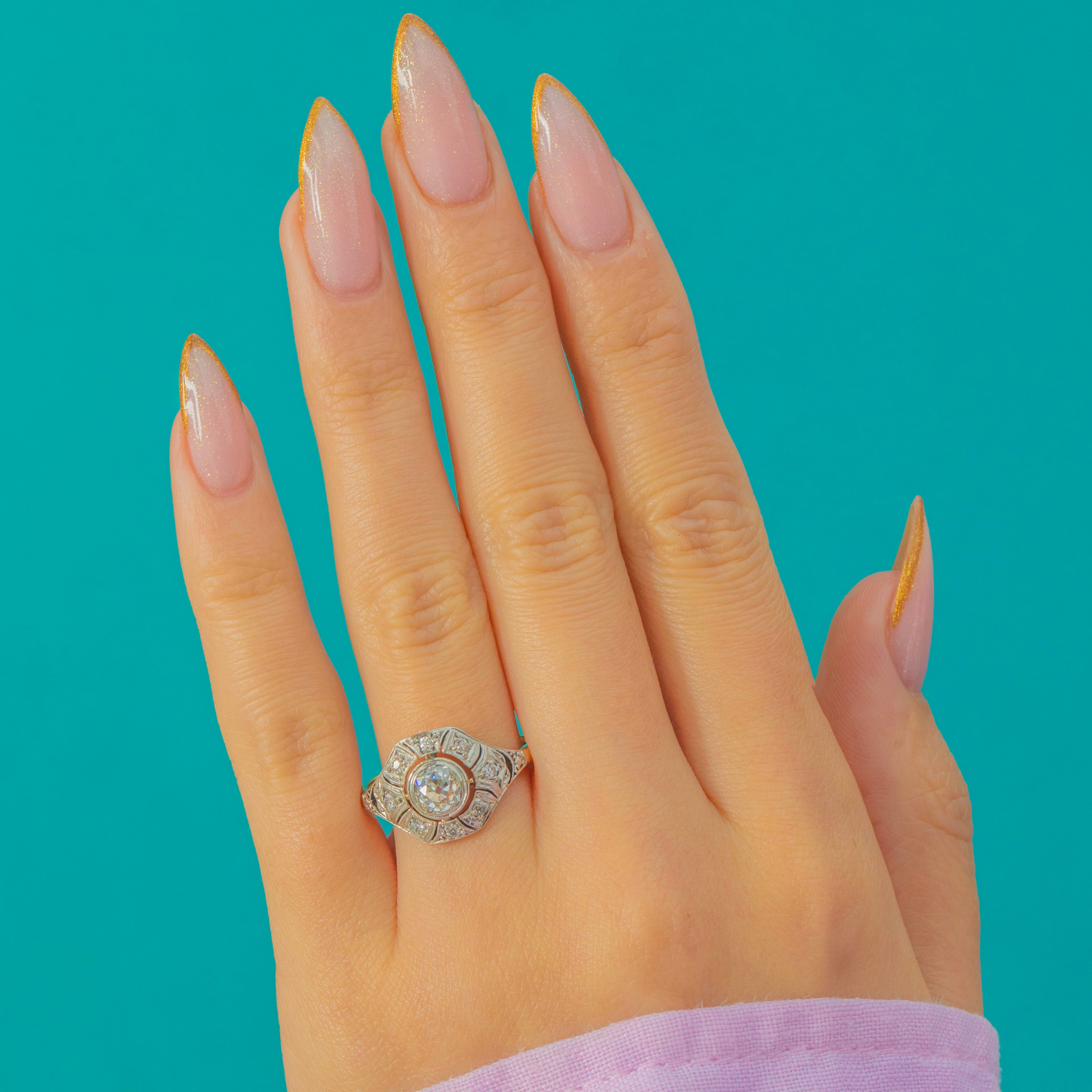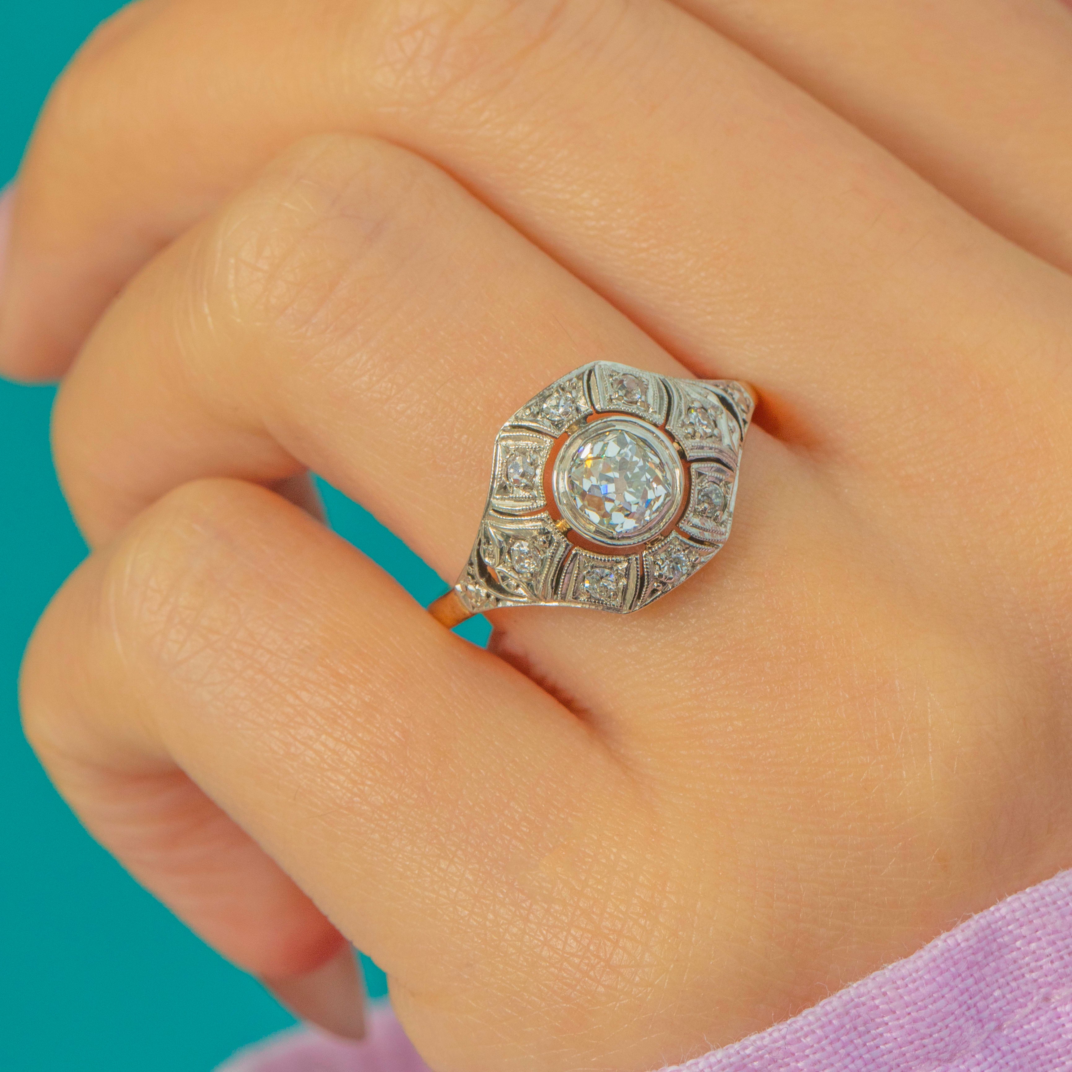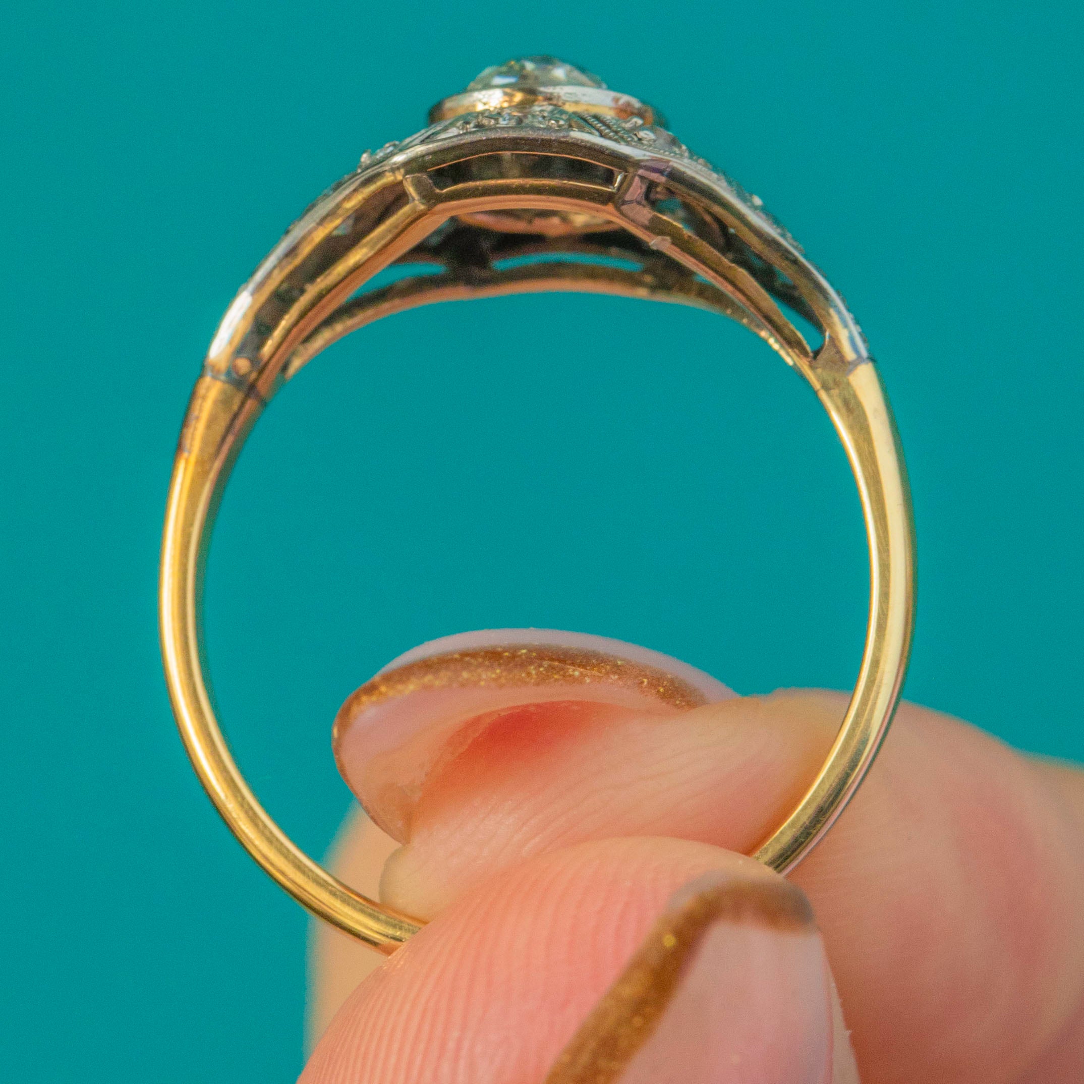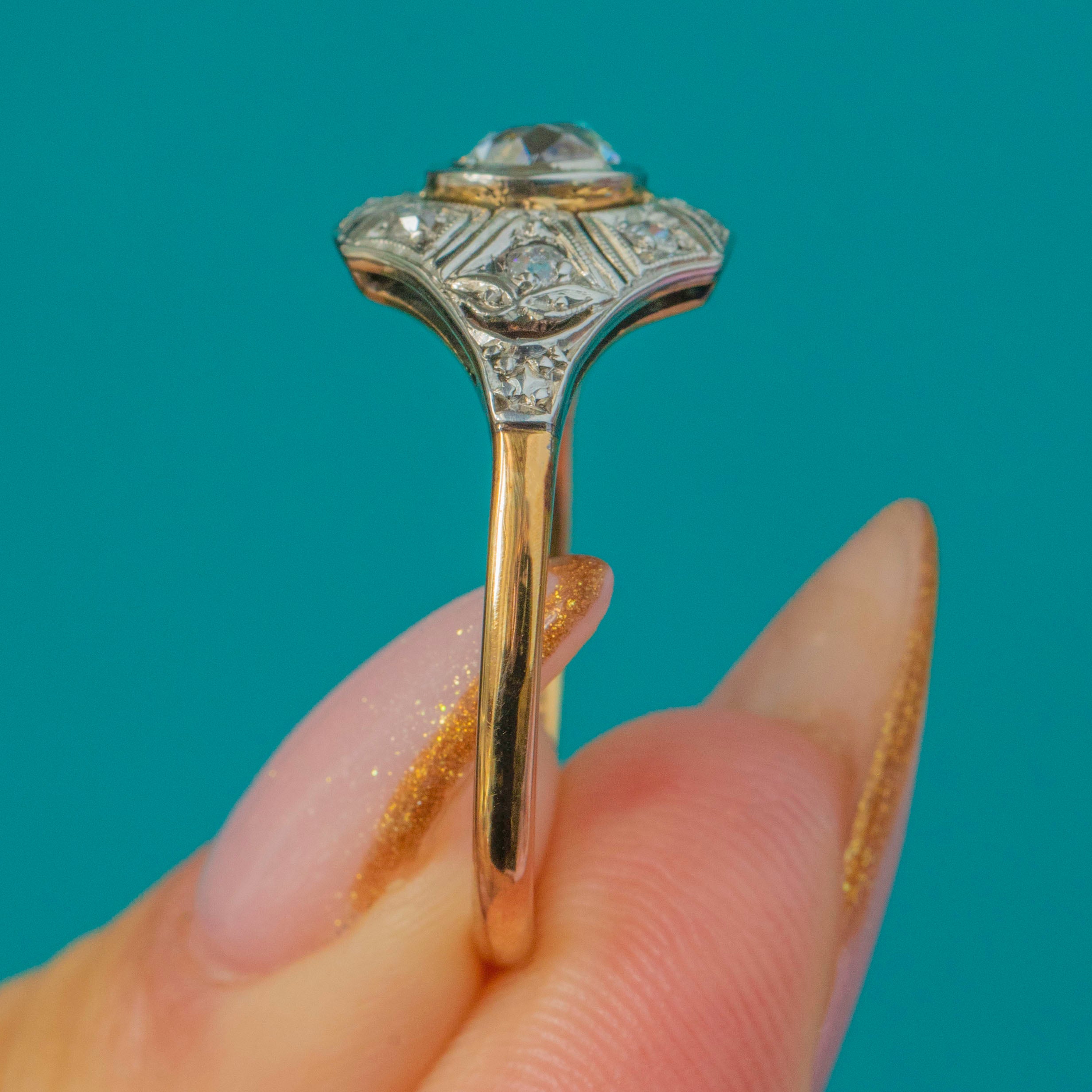 A glamorous Art Deco Diamond ring dating to circa 1930, crafted in luxurious 18ct Gold with refined Platinum settings. At the centre sits a sparkling Old Cut Diamond of approximately 0.50cts, beautifully bright with G–H colour and VS1–2 clarity. The geometric openwork shoulders are set with further rose-cut Diamonds totalling around 0.20cts, providing the ring with endless sparkle.