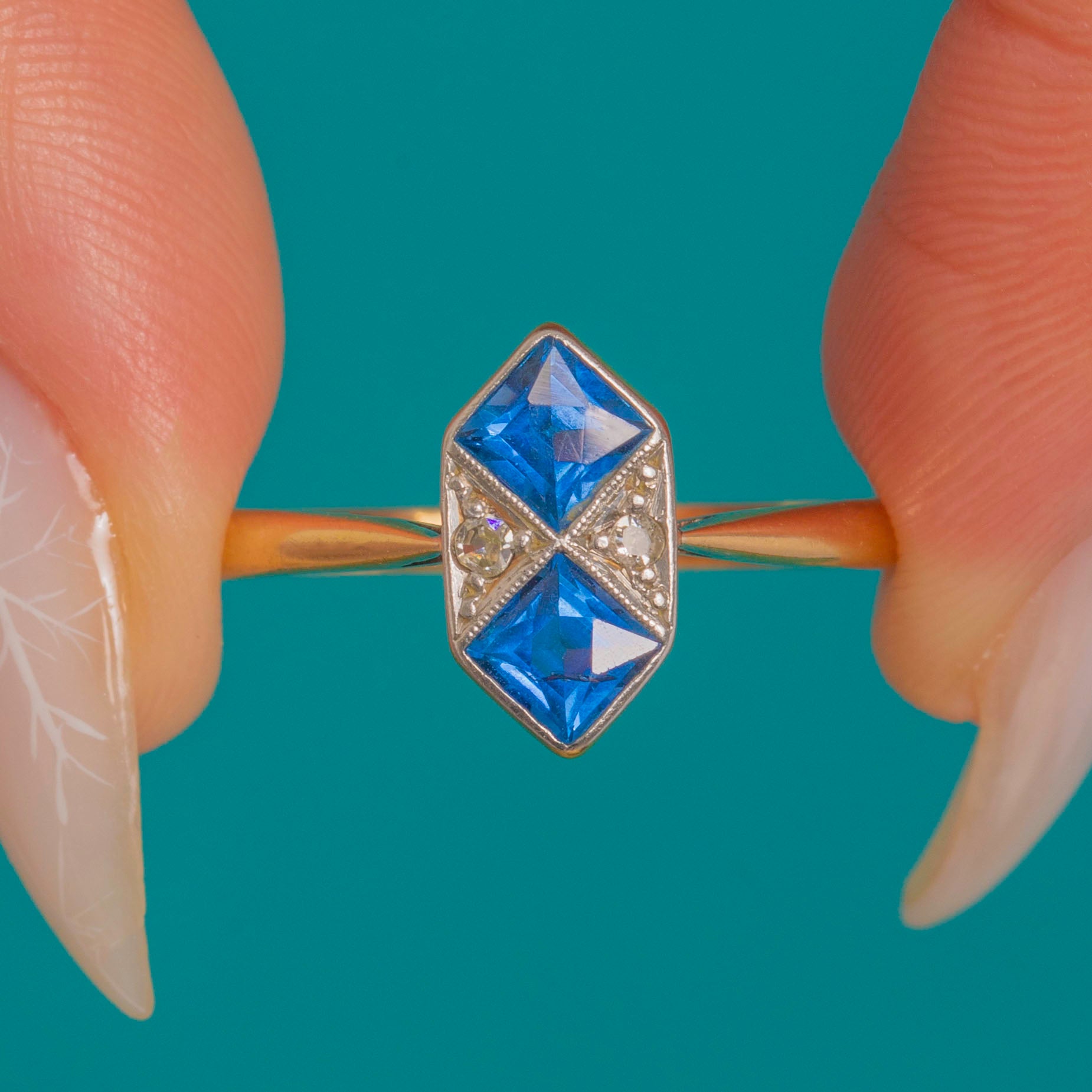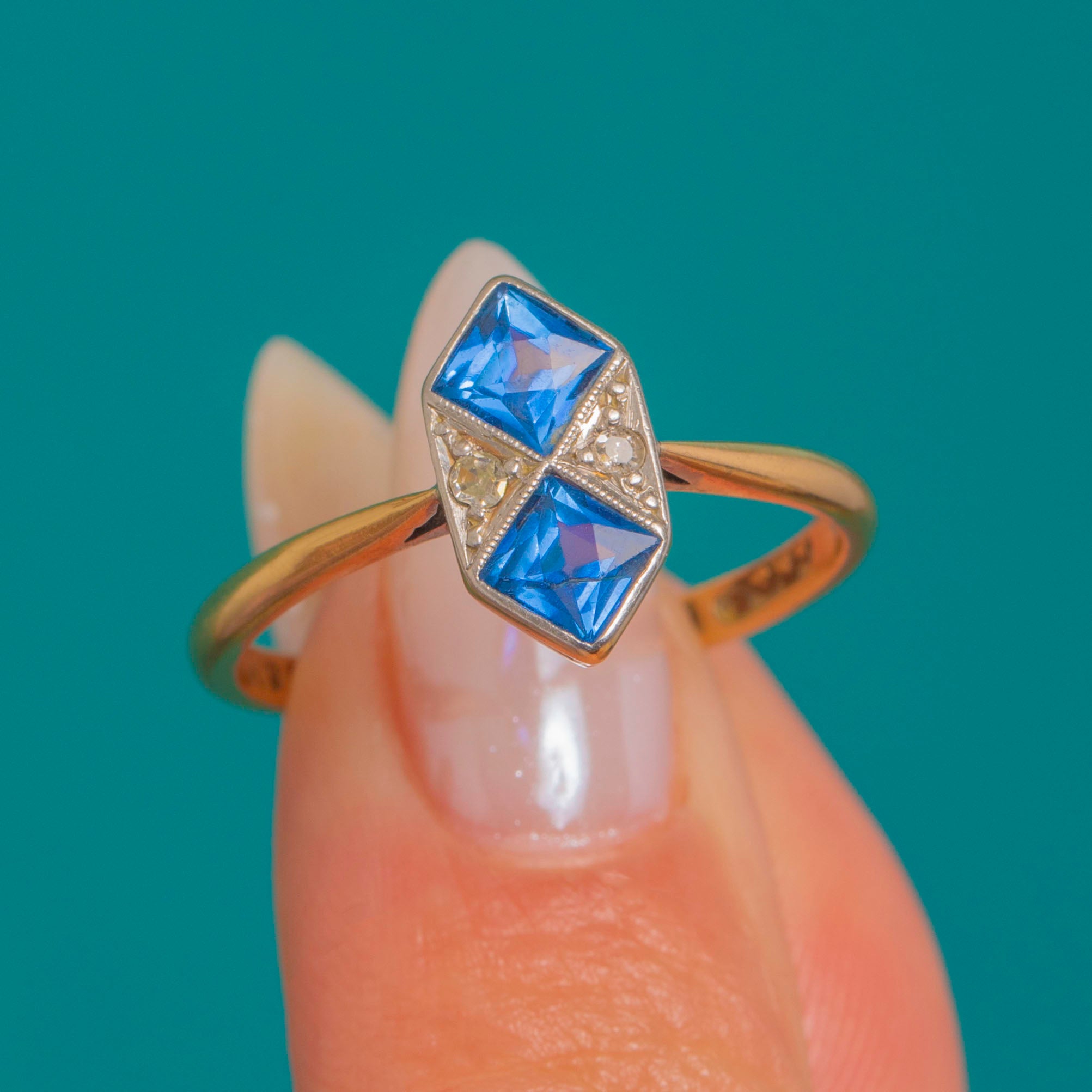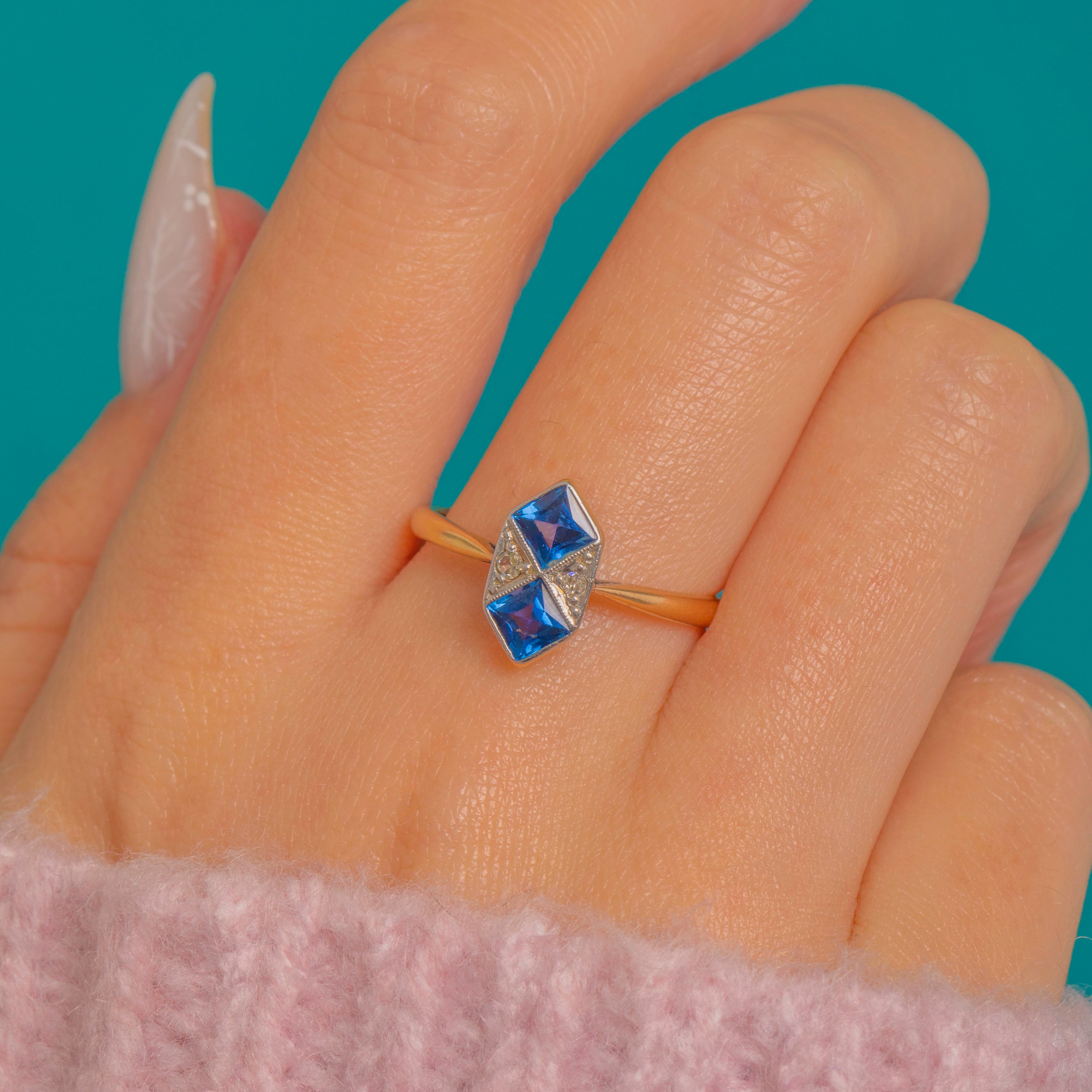 This elegant Art Deco ring dates to the 1920s and showcases the clean geometry and refined craftsmanship of the period. At its centre is a striking lozenge-shaped panel, set with two vivid French cut Sapphires arranged end to end, their angular facets perfectly suited to the Deco aesthetic.