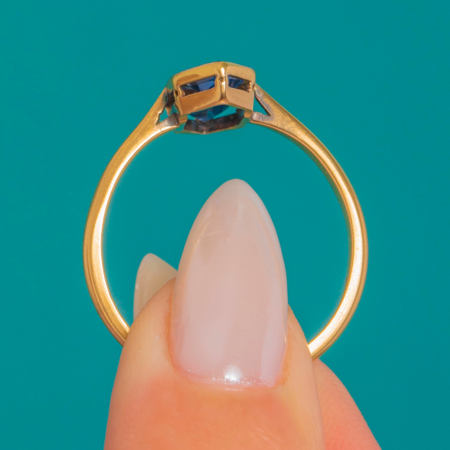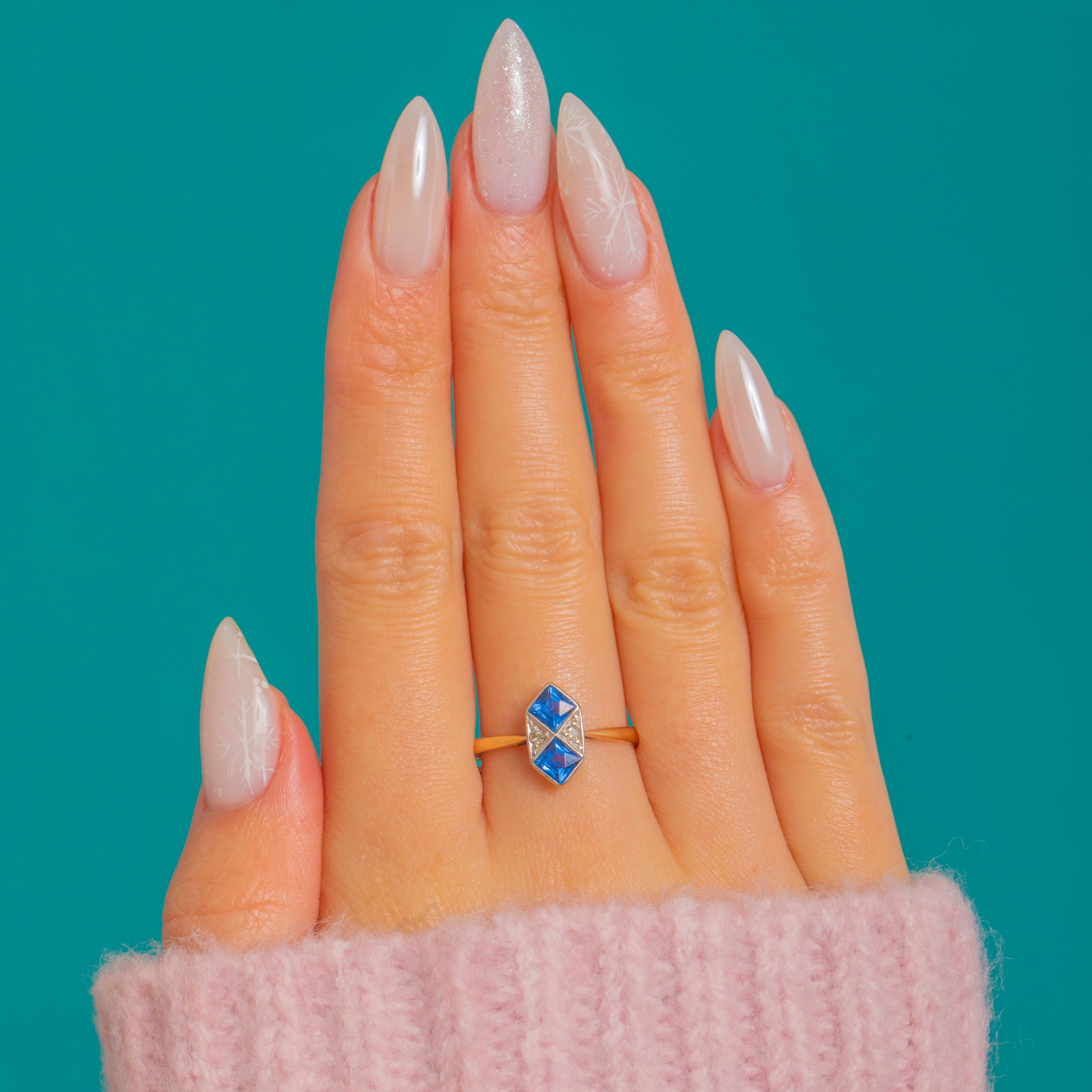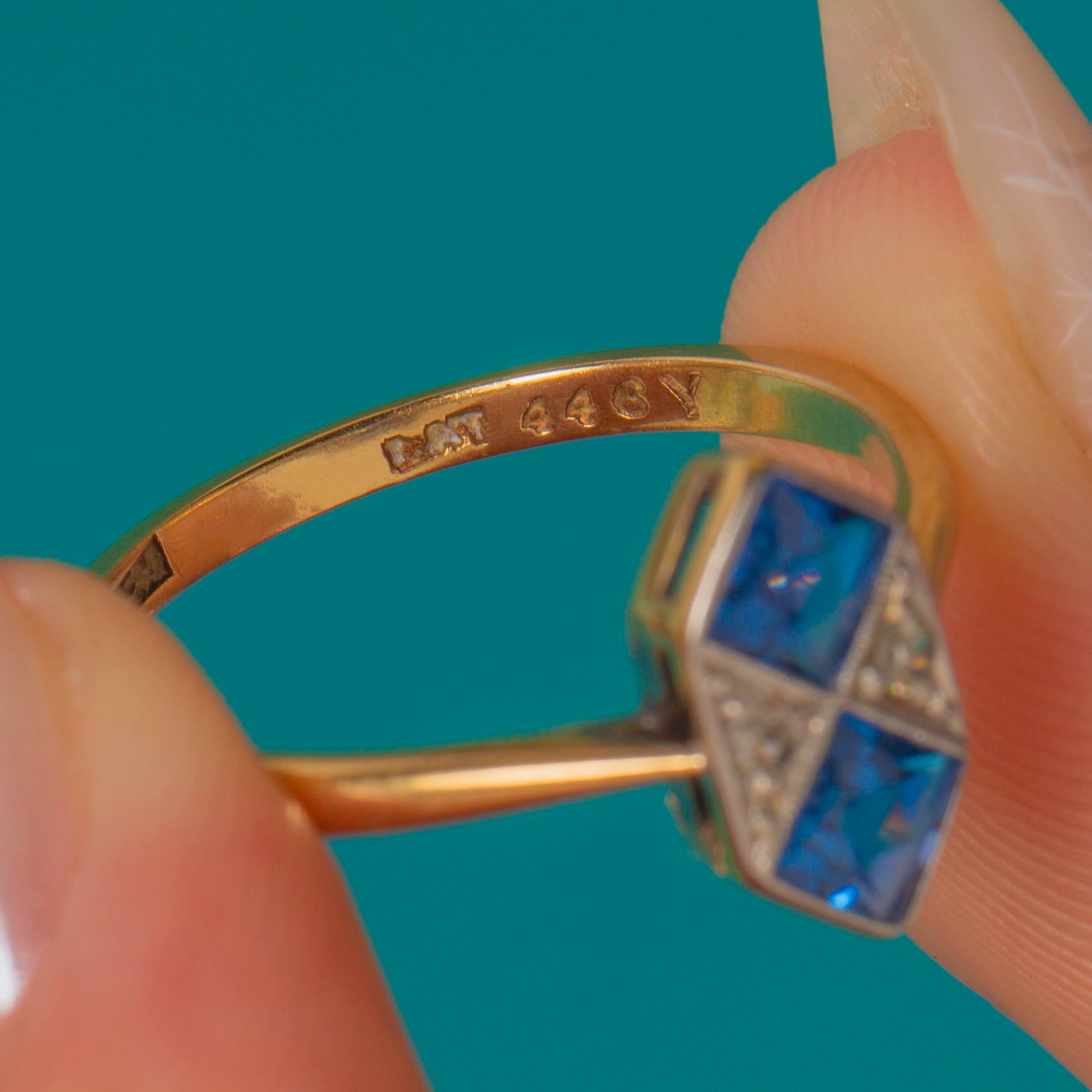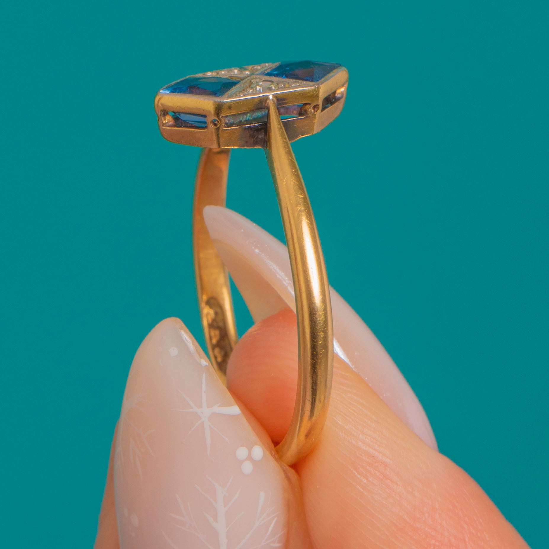 This elegant Art Deco ring dates to the 1920s and showcases the clean geometry and refined craftsmanship of the period. At its centre is a striking lozenge-shaped panel, set with two vivid French cut Sapphires arranged end to end, their angular facets perfectly suited to the Deco aesthetic.
