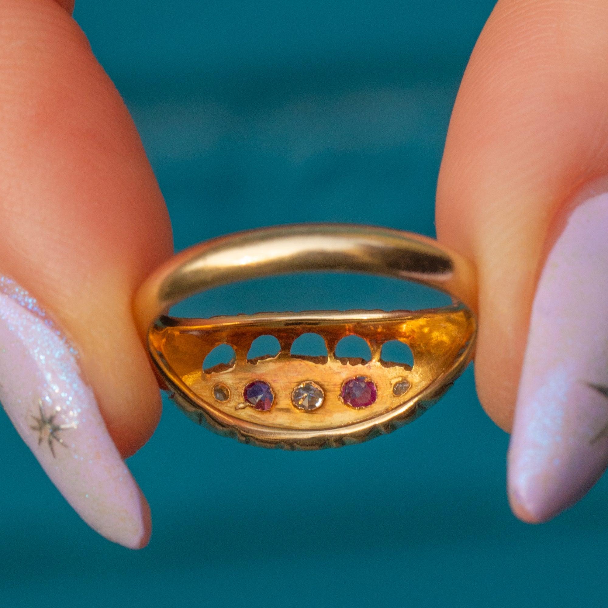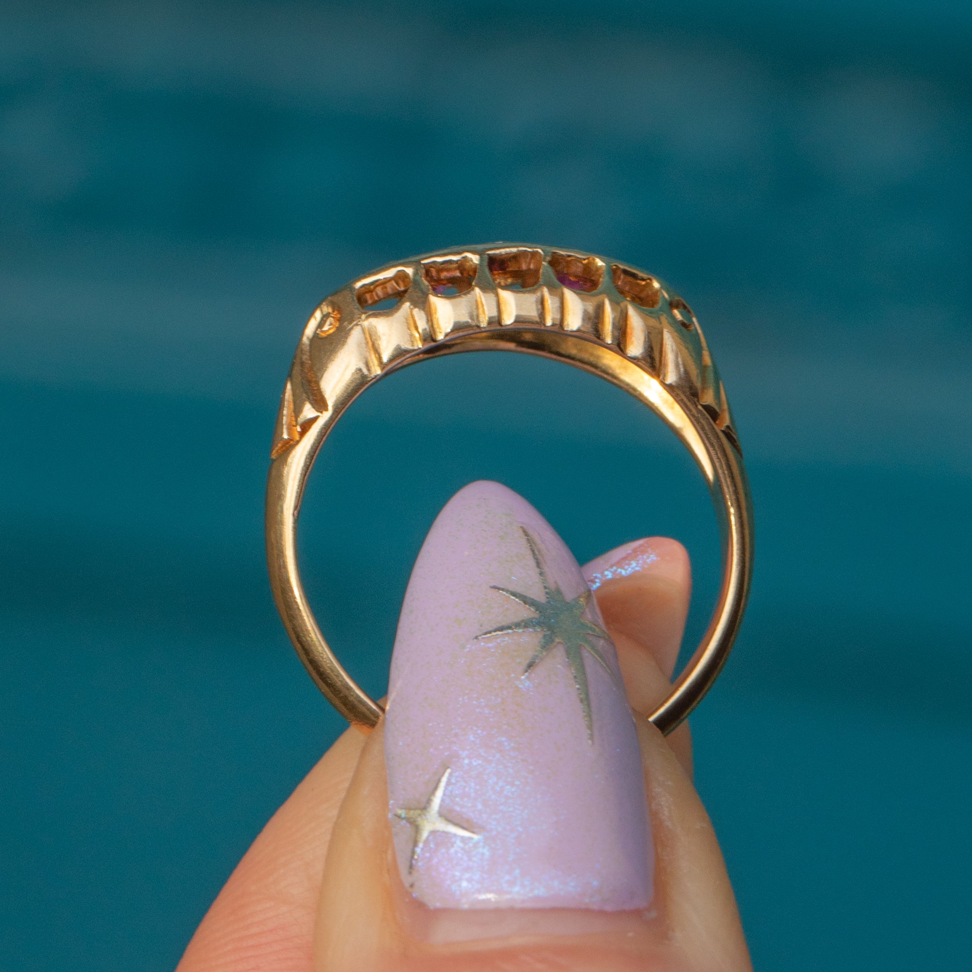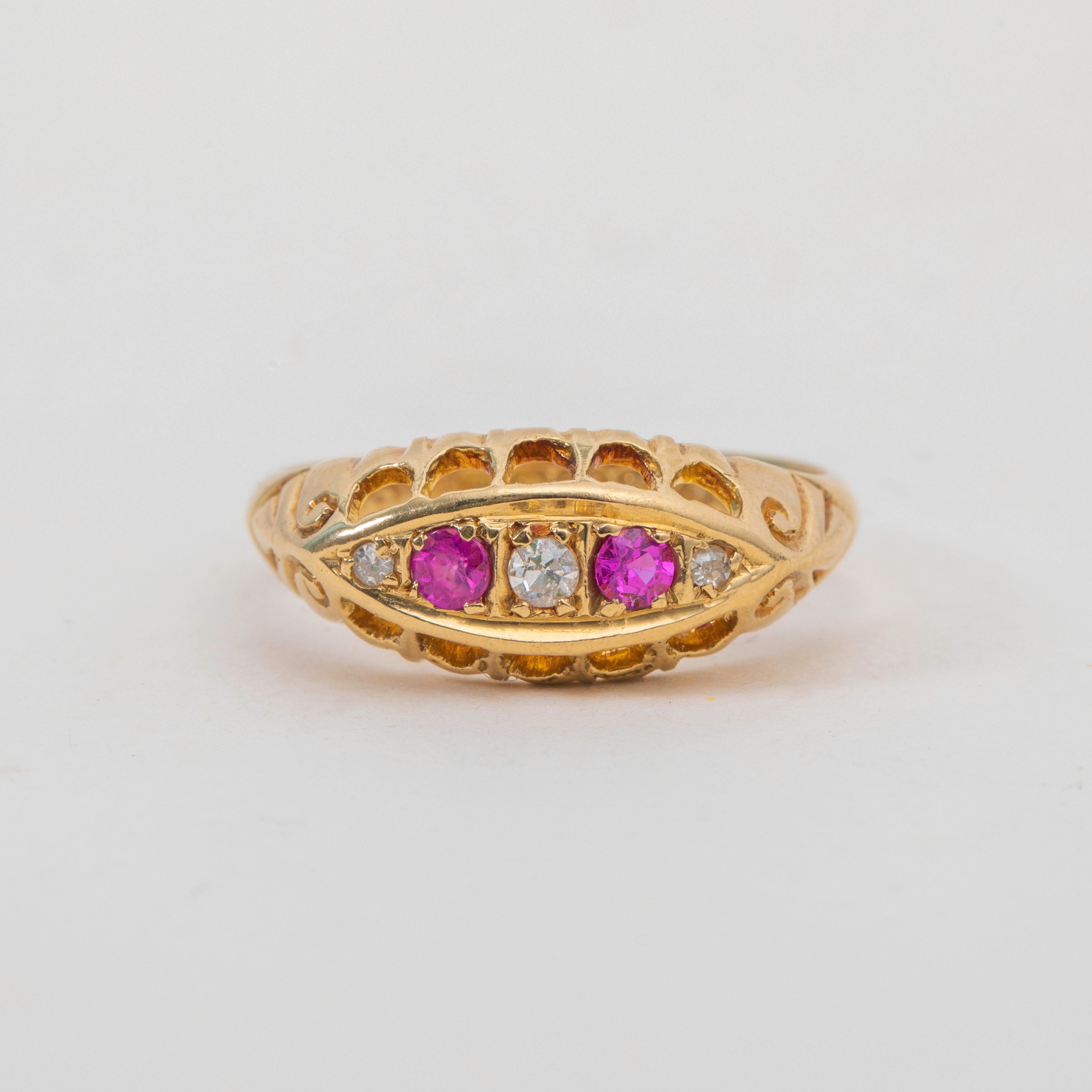 Prepare to become enchanted by this exquisite Art Deco 18ct Gold Ruby Diamond boat ring! If you have a penchant for ornate and resplendent jewels, this antique boat ring is a must for your collection. Boasting an elaborate design, this Art Deco ring displays alternating Rubies and Diamonds adorned by a curvaceous openwork gallery and swirling engraved shoulders.
