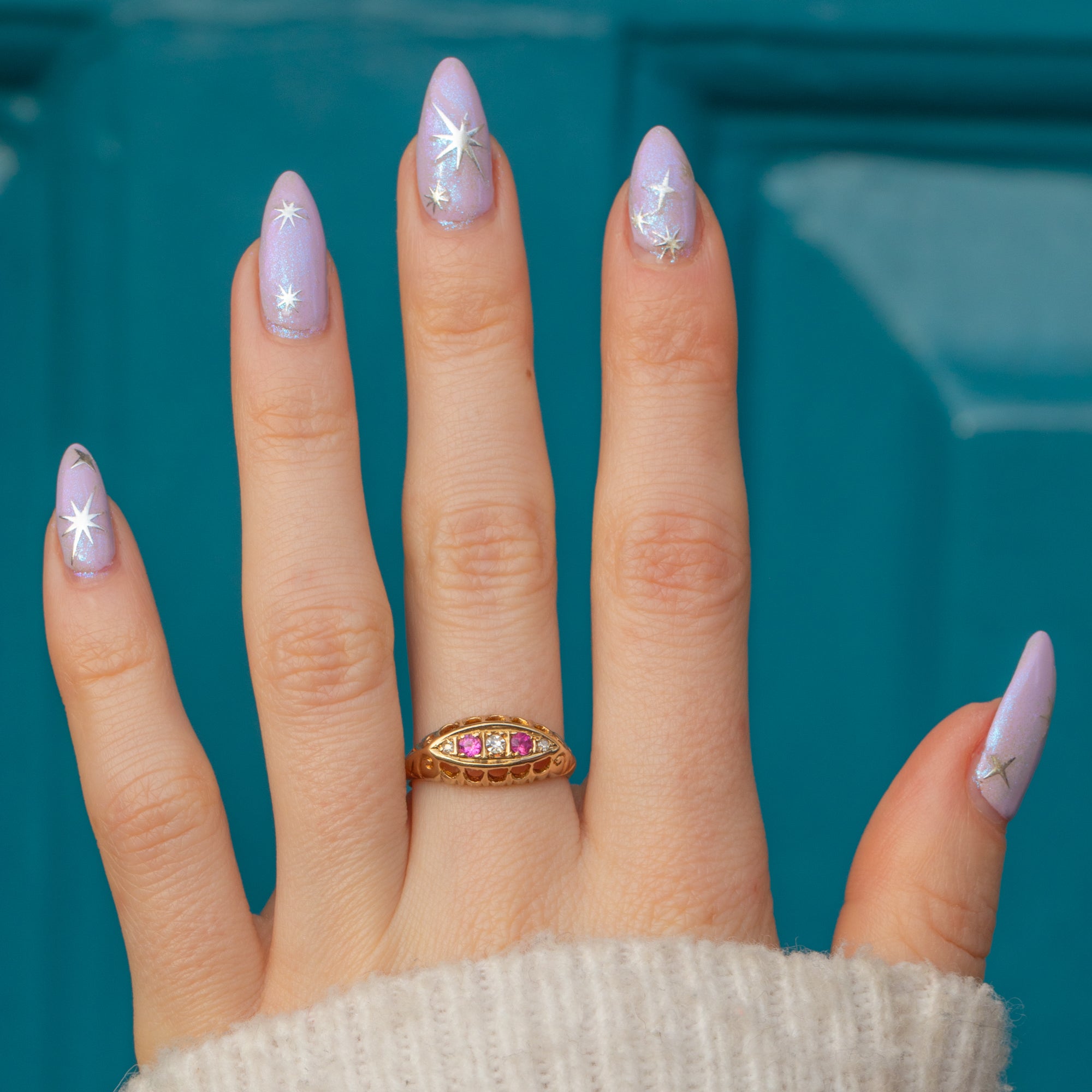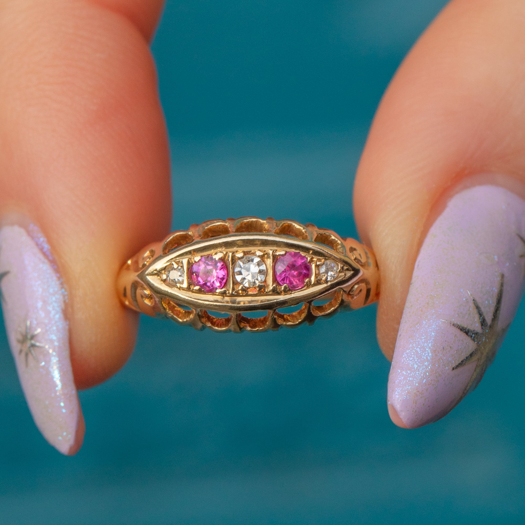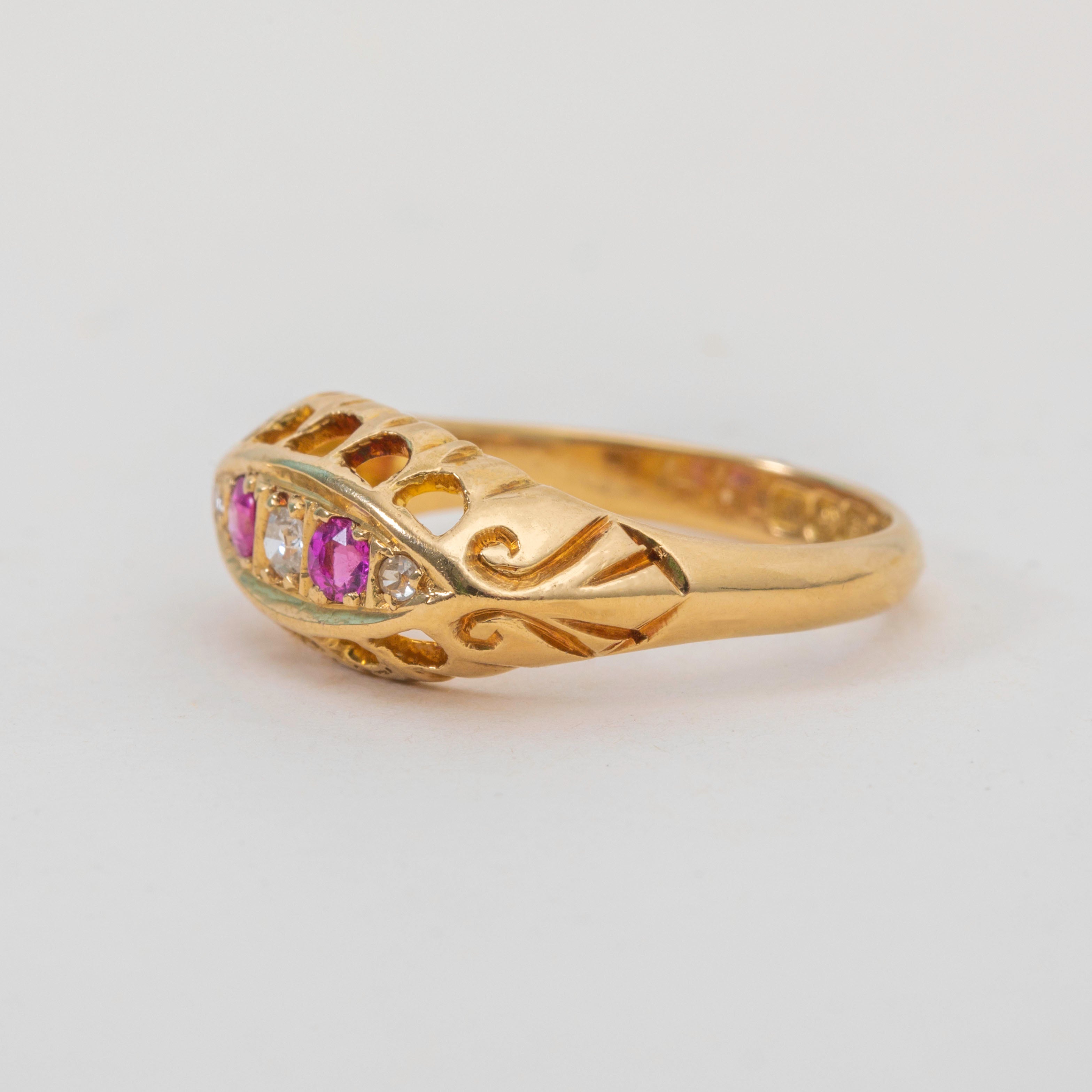 Prepare to become enchanted by this exquisite Art Deco 18ct Gold Ruby Diamond boat ring! If you have a penchant for ornate and resplendent jewels, this antique boat ring is a must for your collection. Boasting an elaborate design, this Art Deco ring displays alternating Rubies and Diamonds adorned by a curvaceous openwork gallery and swirling engraved shoulders.