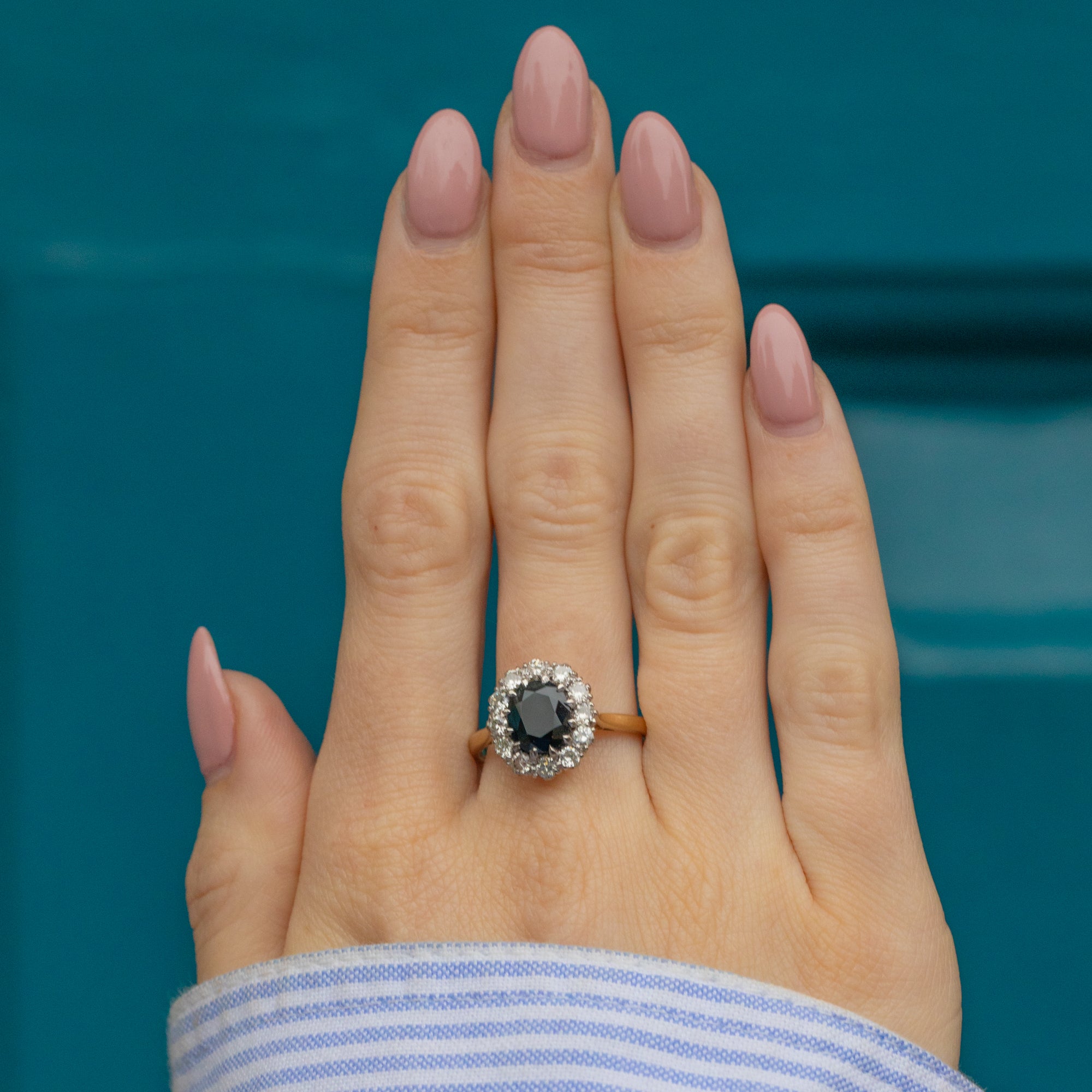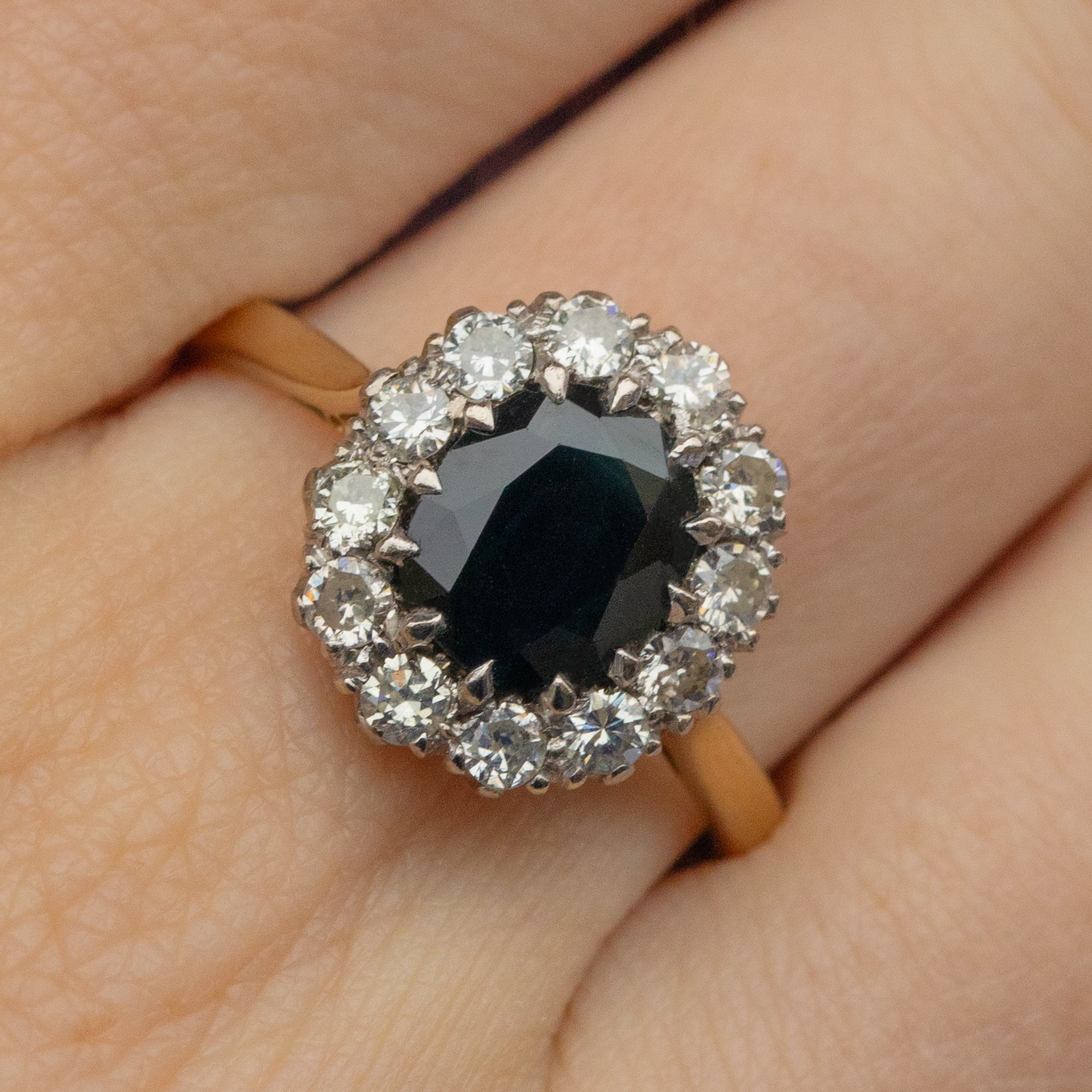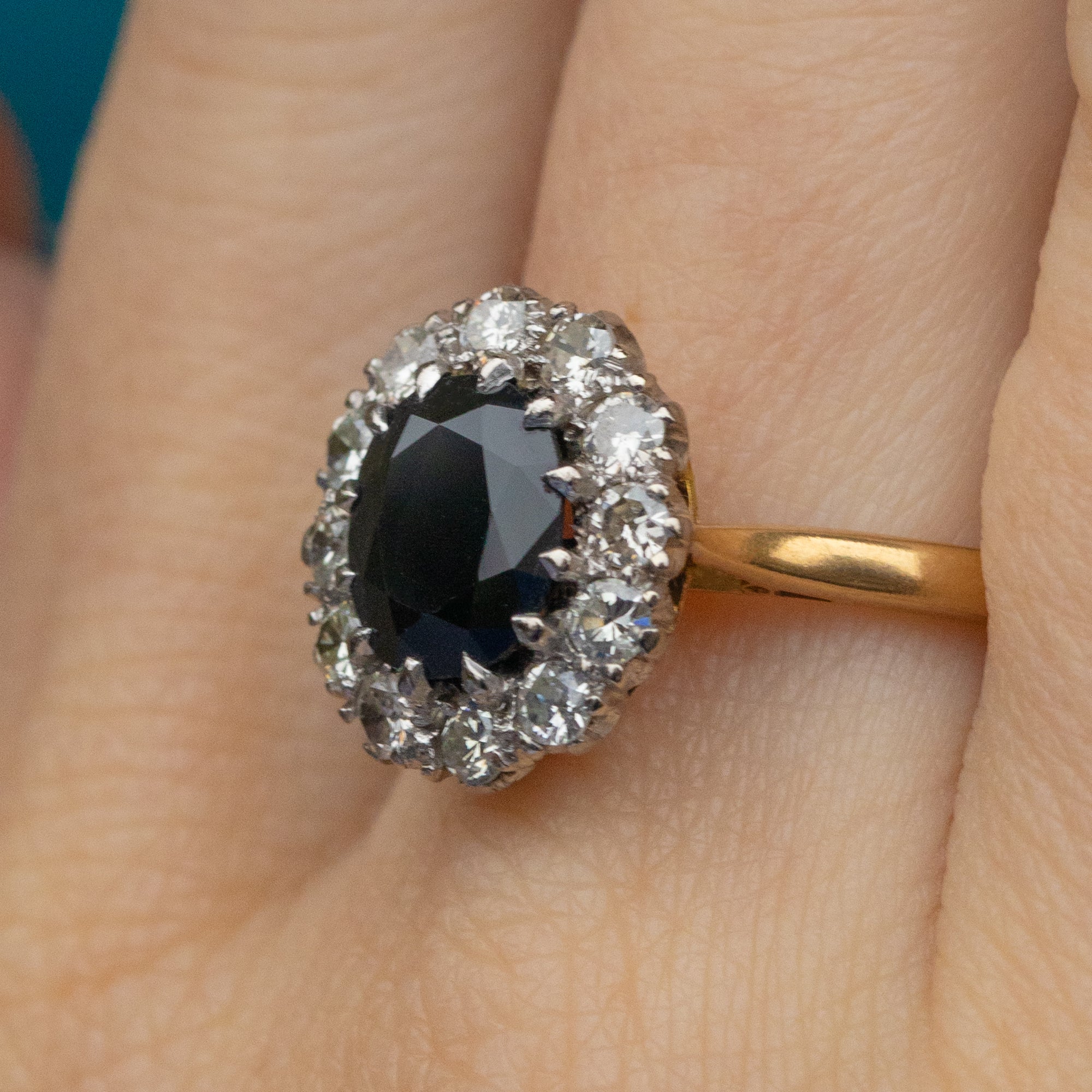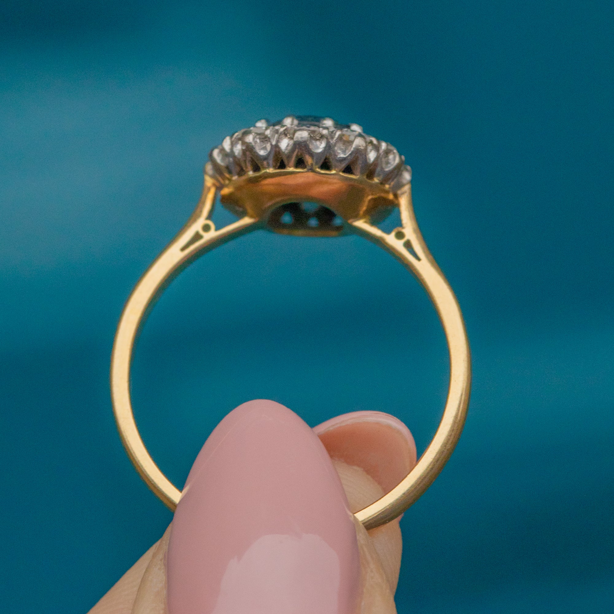 EXCELLENT. This Art Deco 18ct Gold Sapphire and Diamond cluster ring is in excellent condition. The Sapphire and surrounding Diamonds are secure in their settings, fabulously faceted and are free from chips or abrasions. Each of her claws are present and the white 18ct Gold gallery provides lovely detail around her circumference. The 18ct yellow Gold shank is well rounded and glides onto the hand a dream. She truly is is an Art Deco delight!