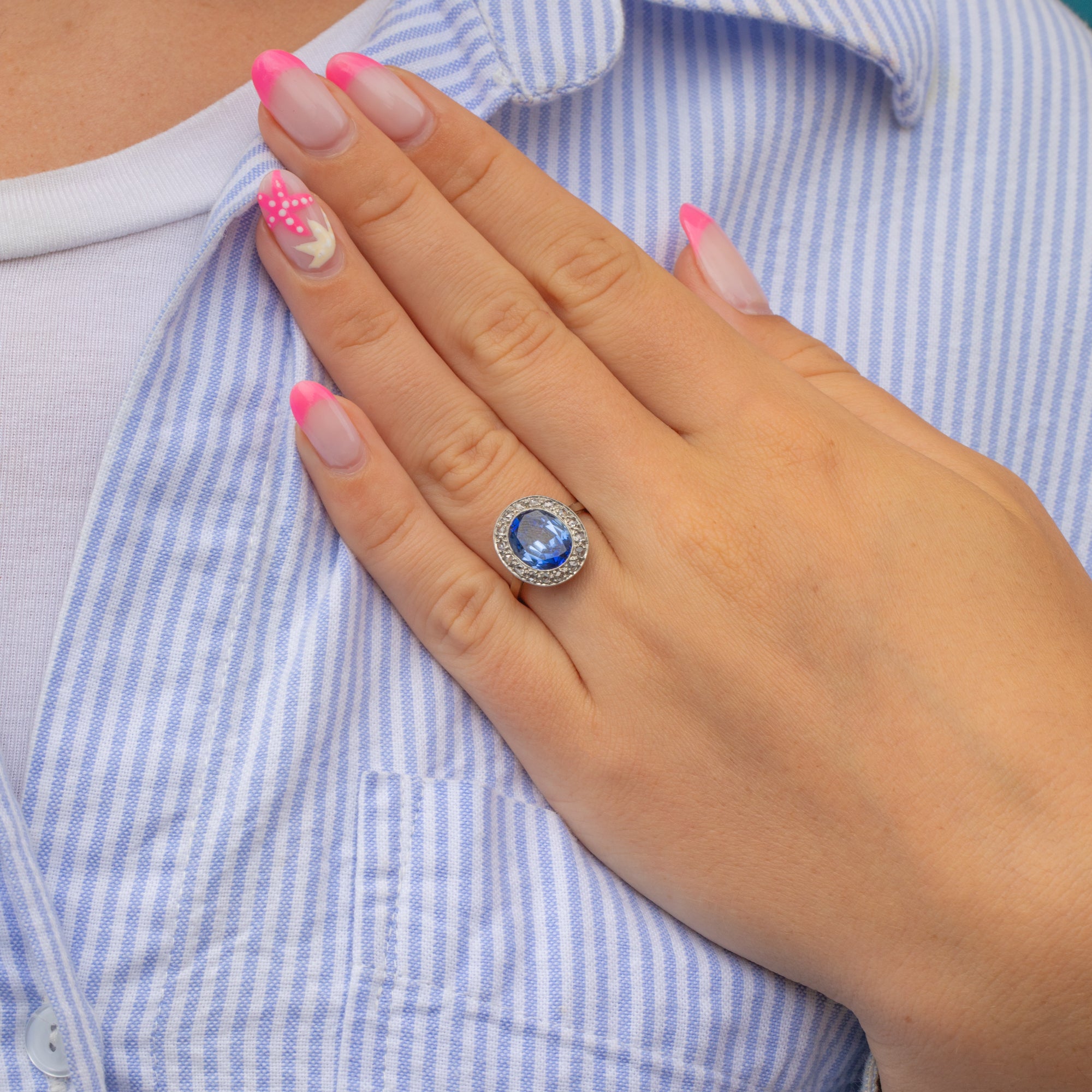 Art Deco 18ct Gold Sapphire Diamond Cluster Ring, 3.20ct Sapphire