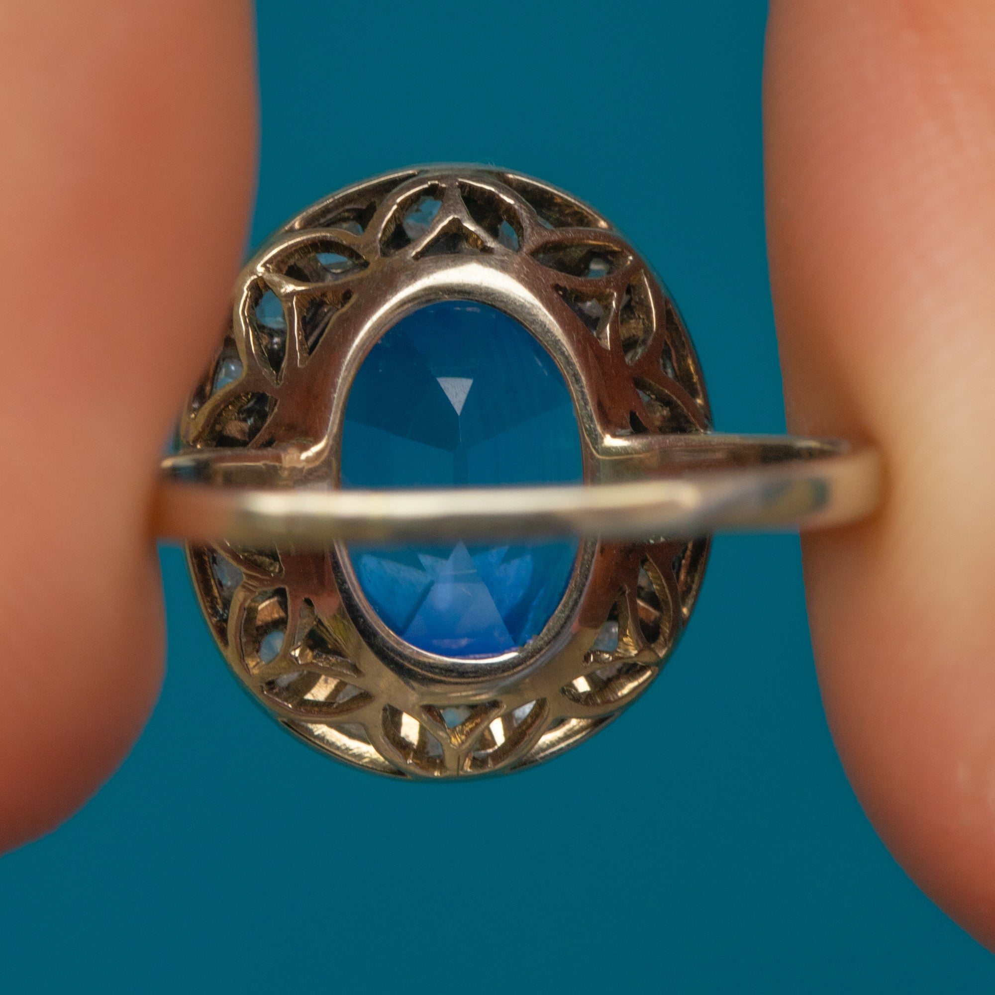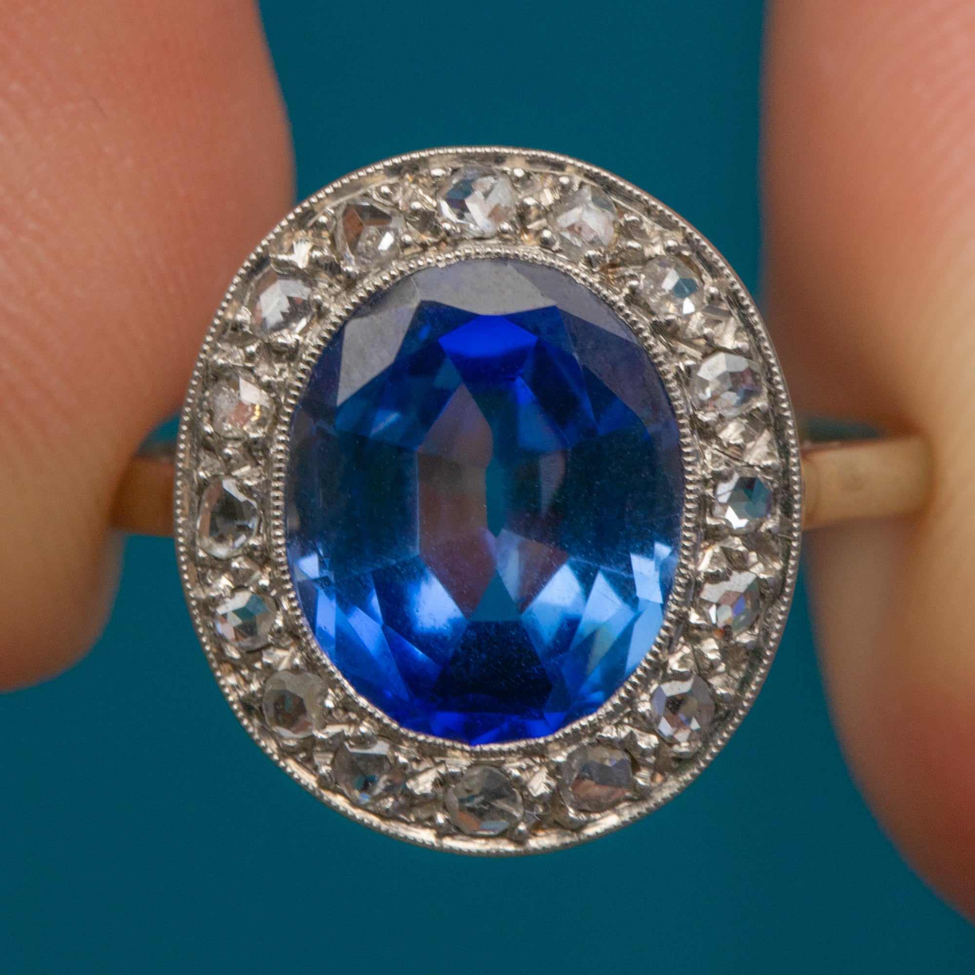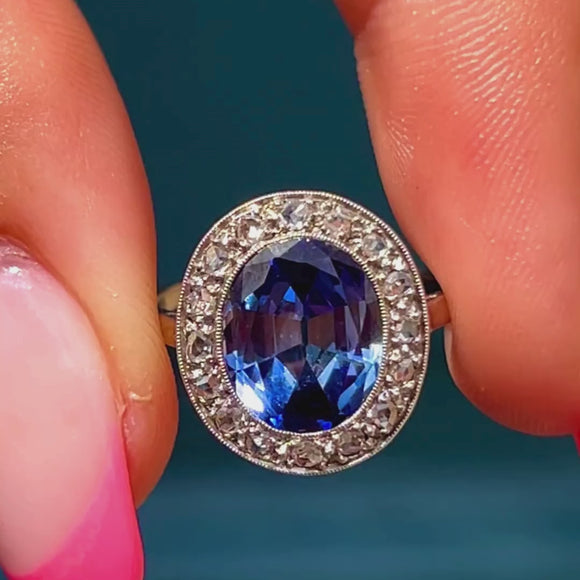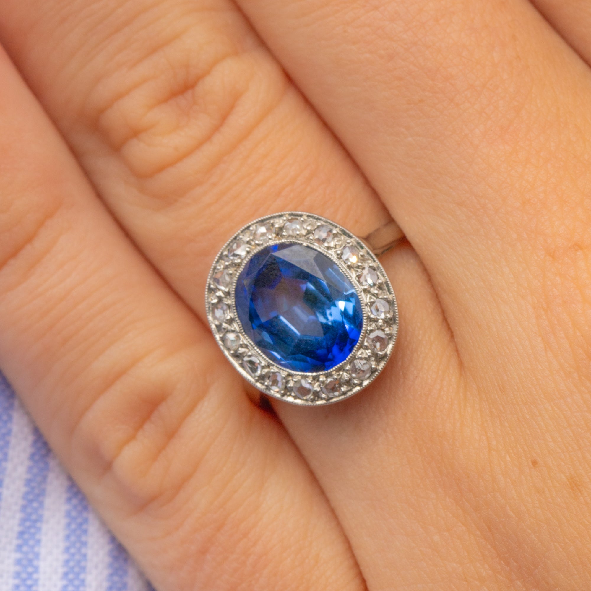 MATERIALS: Tests as 18ct White Gold, Cornflower Blue Sapphire (curved growth lines indicate early flame-fusion/ Verneuille lab-grown Sapphire), natural rose-cut Diamonds.