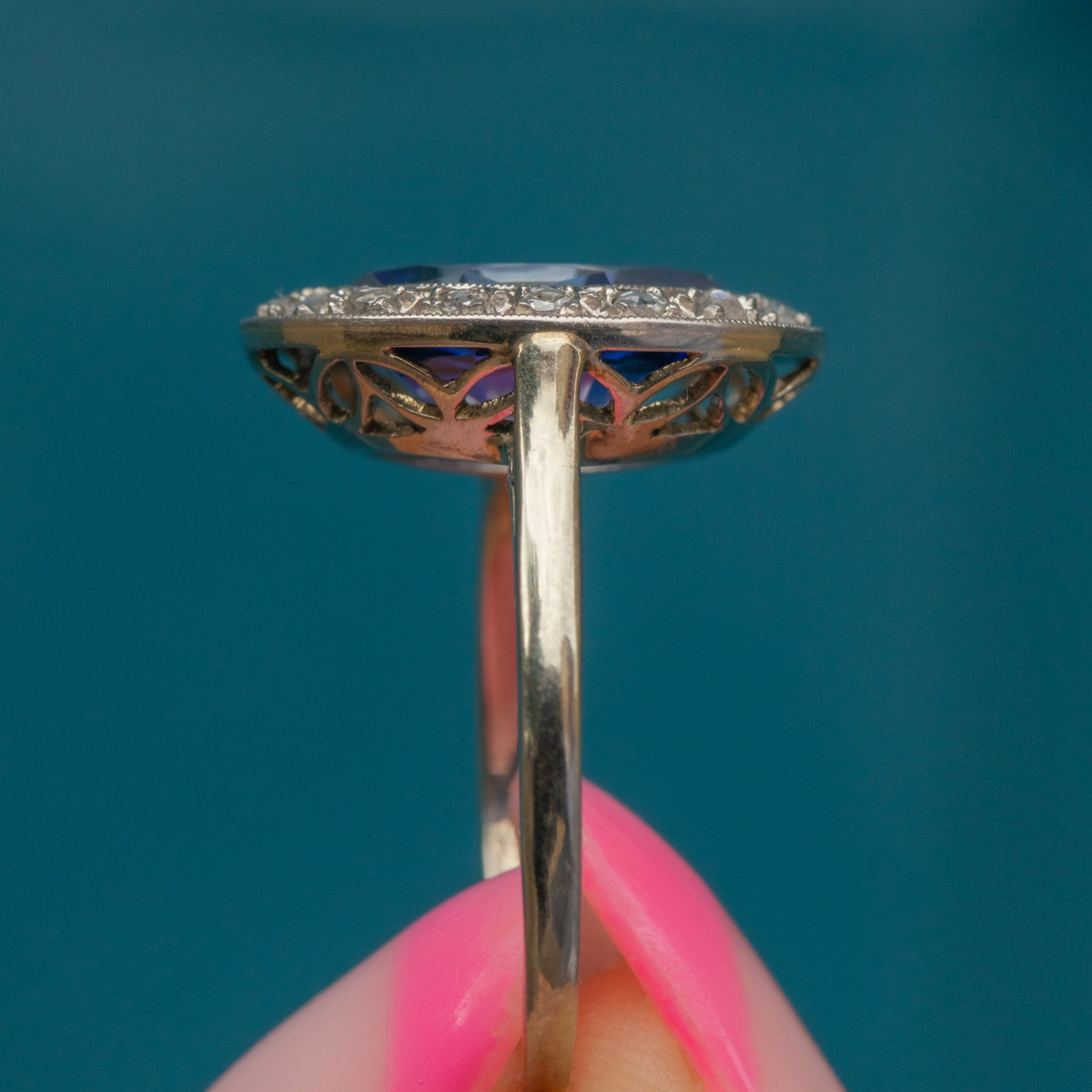 Every millimetre of this outstanding Art Deco ring has been carefully considered, with the decorative floral gallery allowing the light to beam through each hand-cut gemstone. This antique Sapphire Diamond will make quite the statement as she adorns your hand with the oval gemstone cluster providing ample finger coverage!