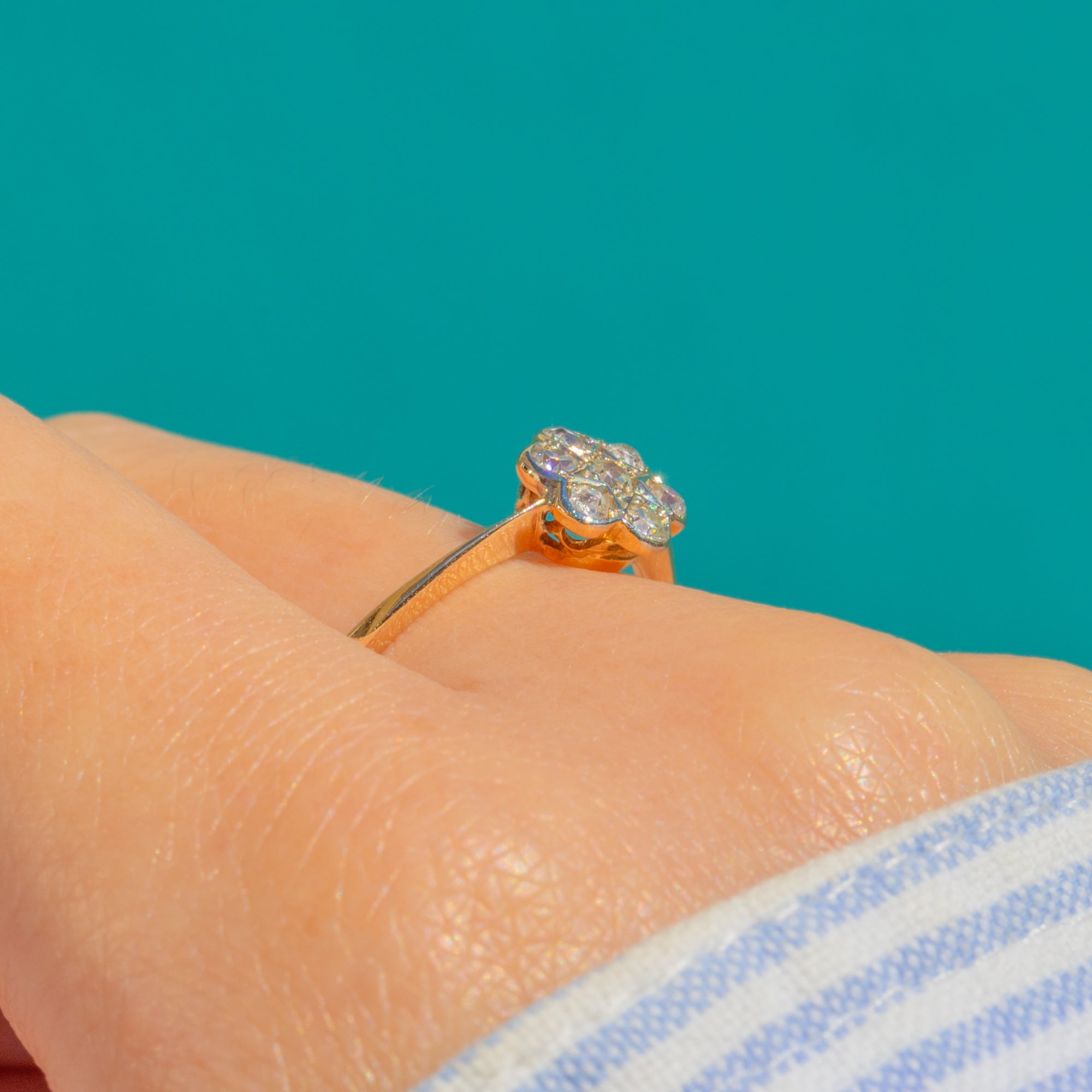 A timeless Art Deco daisy cluster ring, crafted in rich 18ct Gold and set with seven lively round Diamonds totalling approximately 0.20ct. The petite flower head sparkles with a bright, white-toned top poised above a slender yellow shank, creating a beautifully delicate two-tone look that flatters every angle.