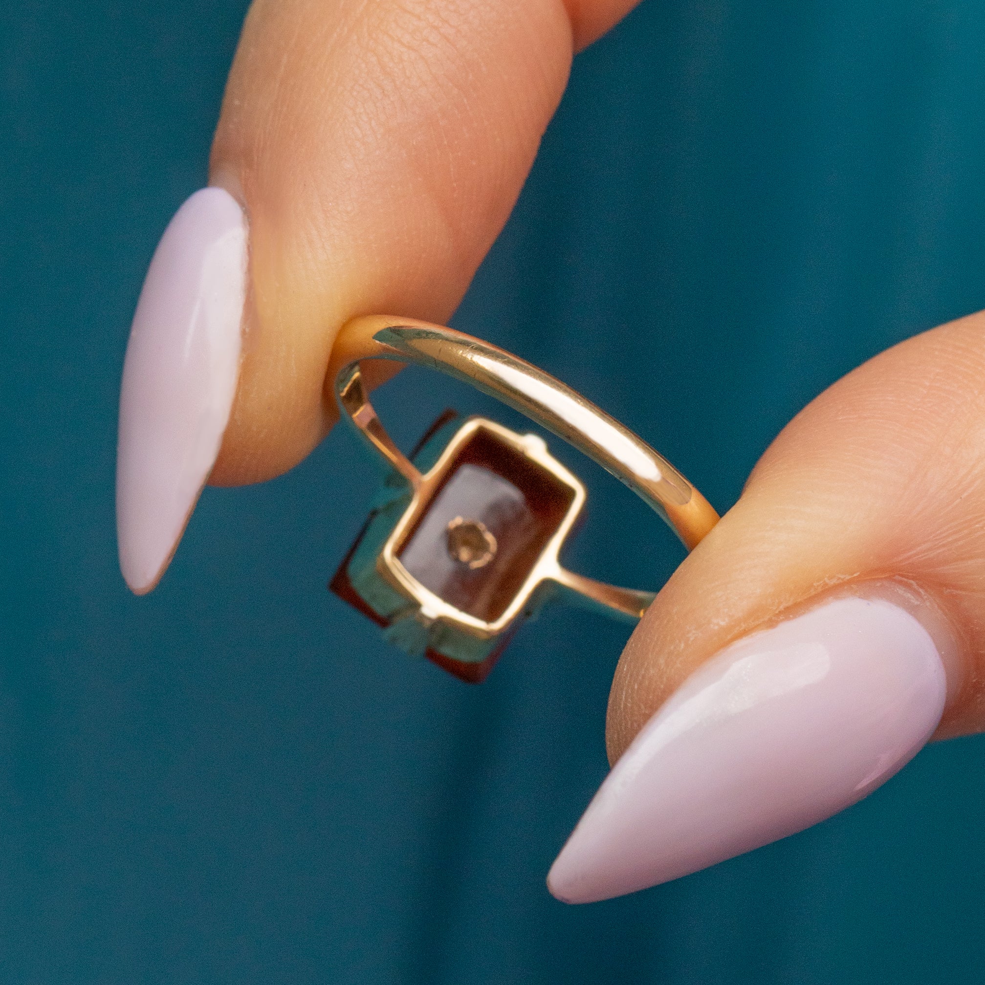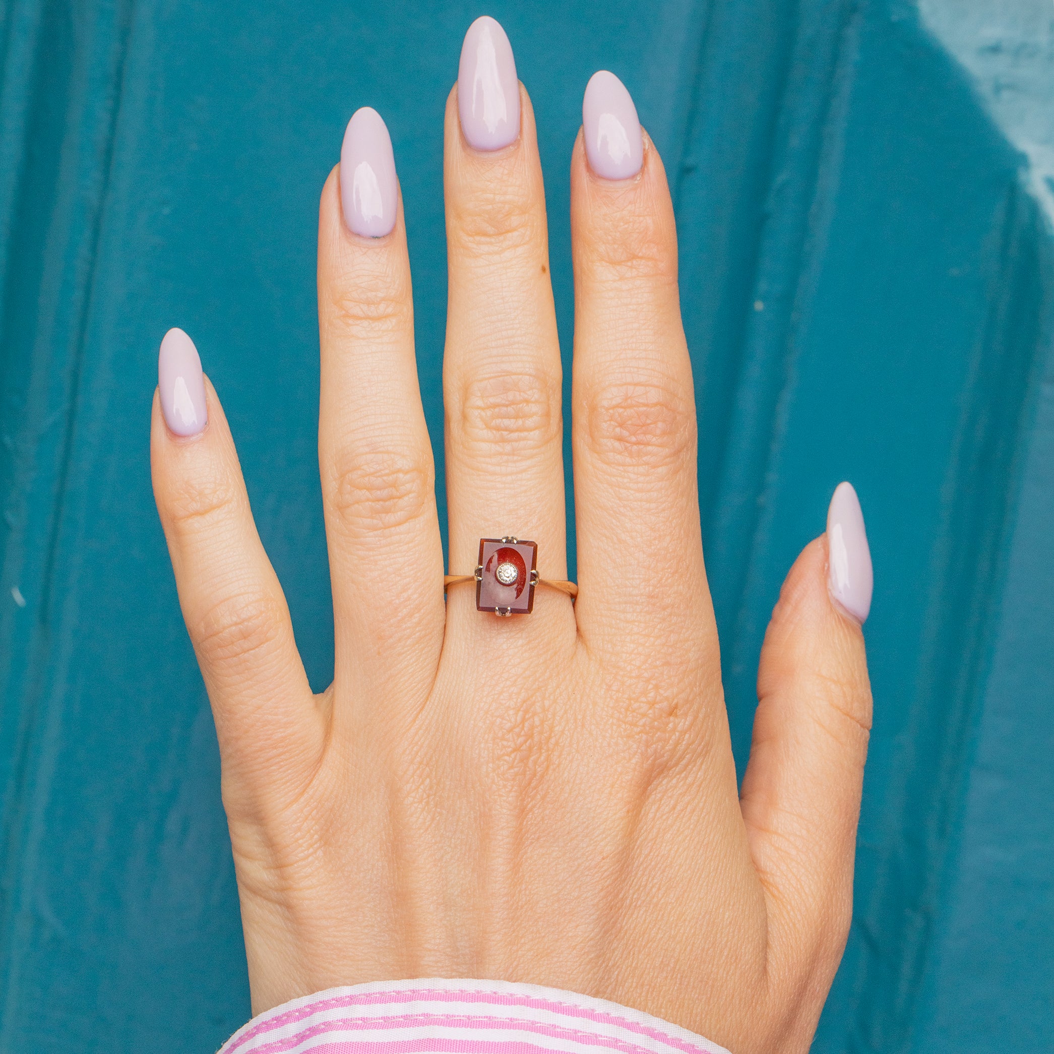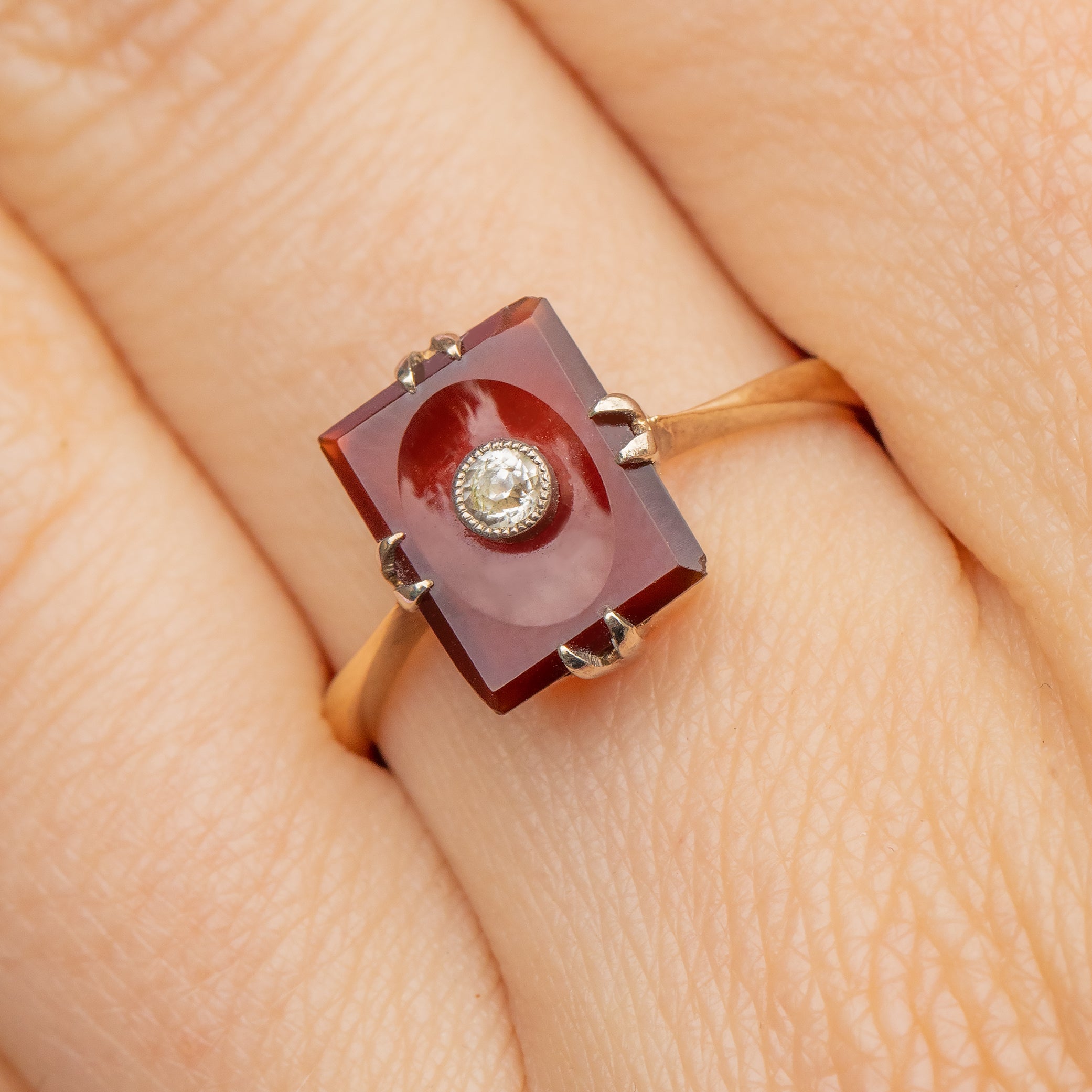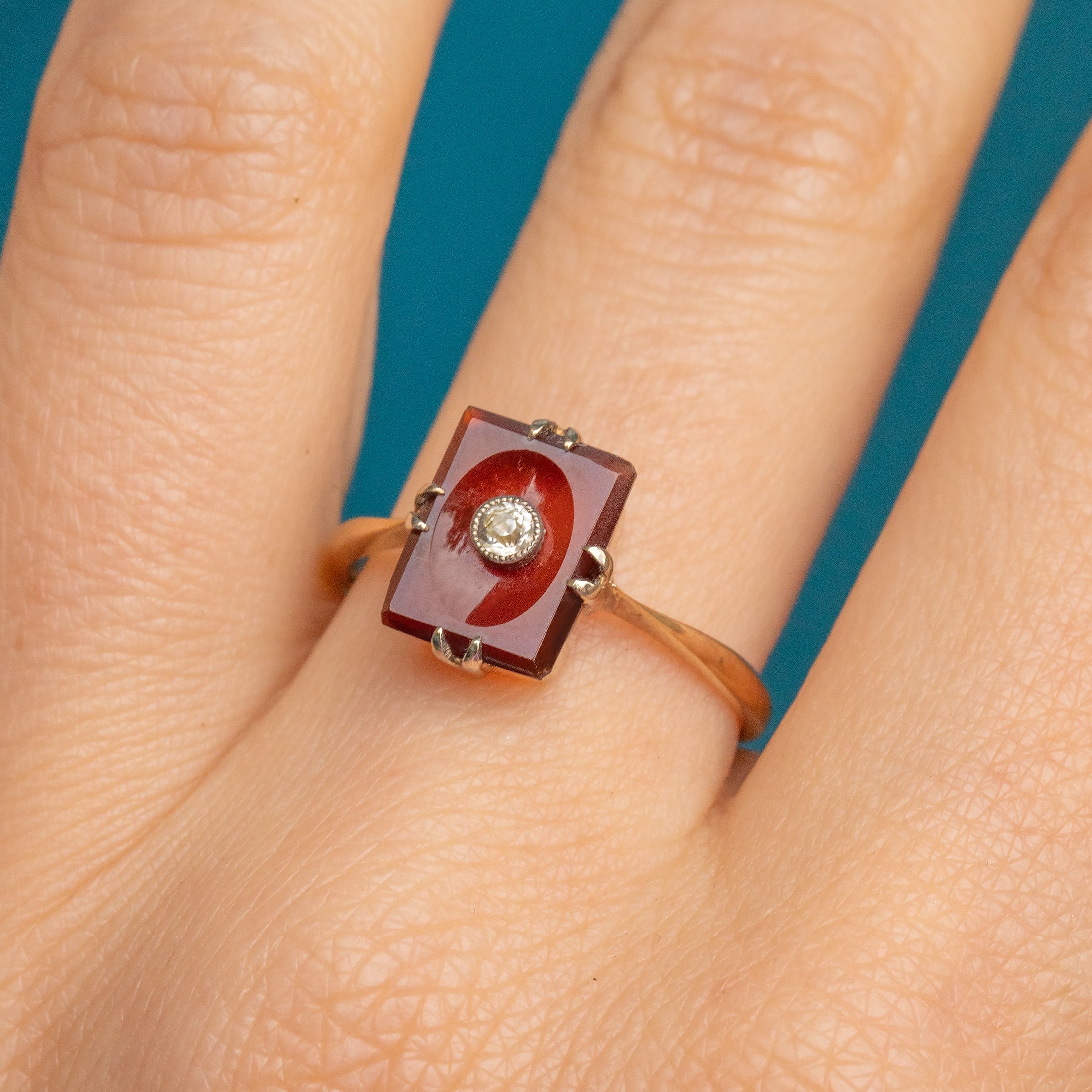 Add intrigue to your collection with this striking Art Deco 9ct Gold Agate panel ring! Unequivocally Deco in every way, the combination of Gold and Platinum with the unique design of this ring is what makes her so desirable.