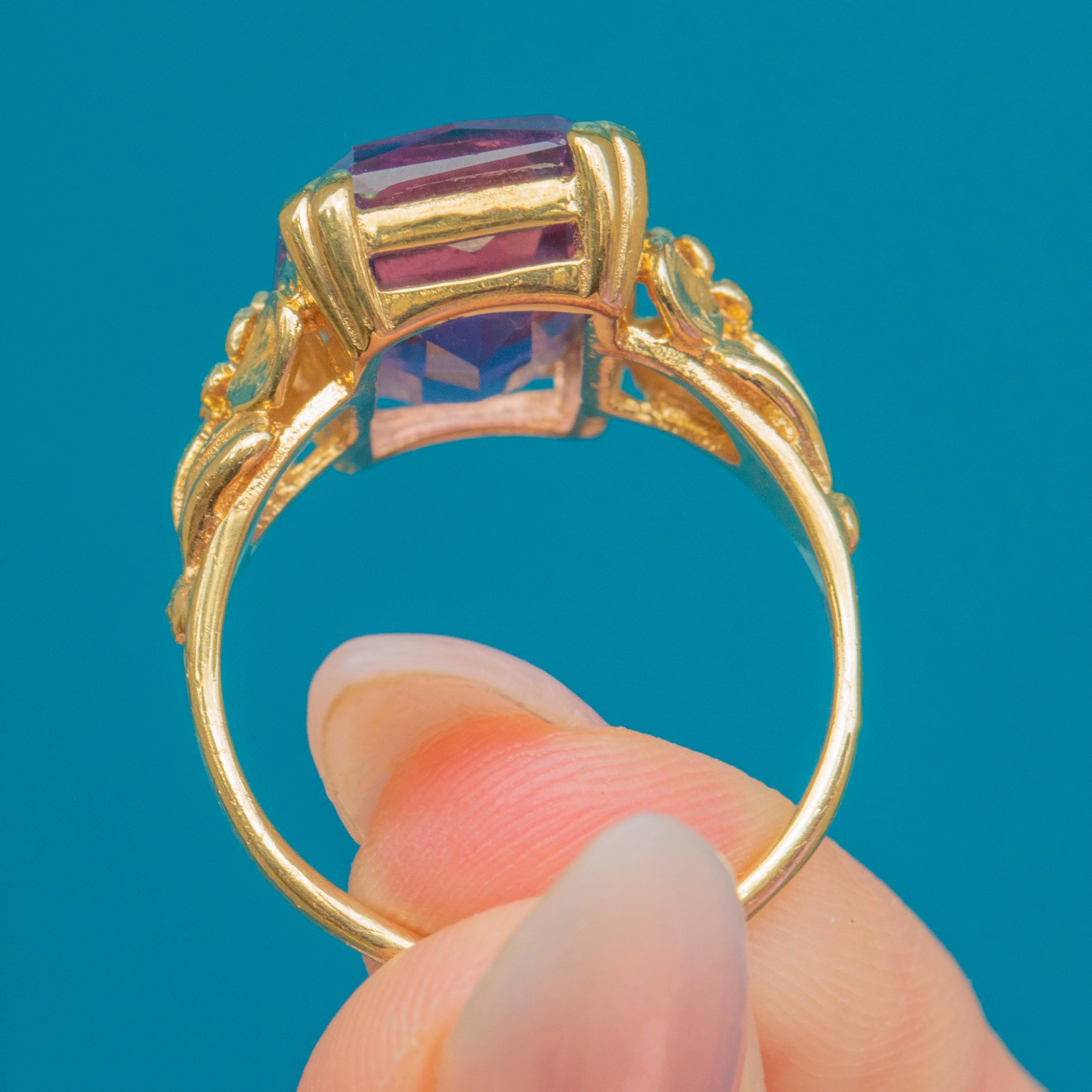 VERY GOOD: The Amethyst is in excellent condition, with no noticeable chips or abrasions and crisp facets that sparkle beautifully. The Gold setting and floral shoulders are in strong condition, with only light surface wear. The back of the band shows some thinning commensurate with age but remains stable and wearable.