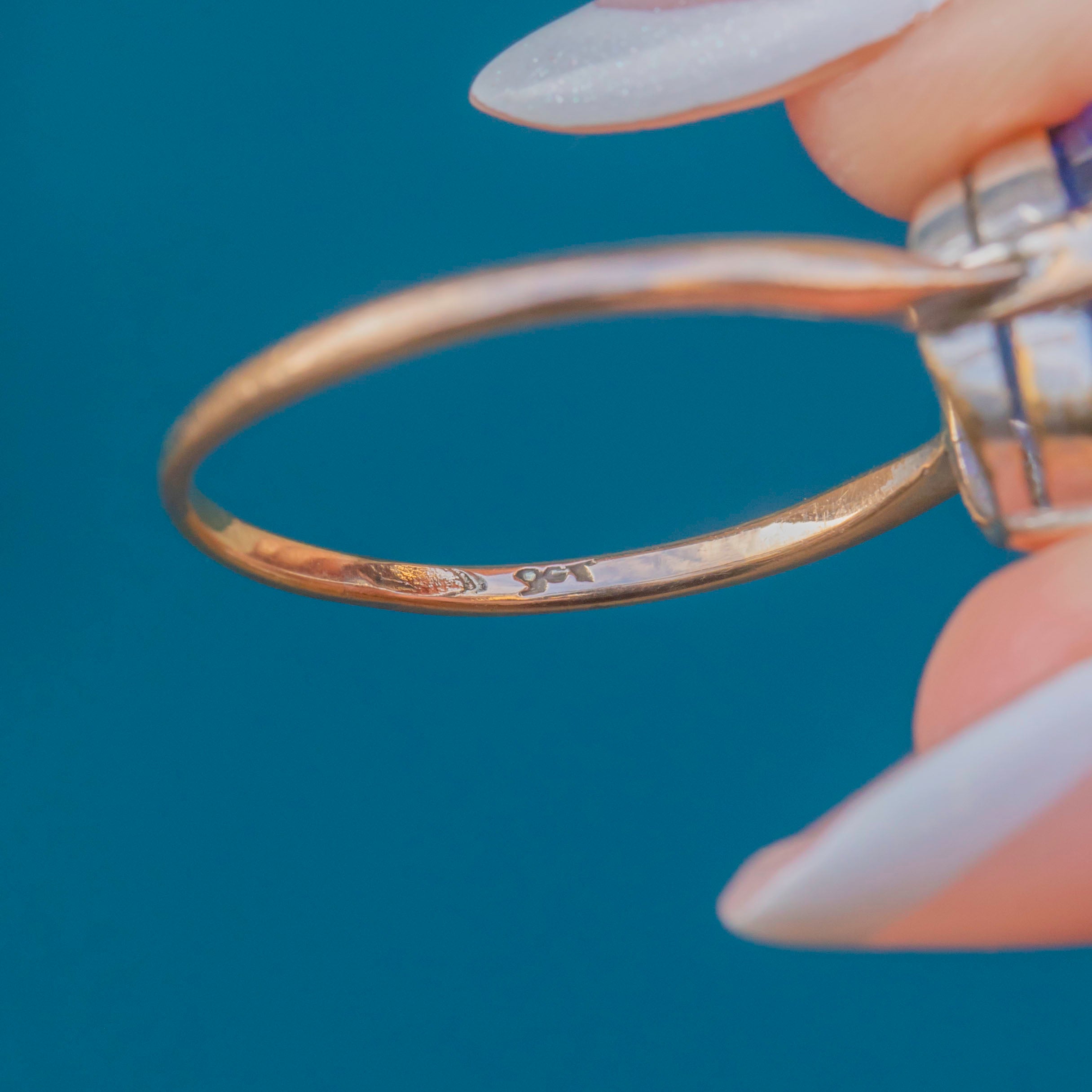 Sitting front and centre is a radiant royal blue Synthetic Sapphire, boasting 4.70 carats, and faceted wonderfully, revealing softer blue hues as she moves in the light. She sits on a glossy 9ct Gold band, complete with white Gold claw settings, each harmonising with the rich tones of the Sapphire.