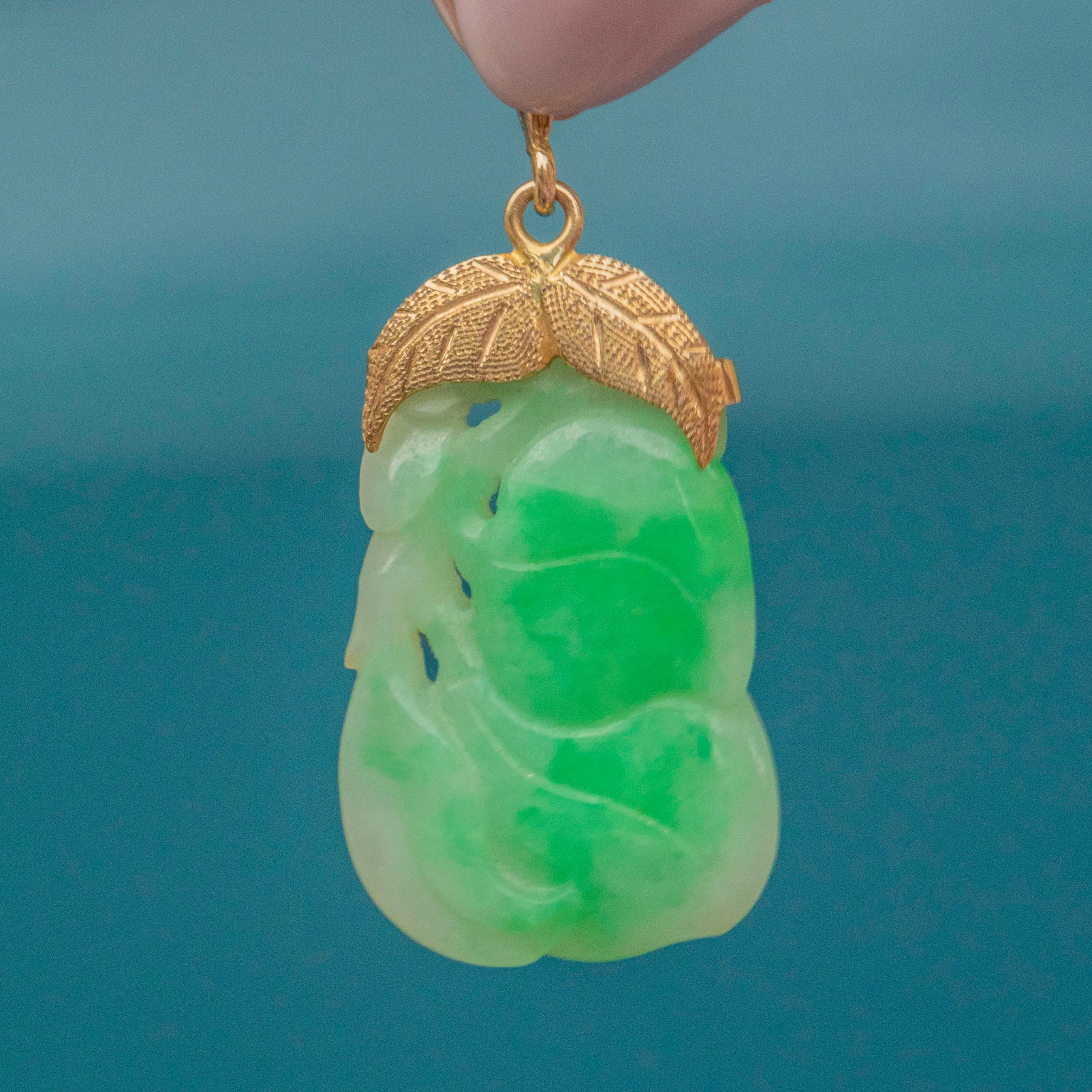 Boasting a unique antique charm, this stunning Art Deco 9ct Gold carved Jade pendant feaurues a beautifully sculpted Jade stone displayed within ornate Gold settings. The gemstone displays a mix of serene green shades, evoking images of fresh mint and sea spray, with intricate carvings resembling green growing leaves etched onto her surface.