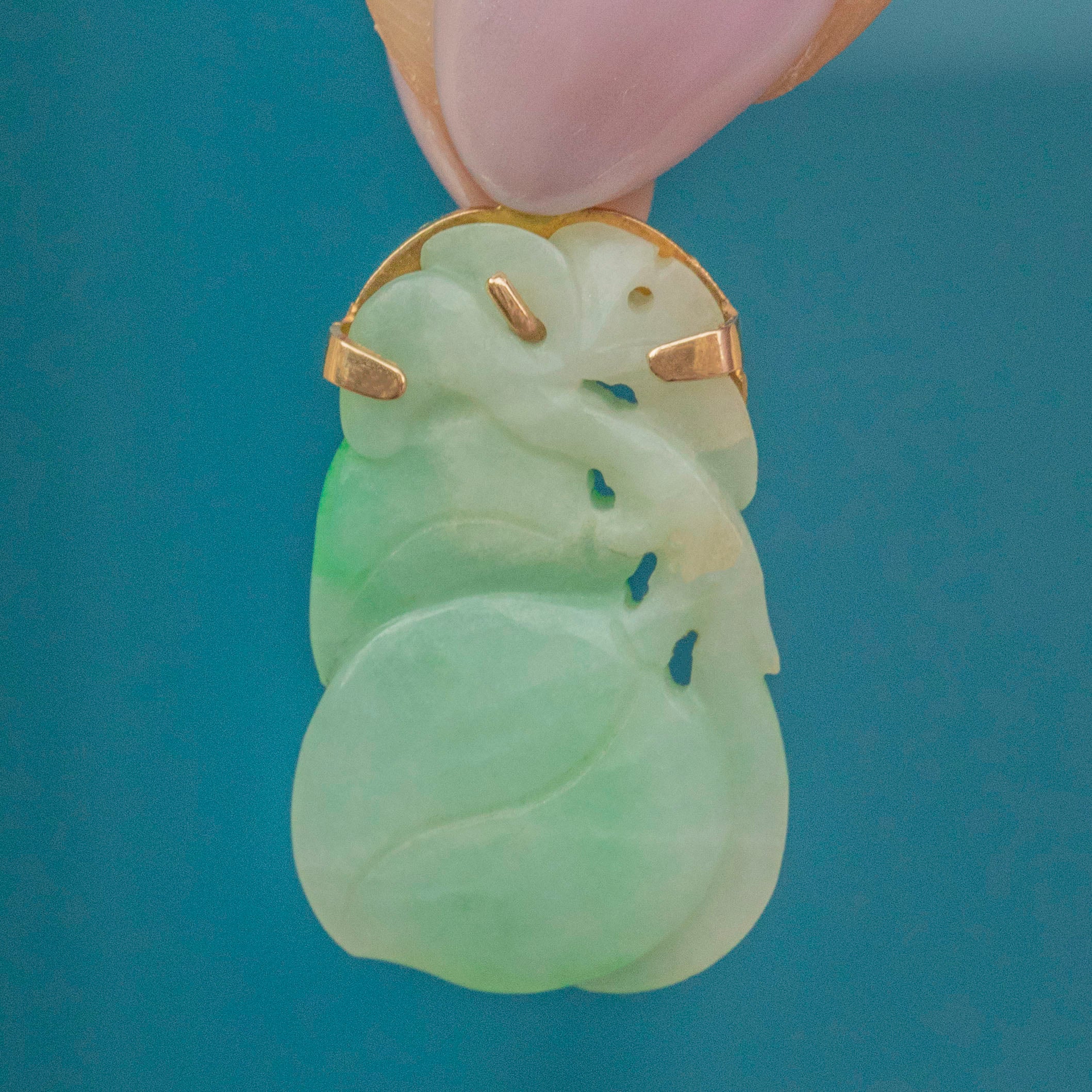 EXCELLENT. With very little to report, this Art Deco 9ct Gold carved Jade pendant is in excellent condition! The Jade is securely held in her 9ct Gold settings, with no visible damage. Her lovely array of soft green tones makes it a versatile piece that will compliment any outfit beautifully.