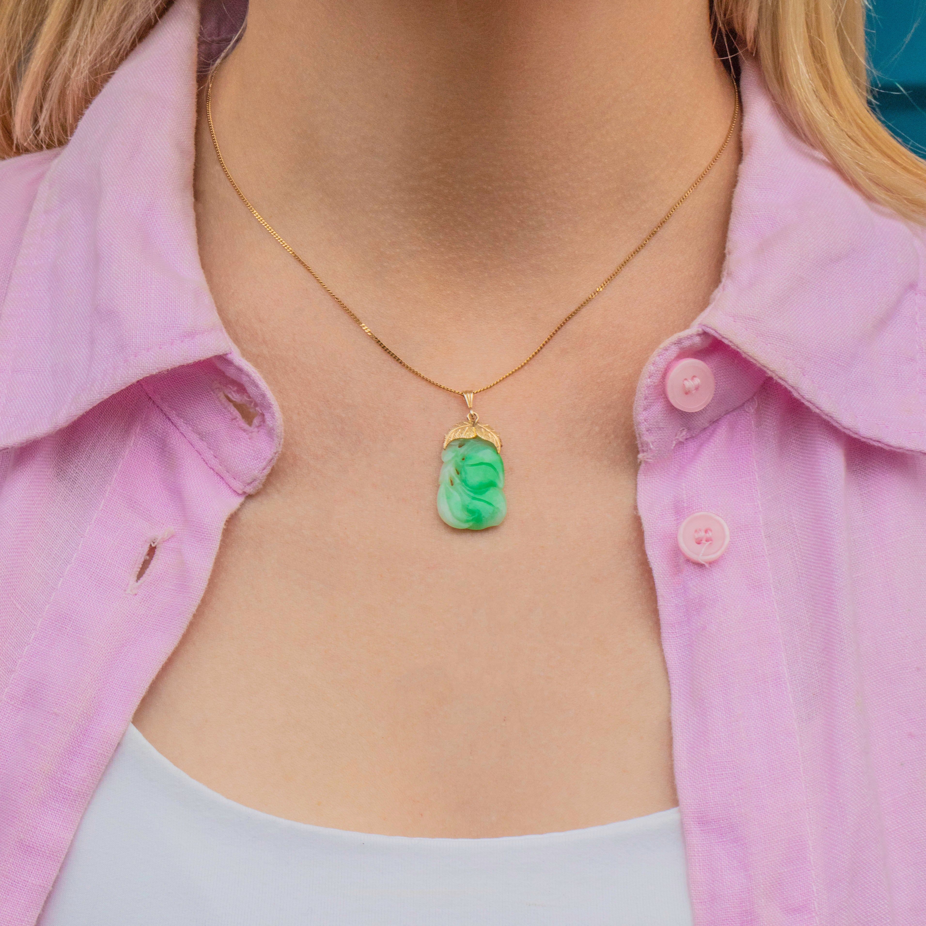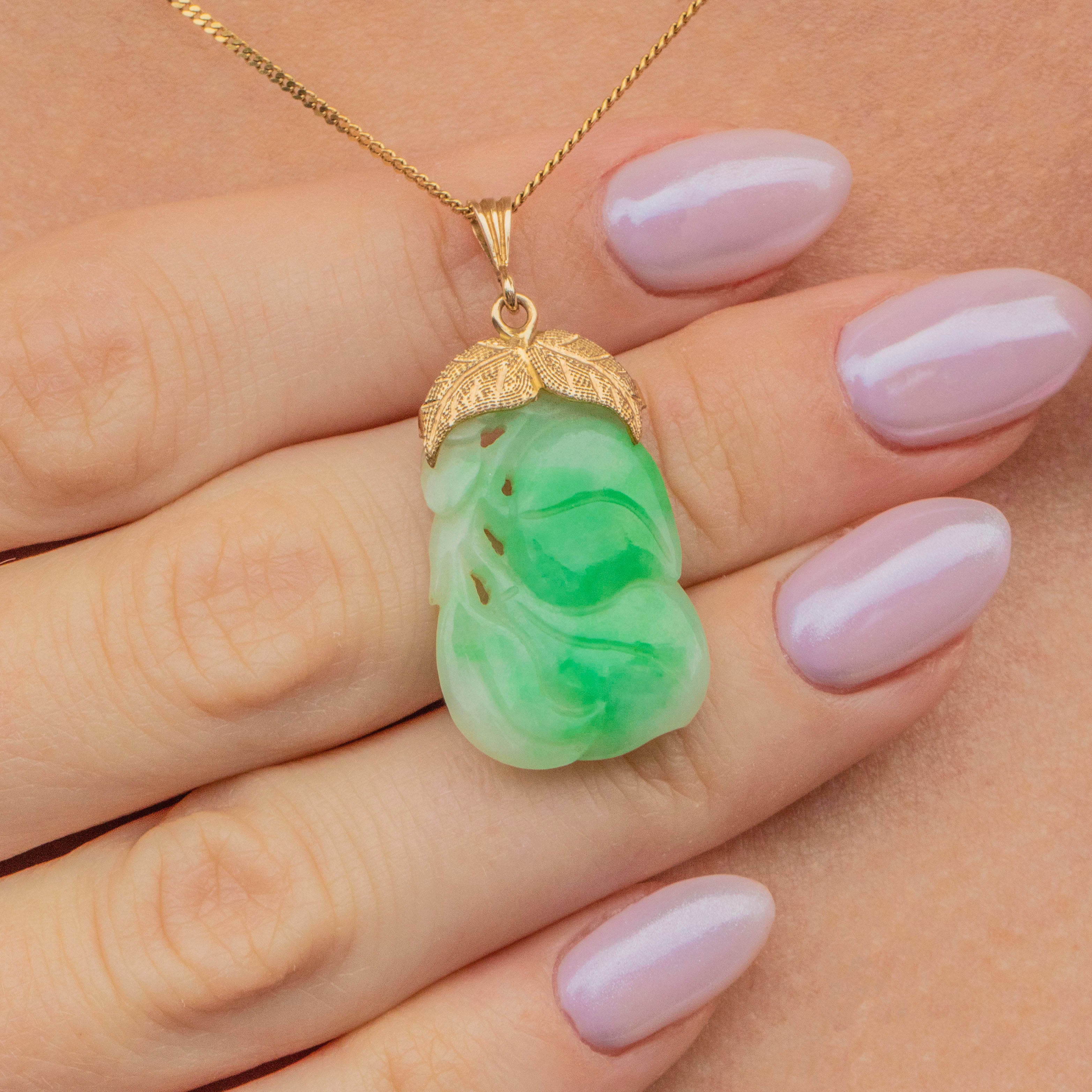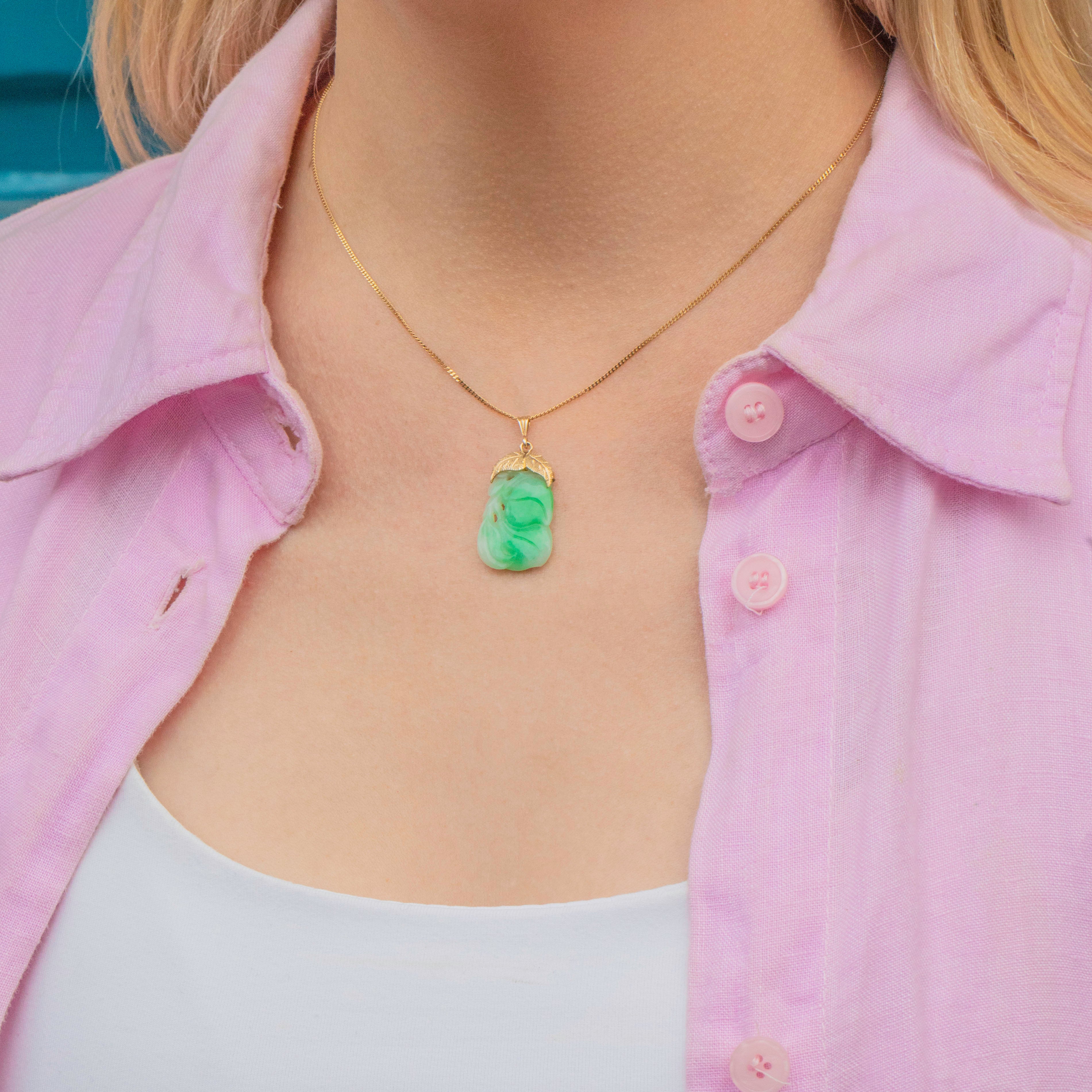A 9ct Gold bale, with delicately engraved leaves, holds the Jade, adding elegant and luxurious details to the piece. Ideal for making a stylish statement, this Art Deco pendant is perfect for adding elegance and charm to any attire!