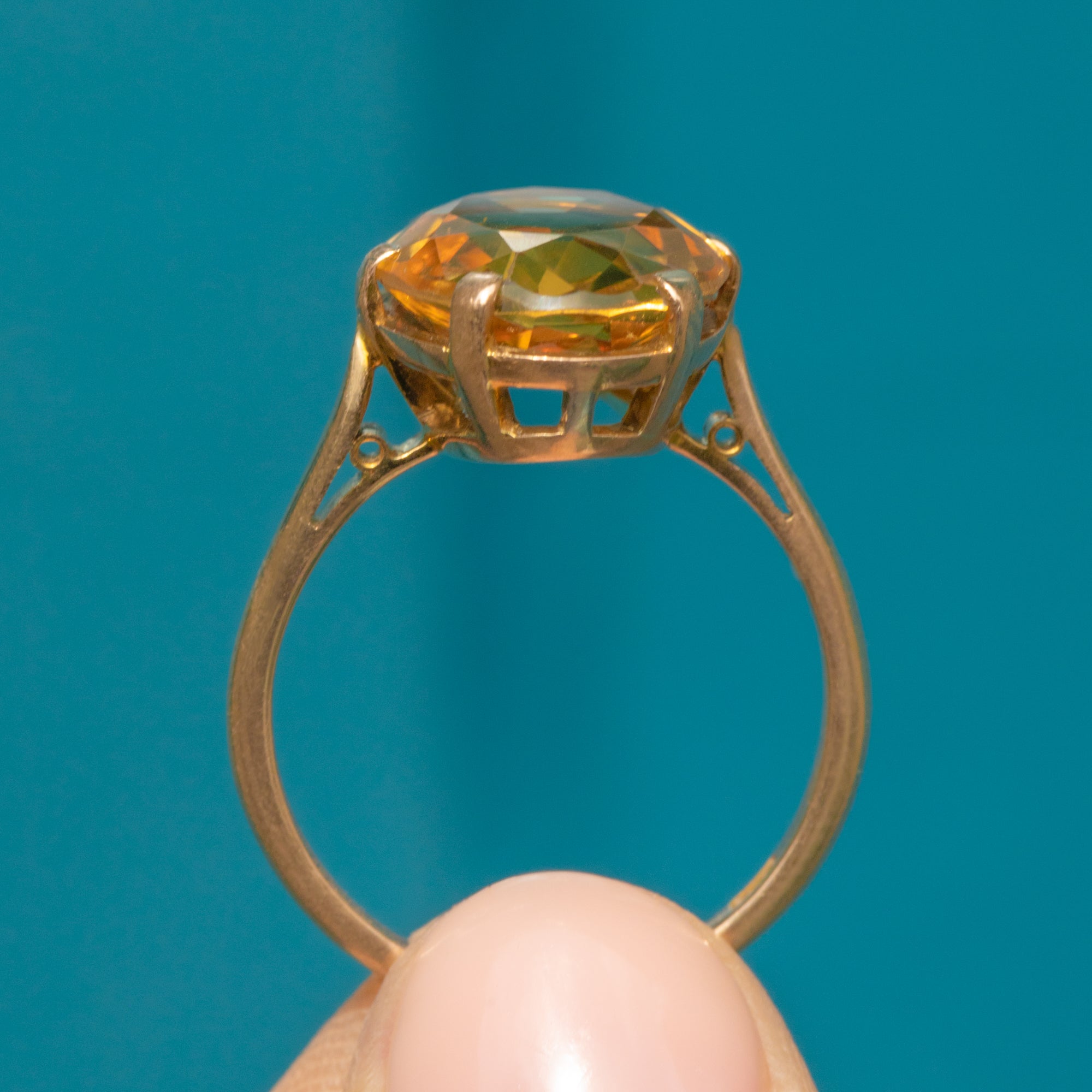 Akin to a pool of honey, this Art Deco 9ct Gold Citrine cocktail ring will bring vibrance to your hand. This fabulously faceted 3.40ct Citrine is designed to provide an abundance of sparkle, allowing the heartwarming hues to dance from facet to facet.