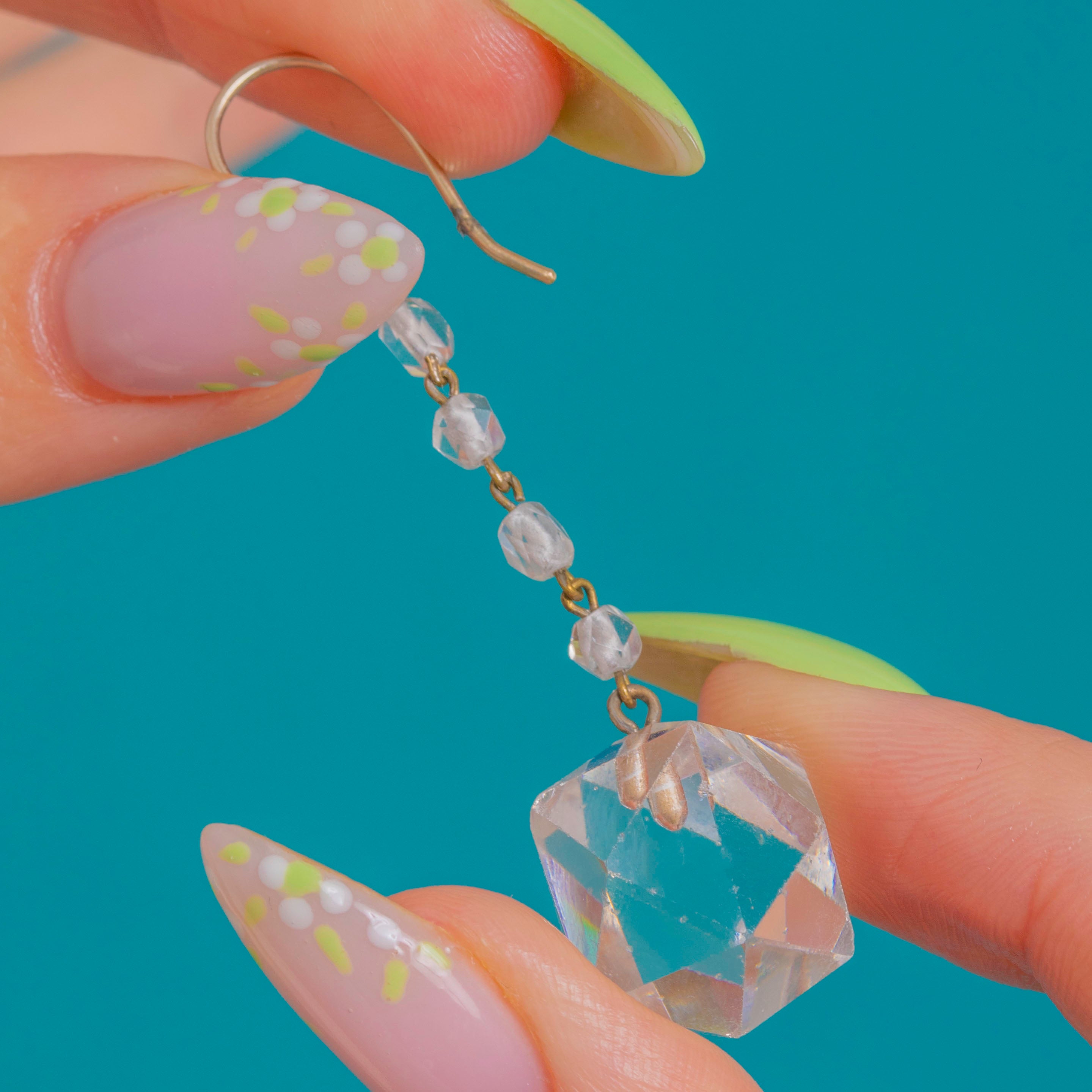 VERY GOOD: The Rock Crystals are bright with minor nicks and light facet abrasions visible under close inspection, consistent with age. The metal fittings show light surface wear and a gentle patina, with all links and hooks secure and well-aligned. No signs of replacement components; overall well cared for and ready to wear.