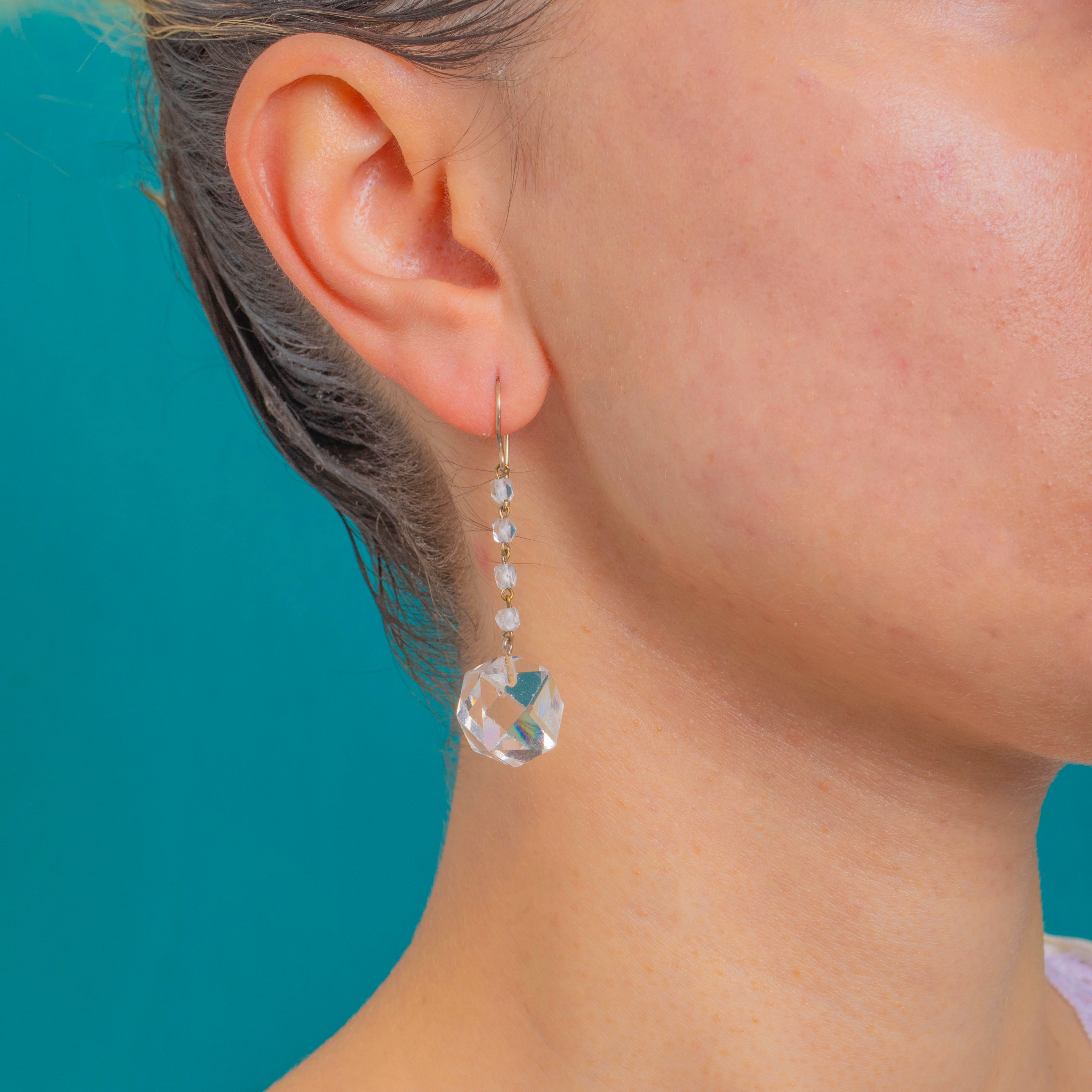 These refined Art Deco Rock Crystal drop earrings catch the light with every move. A delicate line of faceted Rock Crystal beads leads the eye to a bold, multi-faceted Rock Crystal drop, creating that signature Deco play of geometry and sparkle. The articulated construction gives beautiful movement and shimmer.