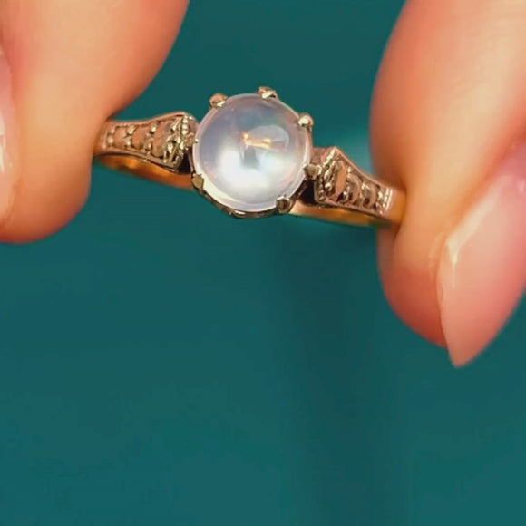 This Art Deco 9ct Gold Moonstone solitaire ring is such a treat! Her plump Moonstone cabochon takes centre stage, nestled within enchanting shoulders akin to illusion set Diamonds.