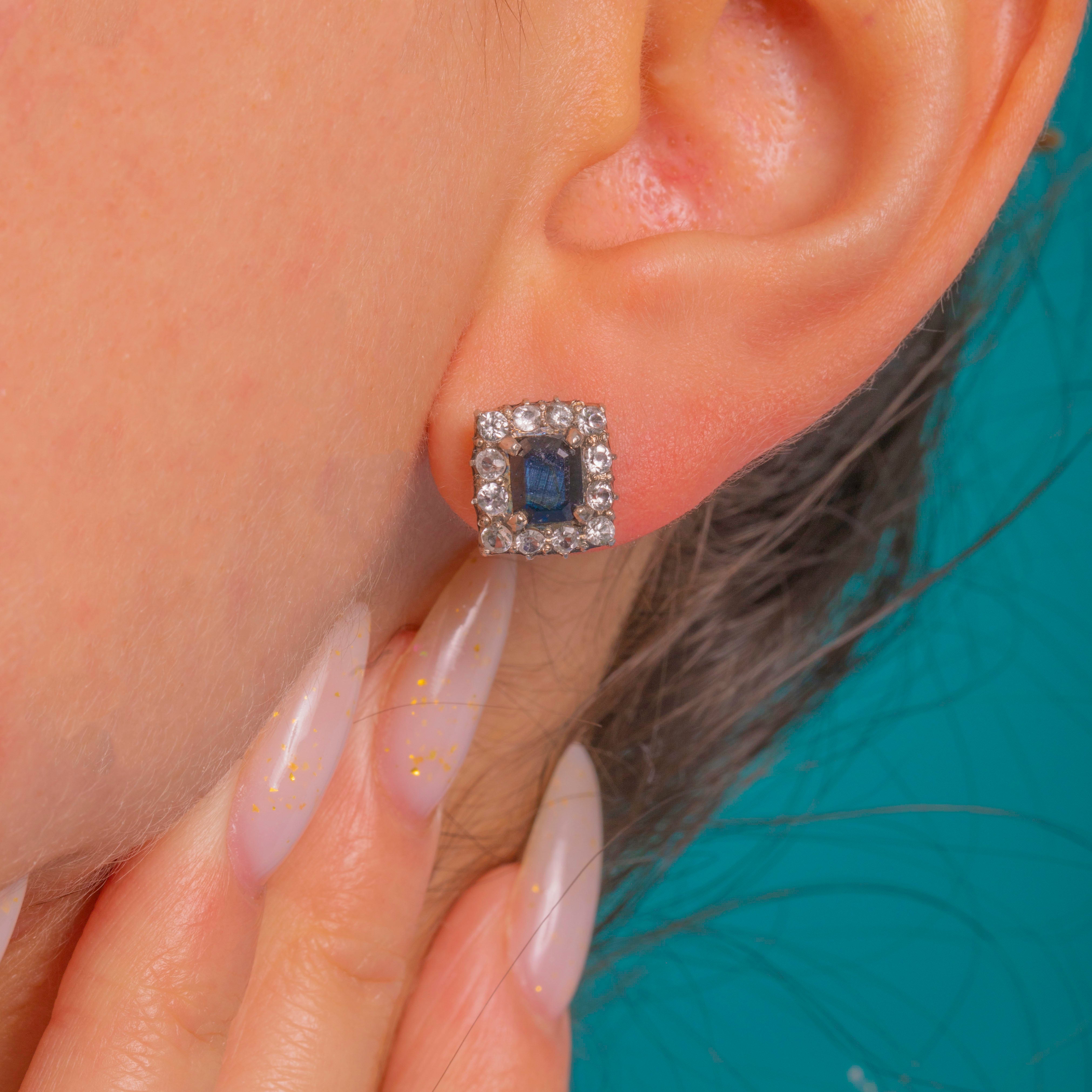 Elegant and architectural, these square halo stud earrings channel a chic Deco mood with crisp geometry and a luminous two‑tone palette. Each earring centres an emerald‑cut Natural Blue Sapphire in a white‑topped Sterling Silver setting, framed by a scintillating halo of White Sapphires for that perfect hit of sparkle against rich 9ct Gold. The step‑cut centres bring inky, midnight depth, beautifully contrasted by the bright, icy halo.