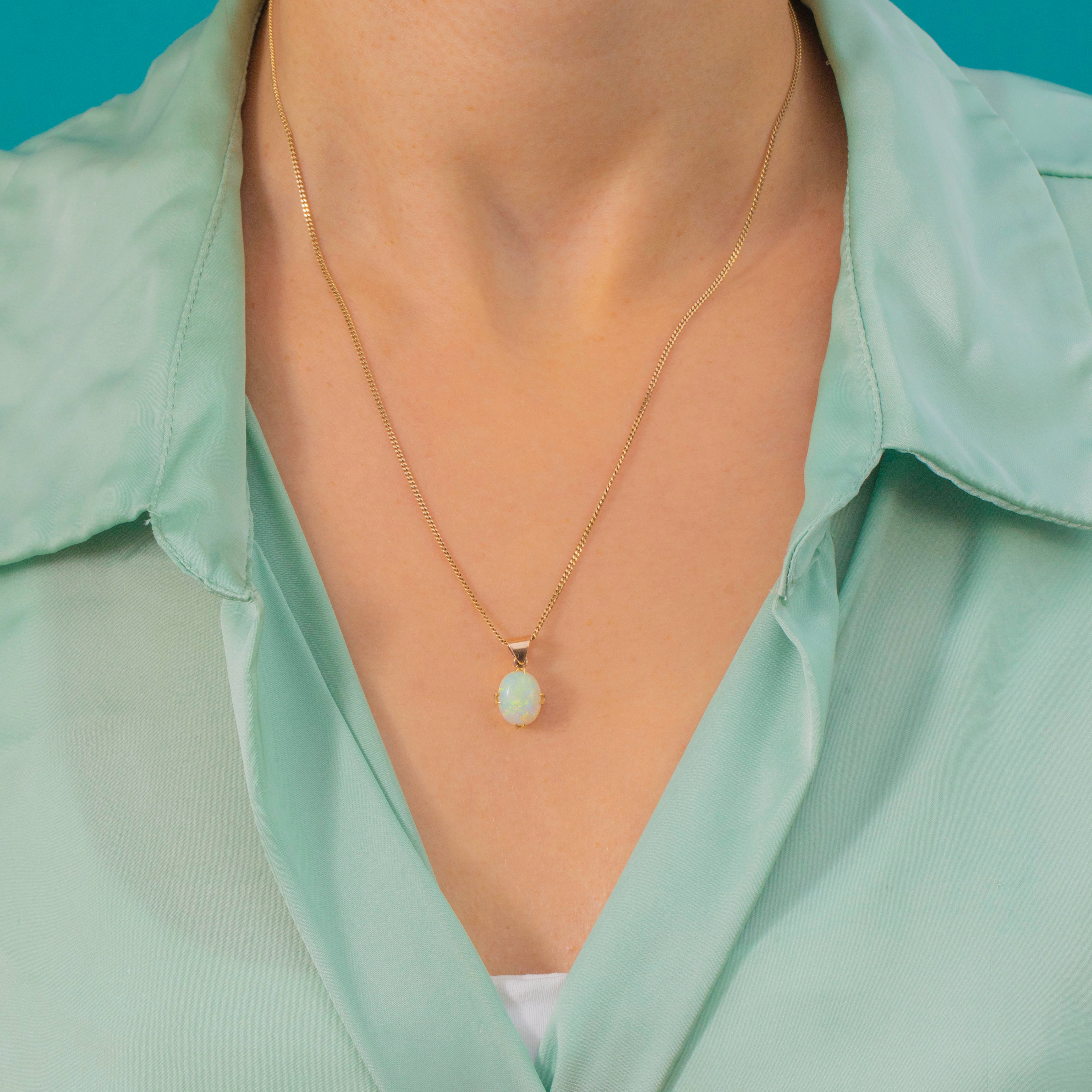 A wonderfully lively Art Deco Opal charm from the 1920s, set with a natural solid Opal cabochon radiating a kaleidoscope of colour. The Opal displays vivid flashes of green, indigo, orange and yellow against a delicate light body tone — a gemstone full of character and life.