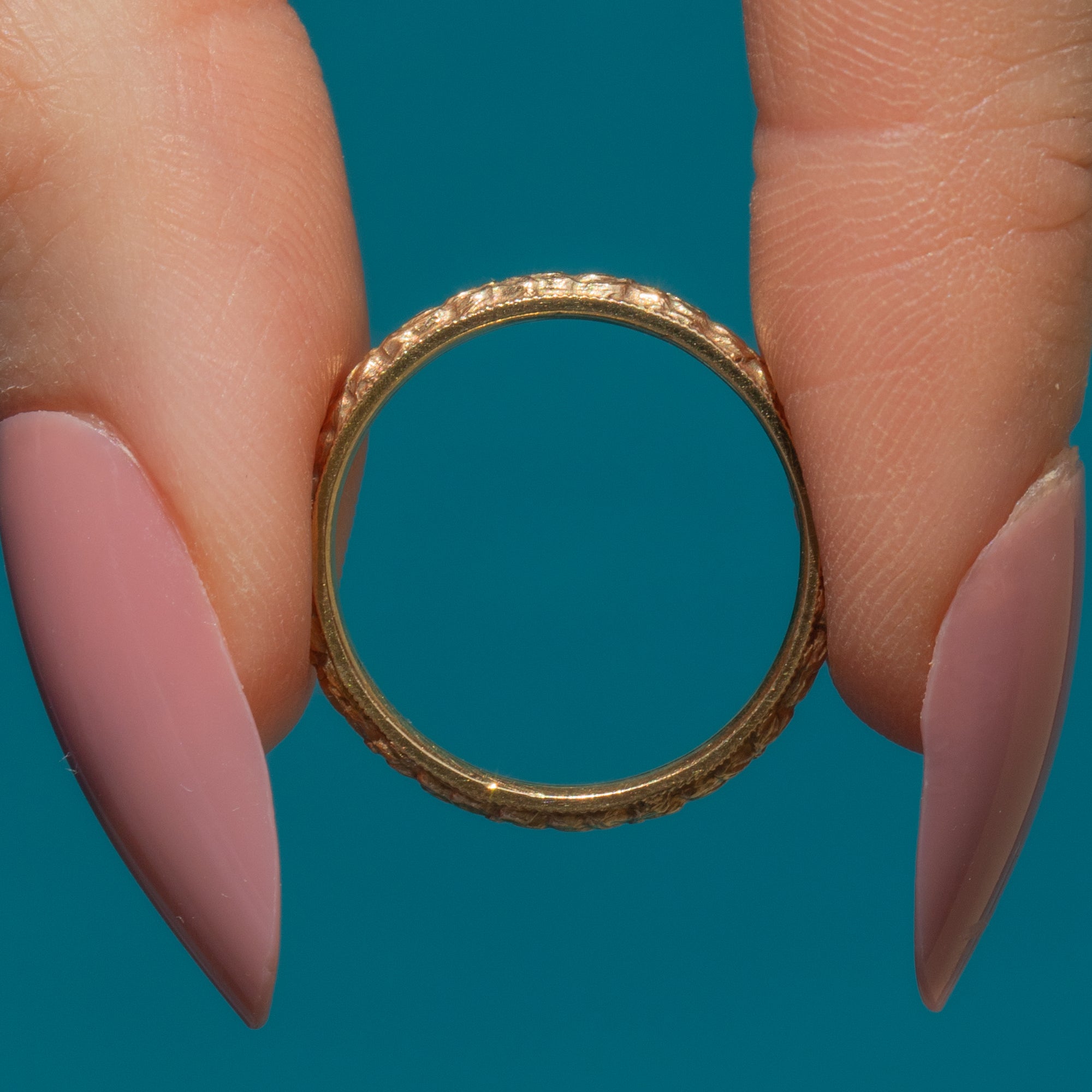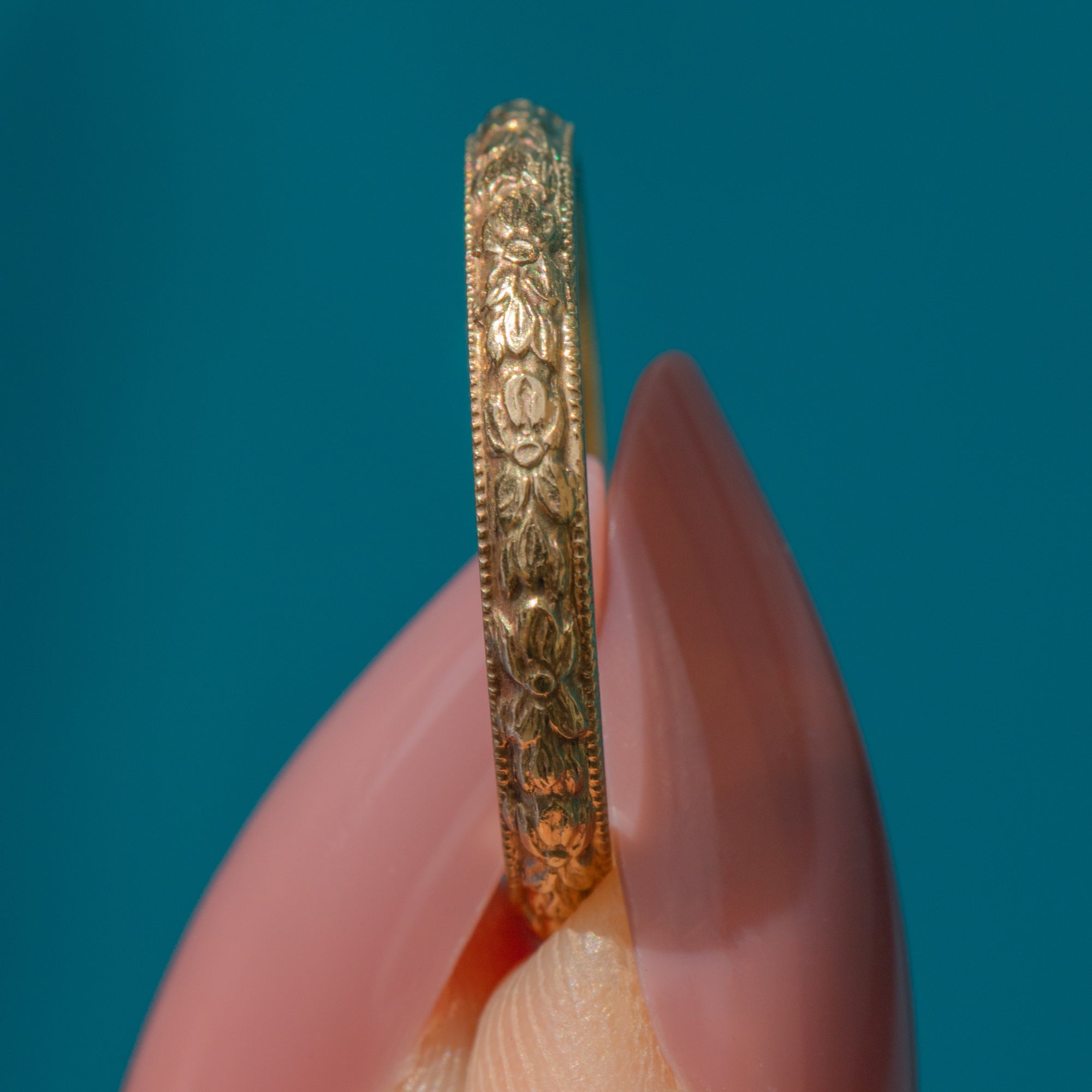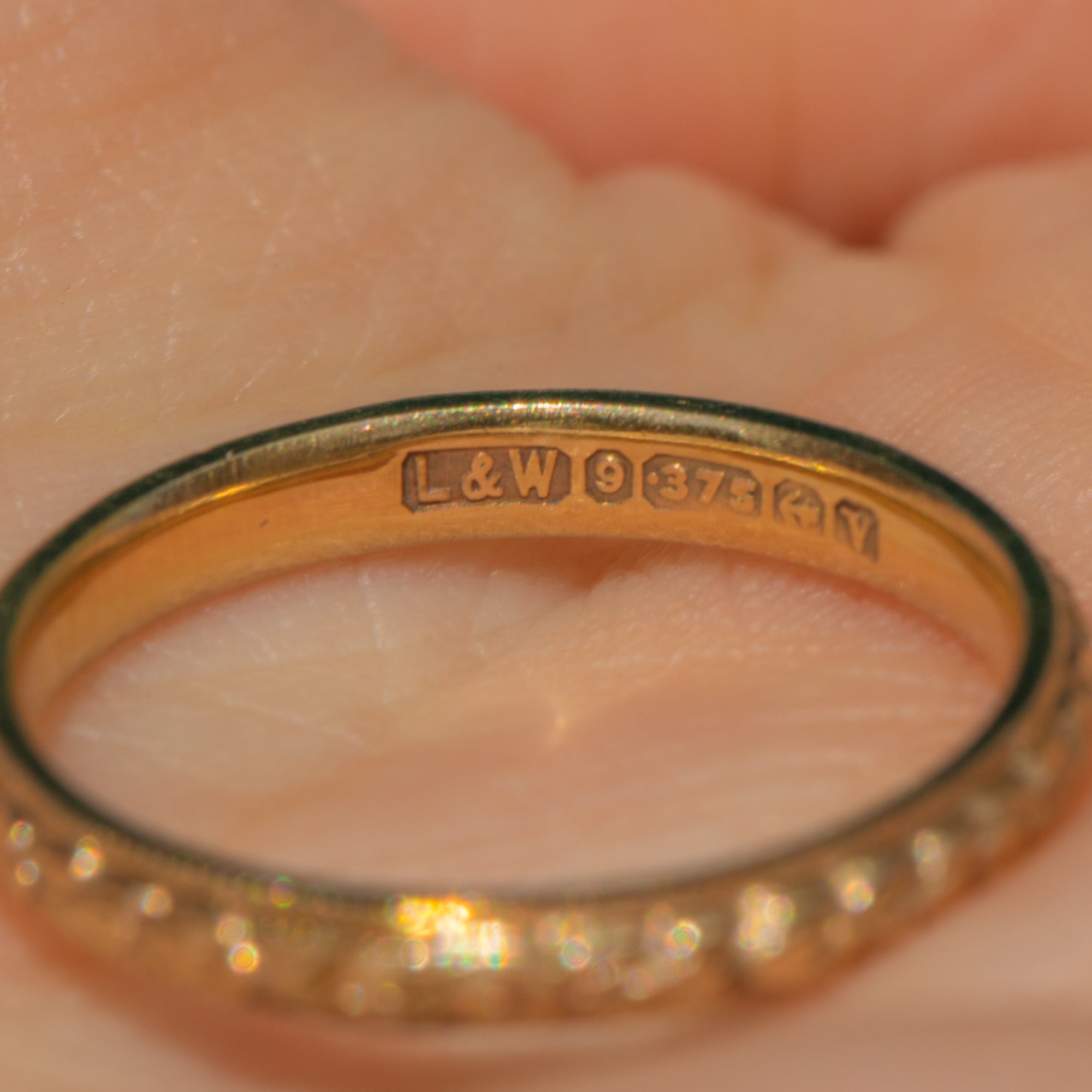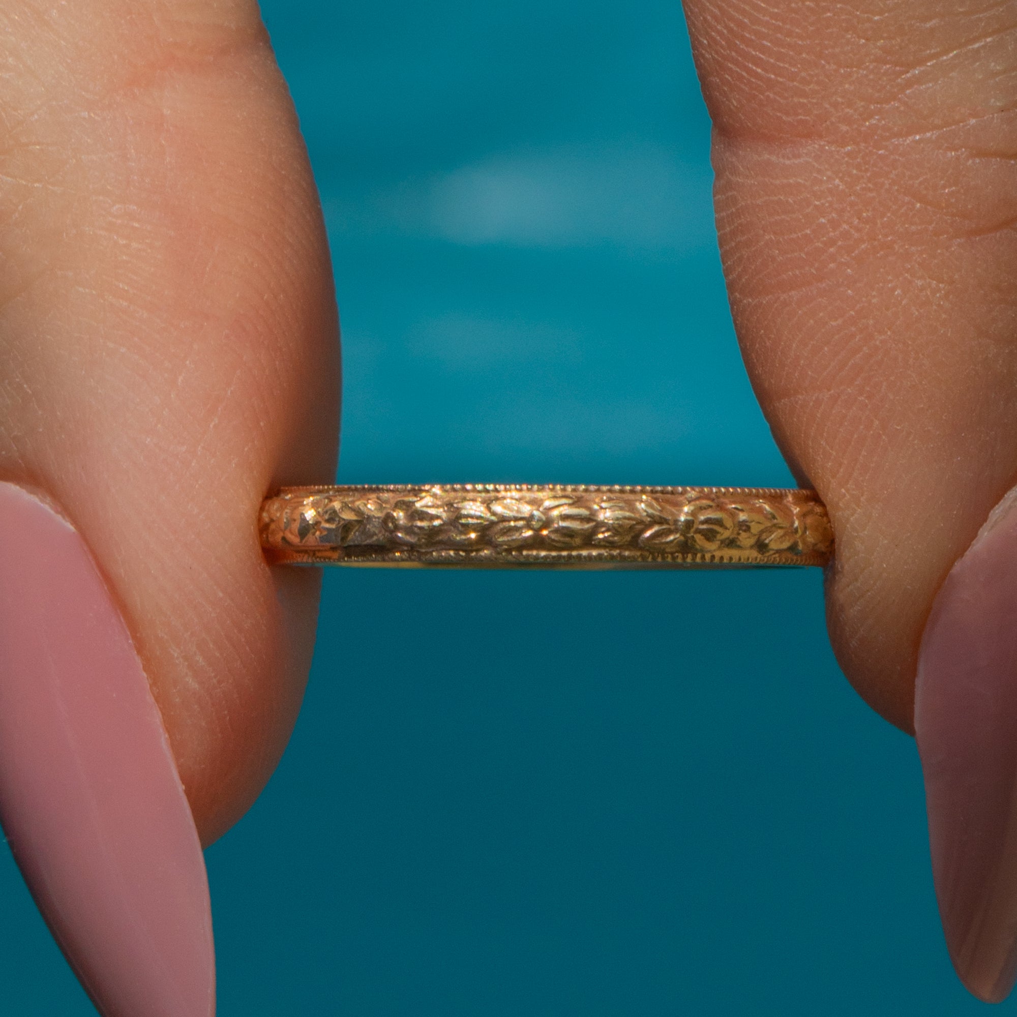 Whether you're looking the perfect ring for your upcoming nuptials or to add a decadent slice of Gold to your curated ring stack, this Art Deco 9ct Gold orange blossom engraved wedding band has got you covered!