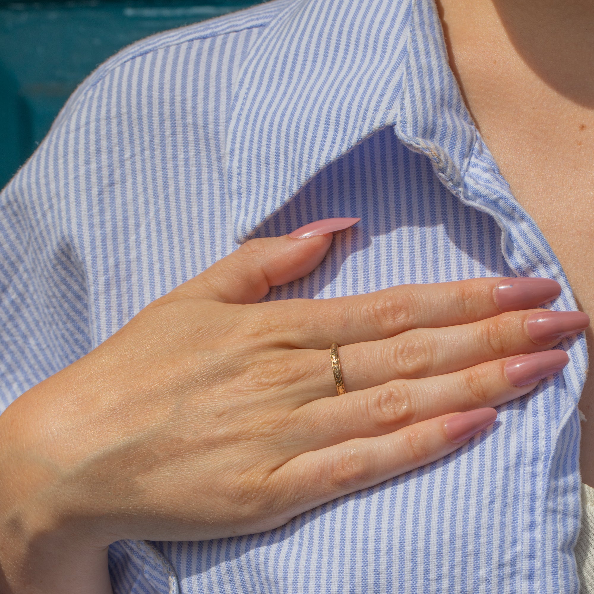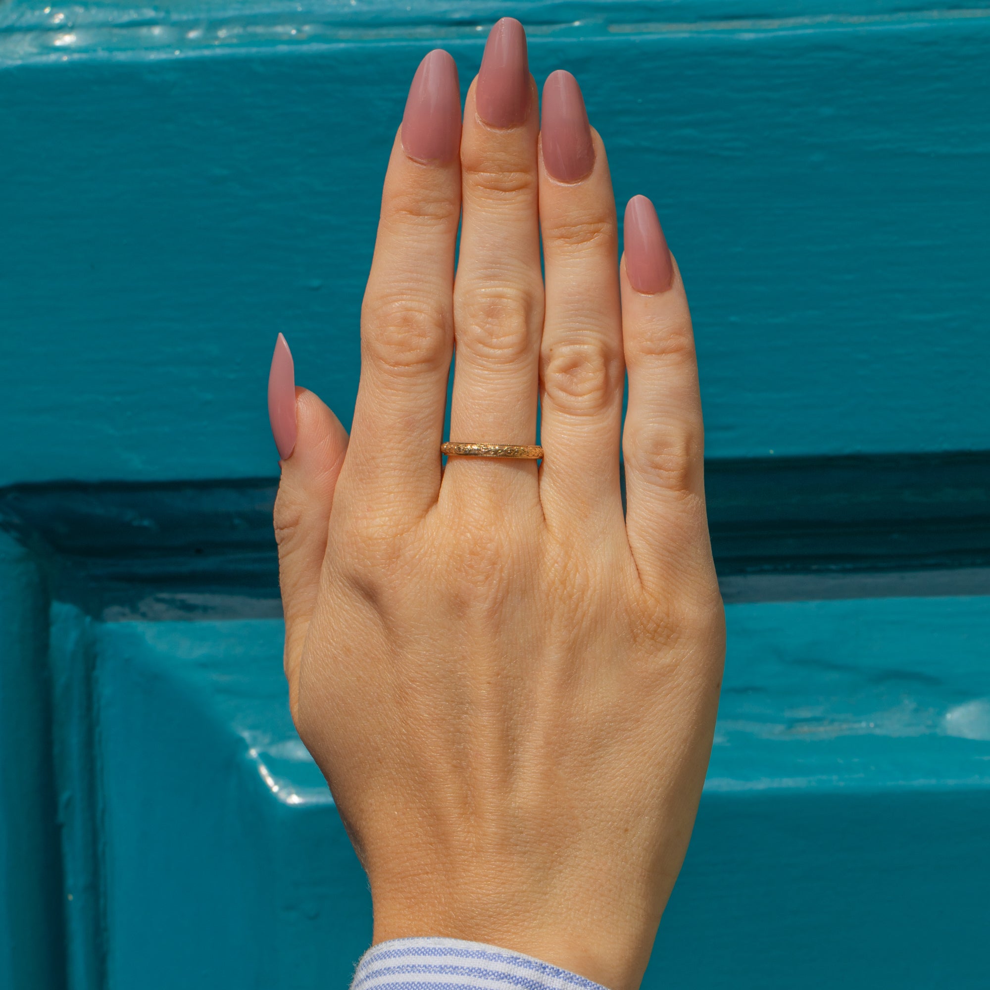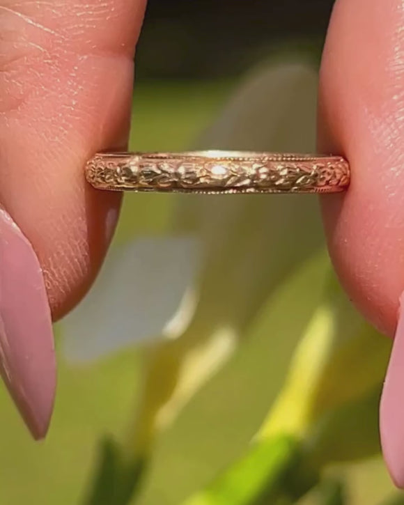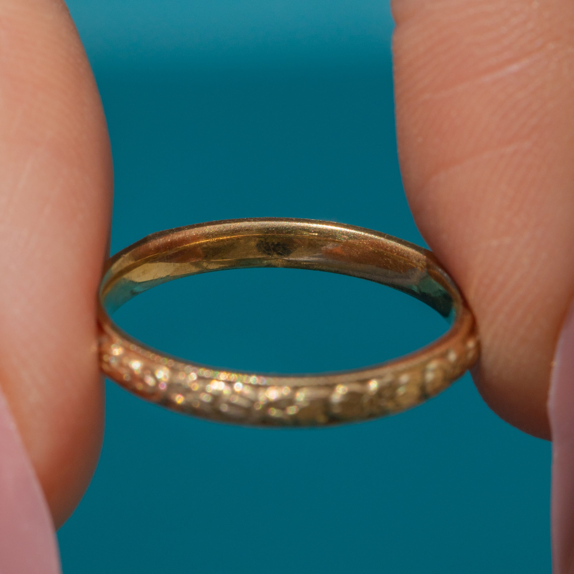 Whether you're looking the perfect ring for your upcoming nuptials or to add a decadent slice of Gold to your curated ring stack, this Art Deco 9ct Gold orange blossom engraved wedding band has got you covered!