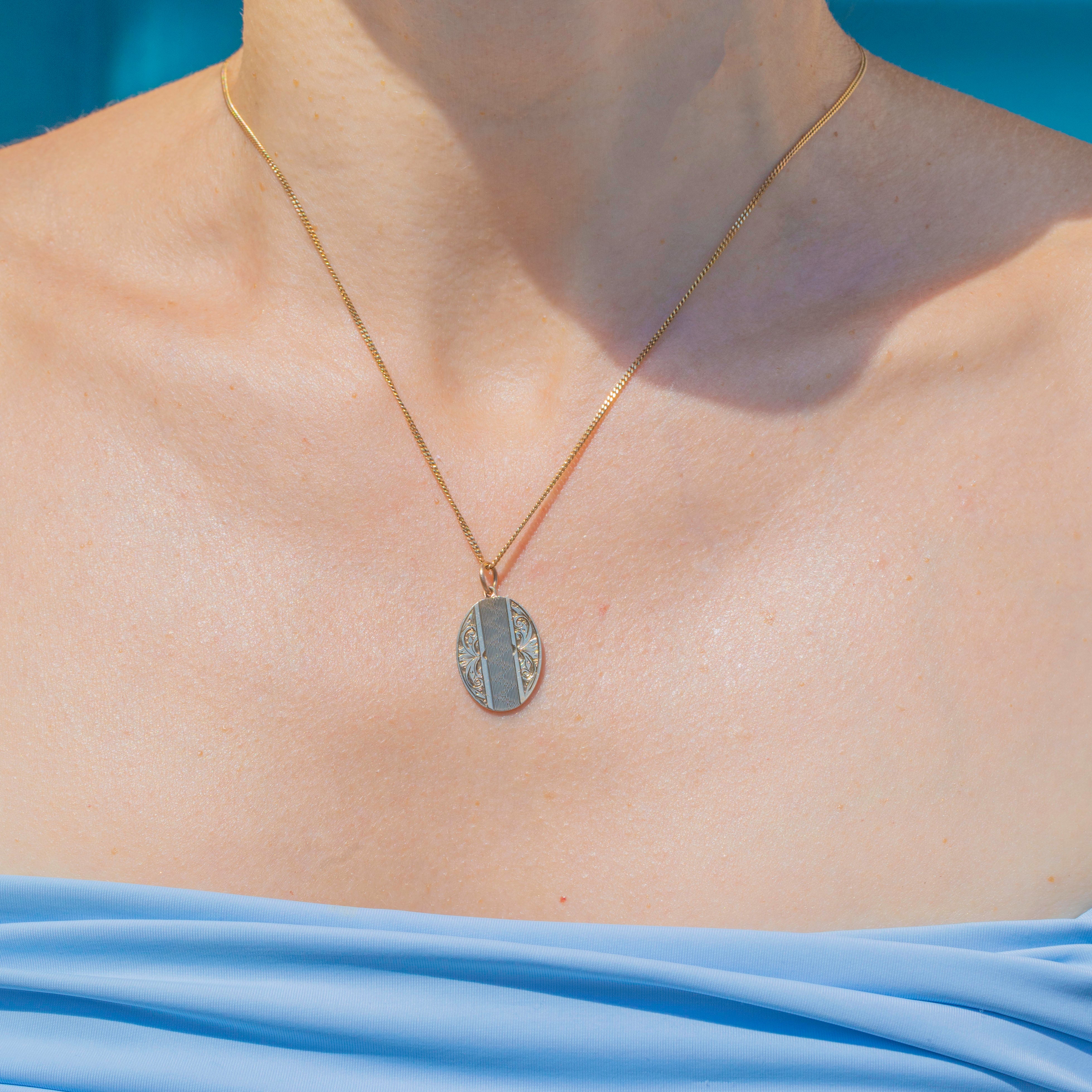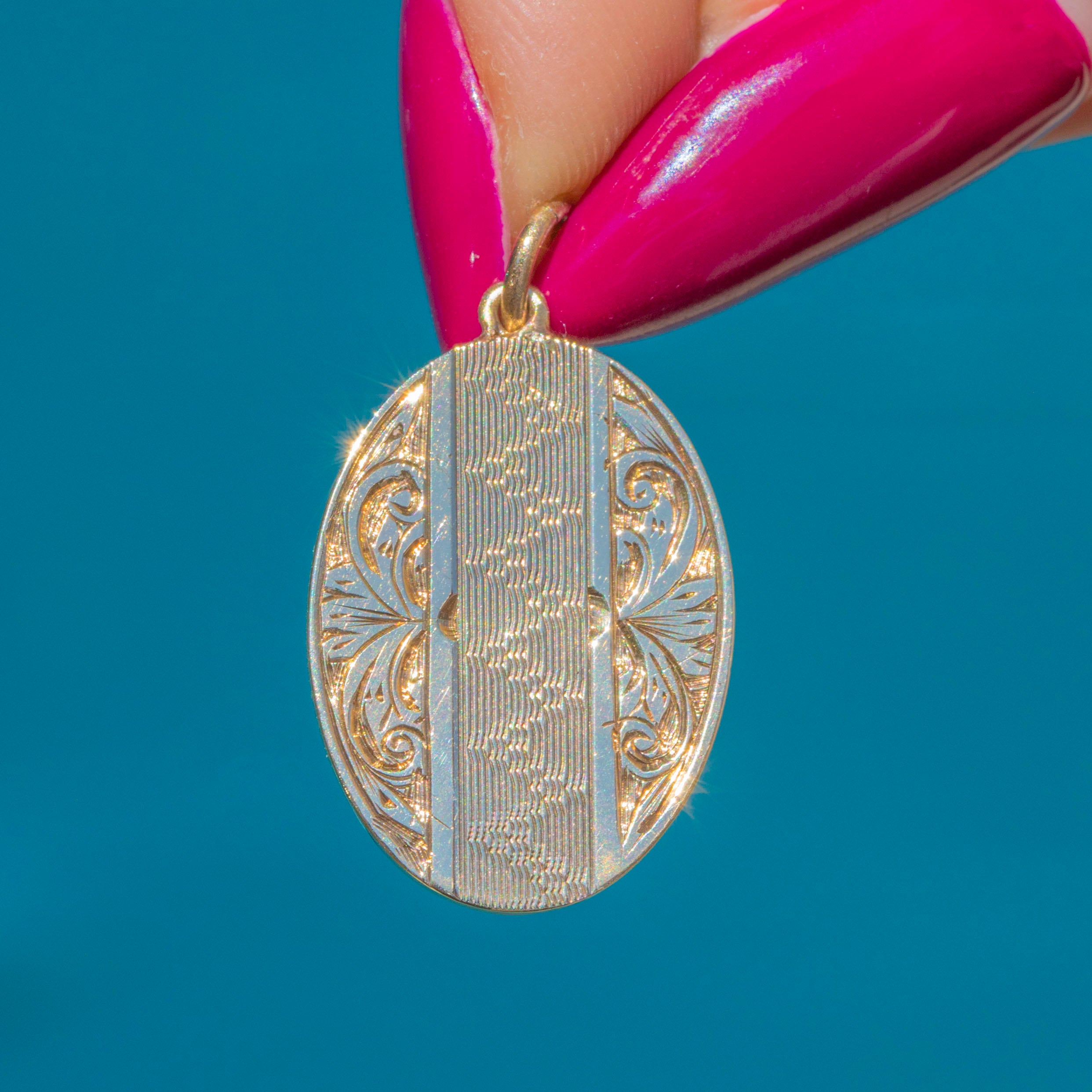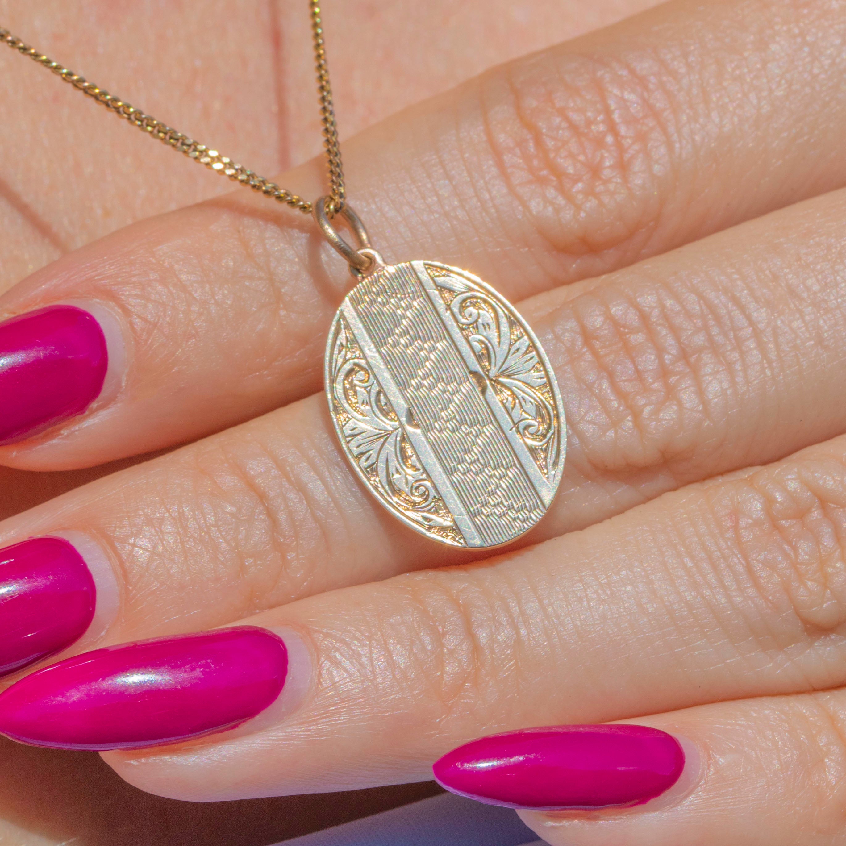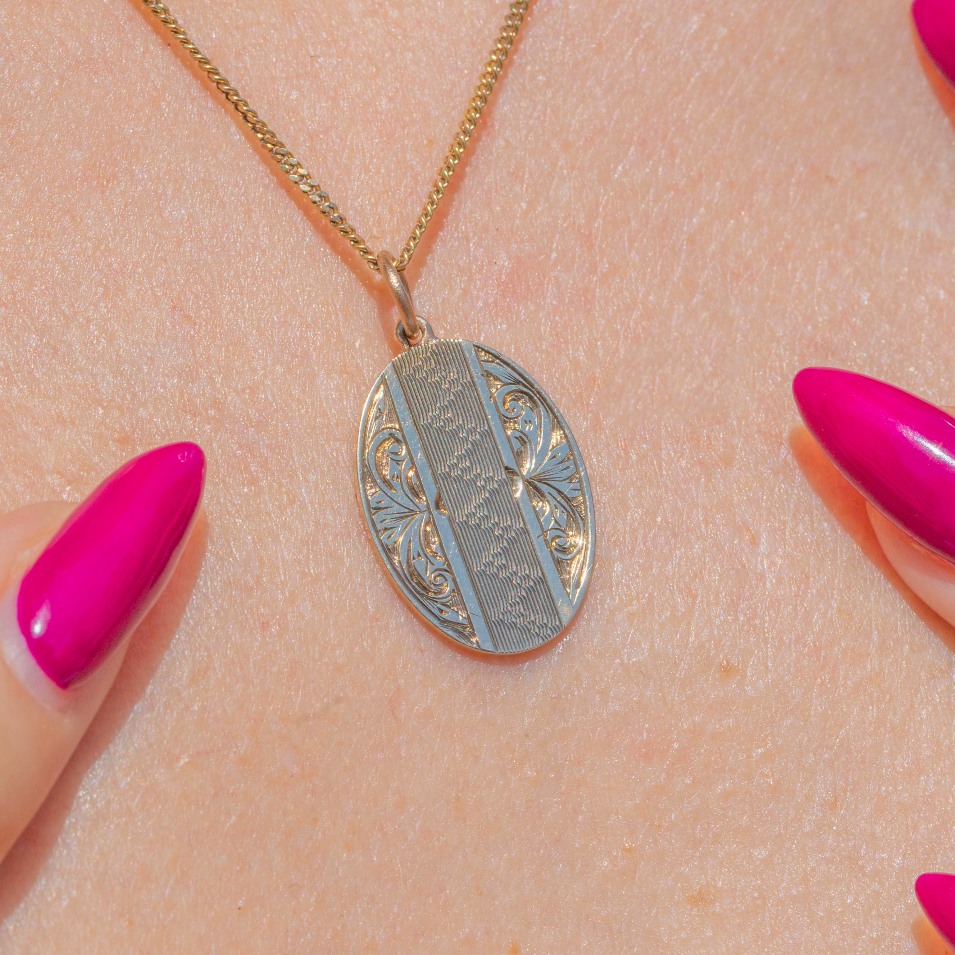 This Art Deco pendant is crafted from solid 9ct Gold and engraved with intricate engravings, perfectly capturing the geometric and decadent designs of the era.
