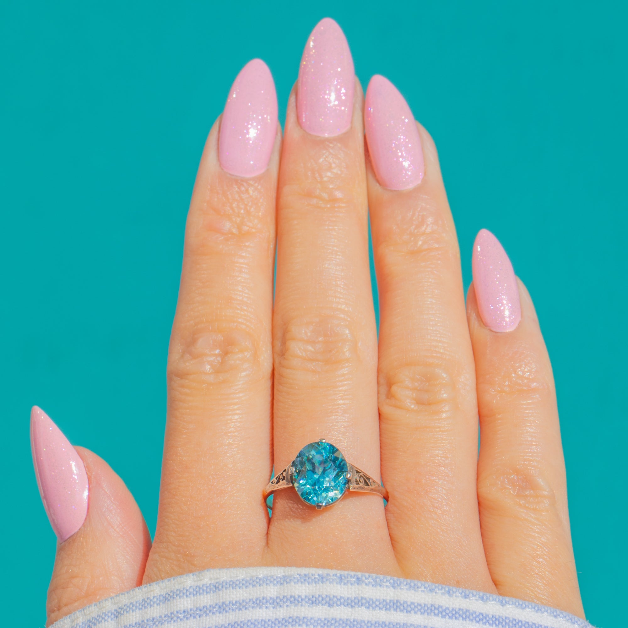 Alive with teal-blue fire, the approximately 4.50ct Zircon sits high to welcome the light, creating a captivating play of brilliance and colour. Poised, airy and graceful, it’s a timeless statement with that unmistakable Deco elegance.
