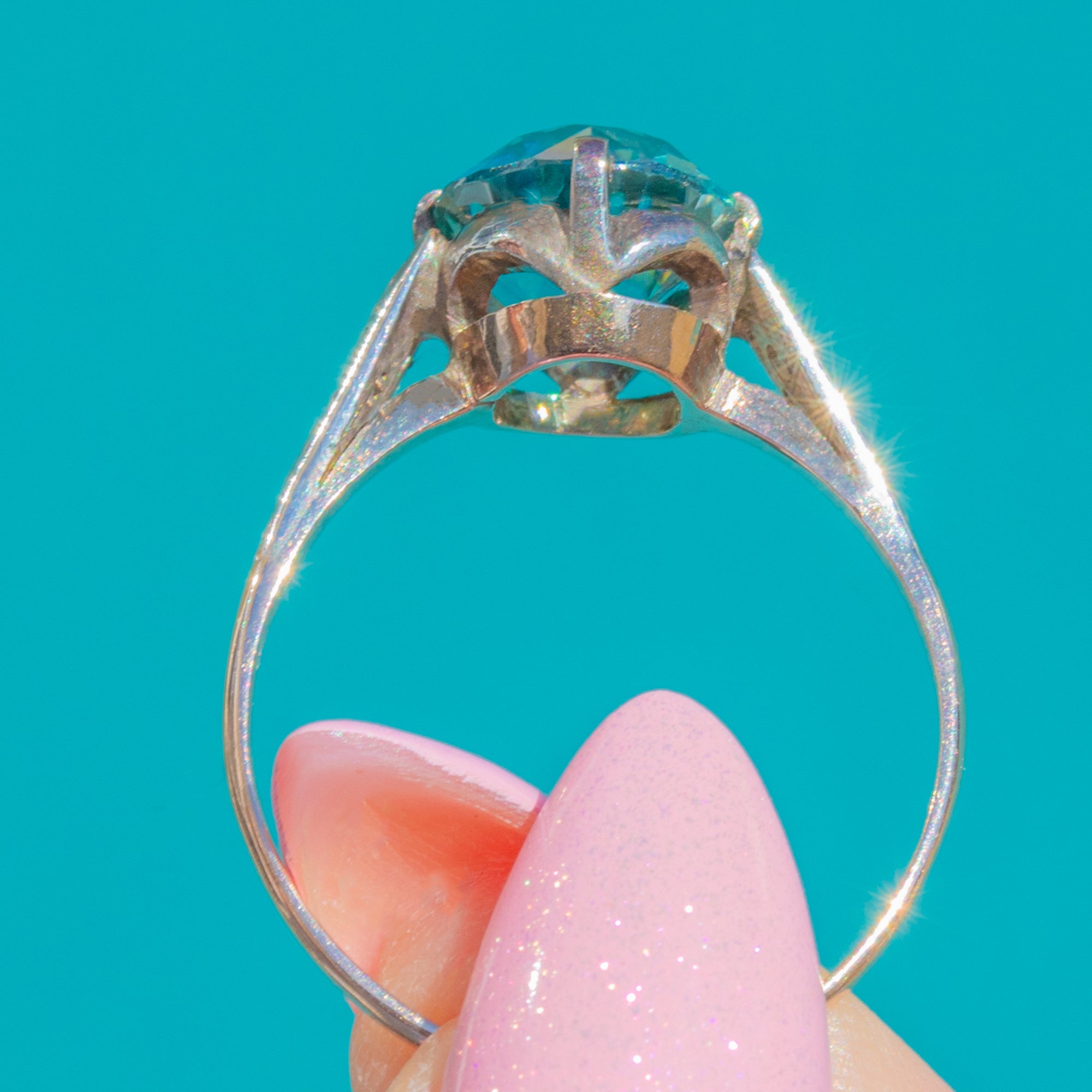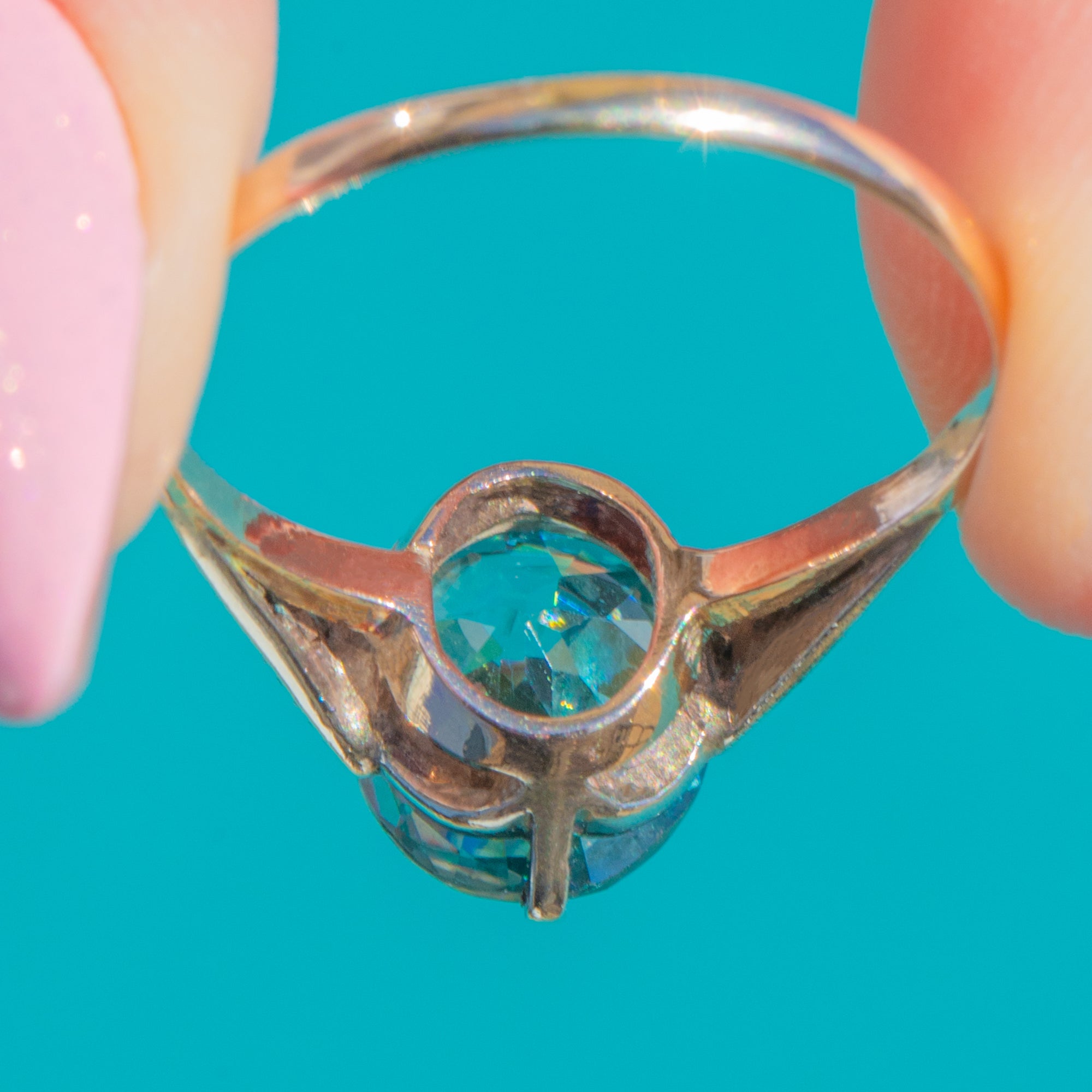 EXCELLENT: The Starlite Blue Zircon presents beautifully with vivid colour and minimal surface wear. The four-claw Silver setting and open gallery are secure with light, superficial wear to the metal. The 9ct Gold band is smooth and well-shaped with gentle surface marks commensurate with age.