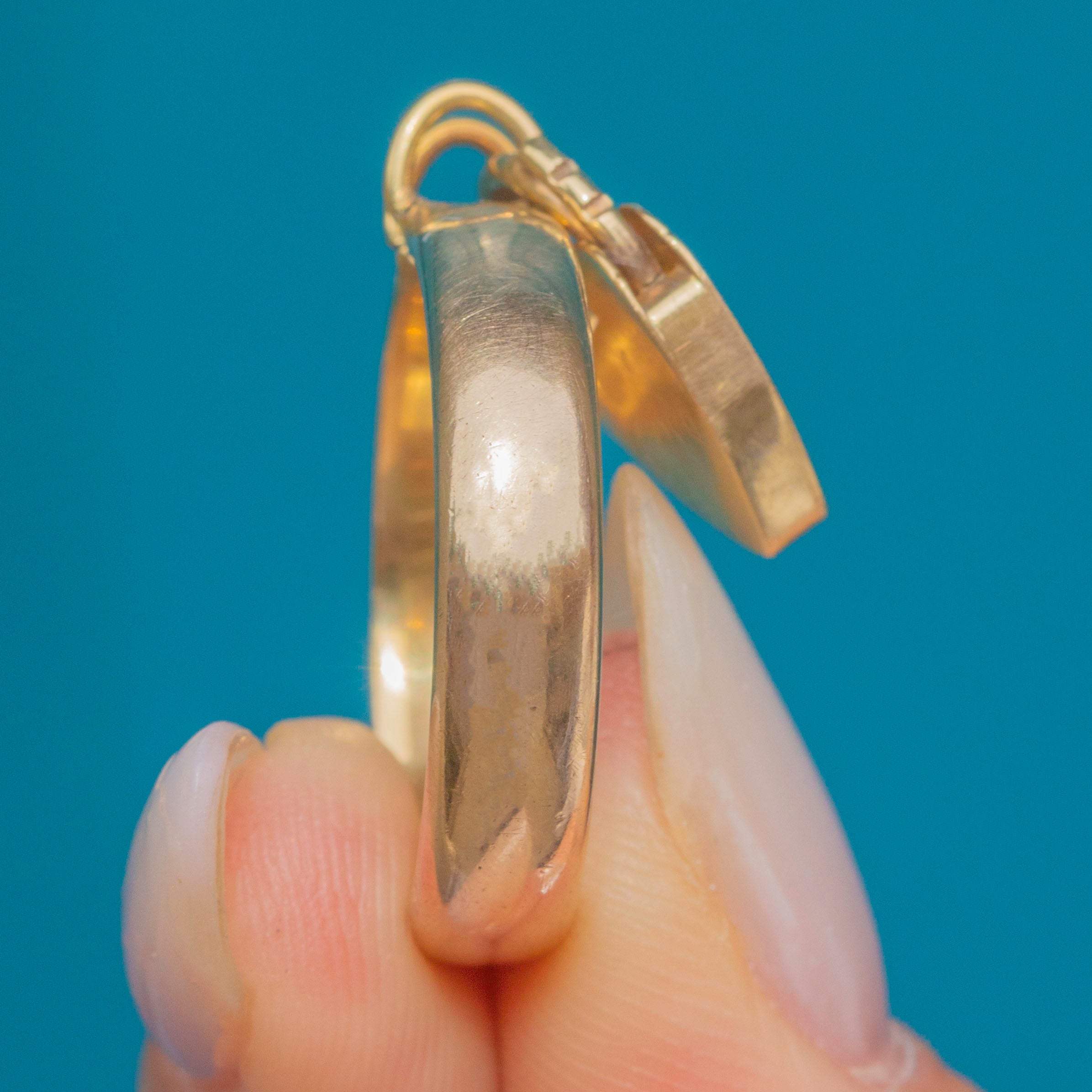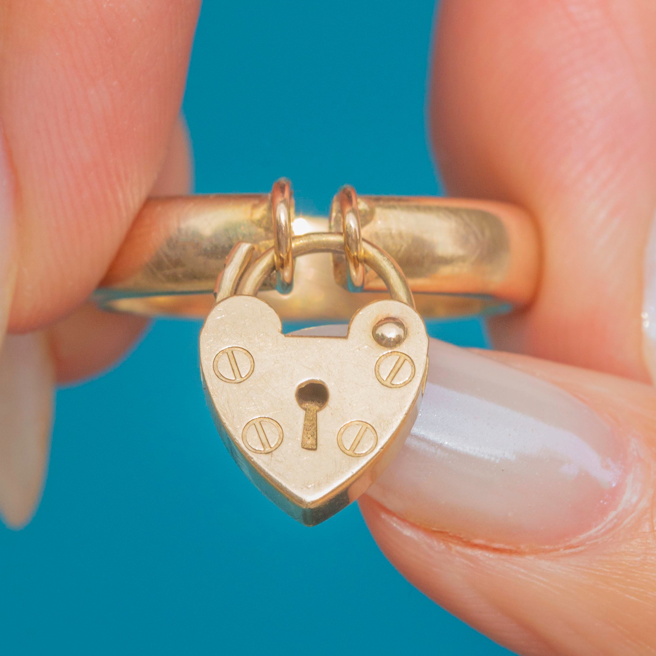 VERY GOOD: Gleaming a honey-hued 9ct Gold, she has aged well, with a smooth band and a full set of hallmarks still legible. There are a few faint scratches on the padlock, which are only visible under close inspection. She is a fantastic and coveted find and will quickly become your most treasured possession!