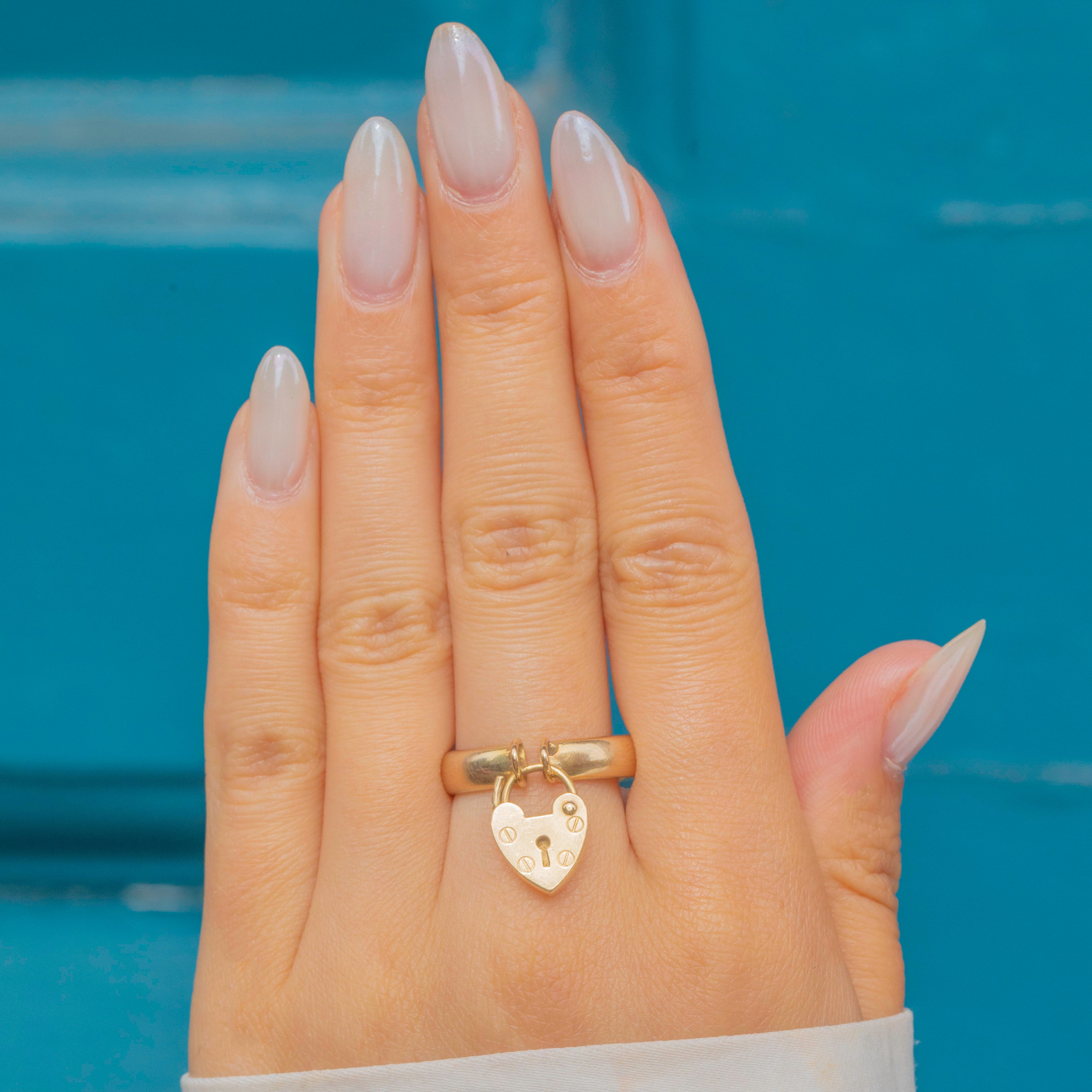 This Art Deco ring has been beautifully crafted from solid 9ct Gold and features a bold, curvaceous band with a charming heart padlock that hangs gracefully, with a full set of hallmarks that date to 1935.