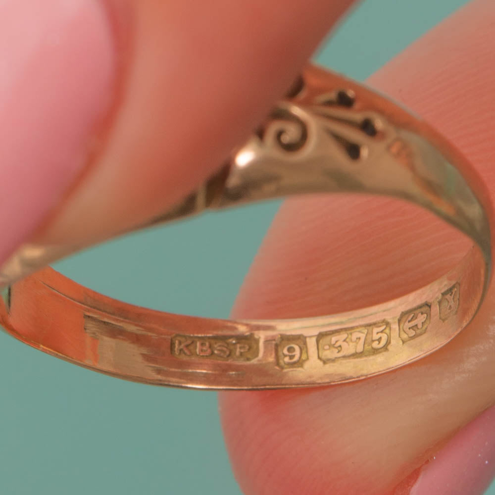 VERY GOOD-EXCELLENT: This antique 9ct Gold Sapphire and Pearl gypsy ring is in very good-excellent condition. Each of her gemstones is lustrous and set securely. The Gold is glossy and though she has some minor surface wear and evidence of a previous resize, this is not noticeable when wearing. The hallmarks are crisp and fully legible, allowing us to accurately date her to 1922!