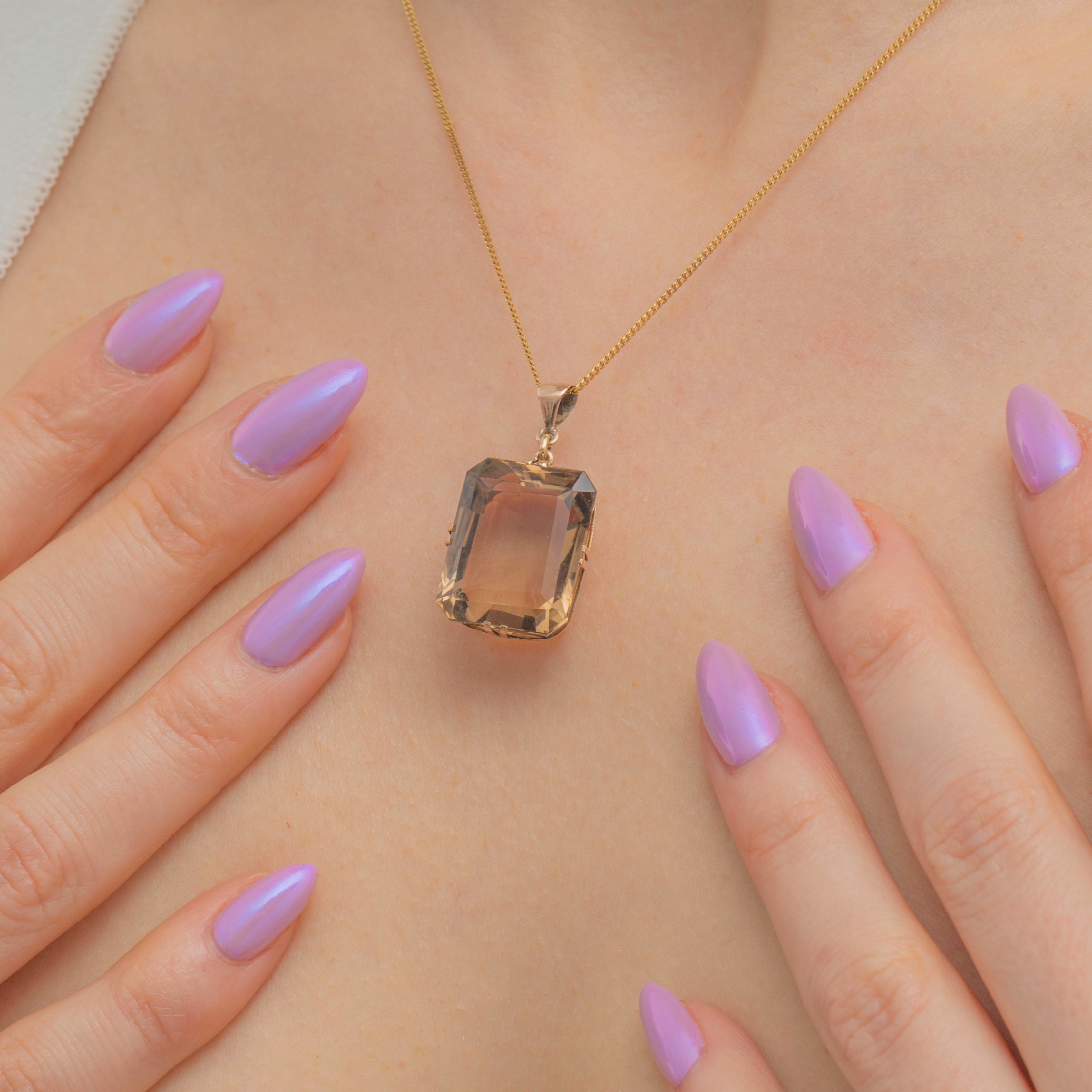 The sleek emerald-cut of the Smokey Quartz marries perfectly with her stylistic double claw settings, crafted from buttery 9ct Gold. This showstopping Art Deco pendant is the perfect standalone piece!