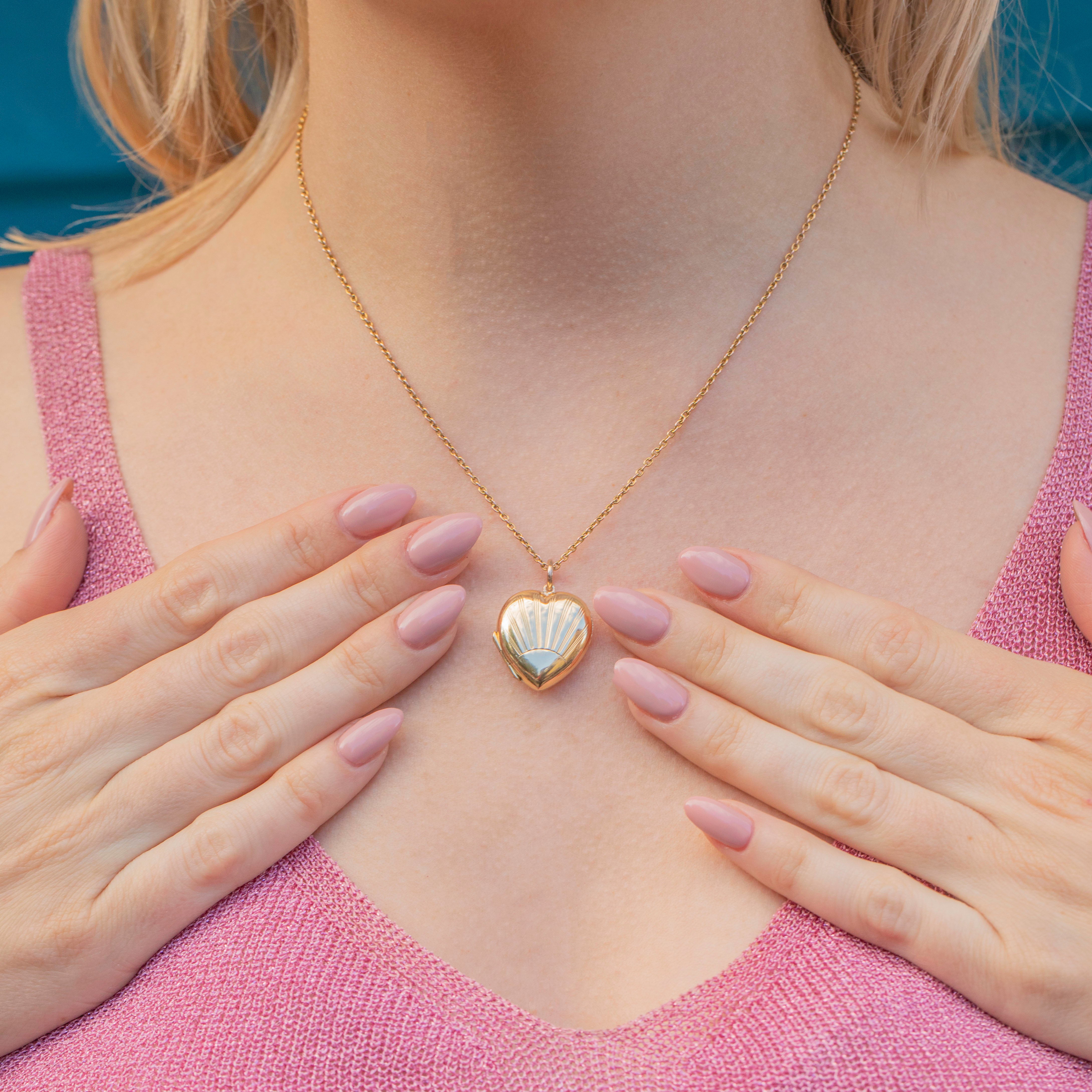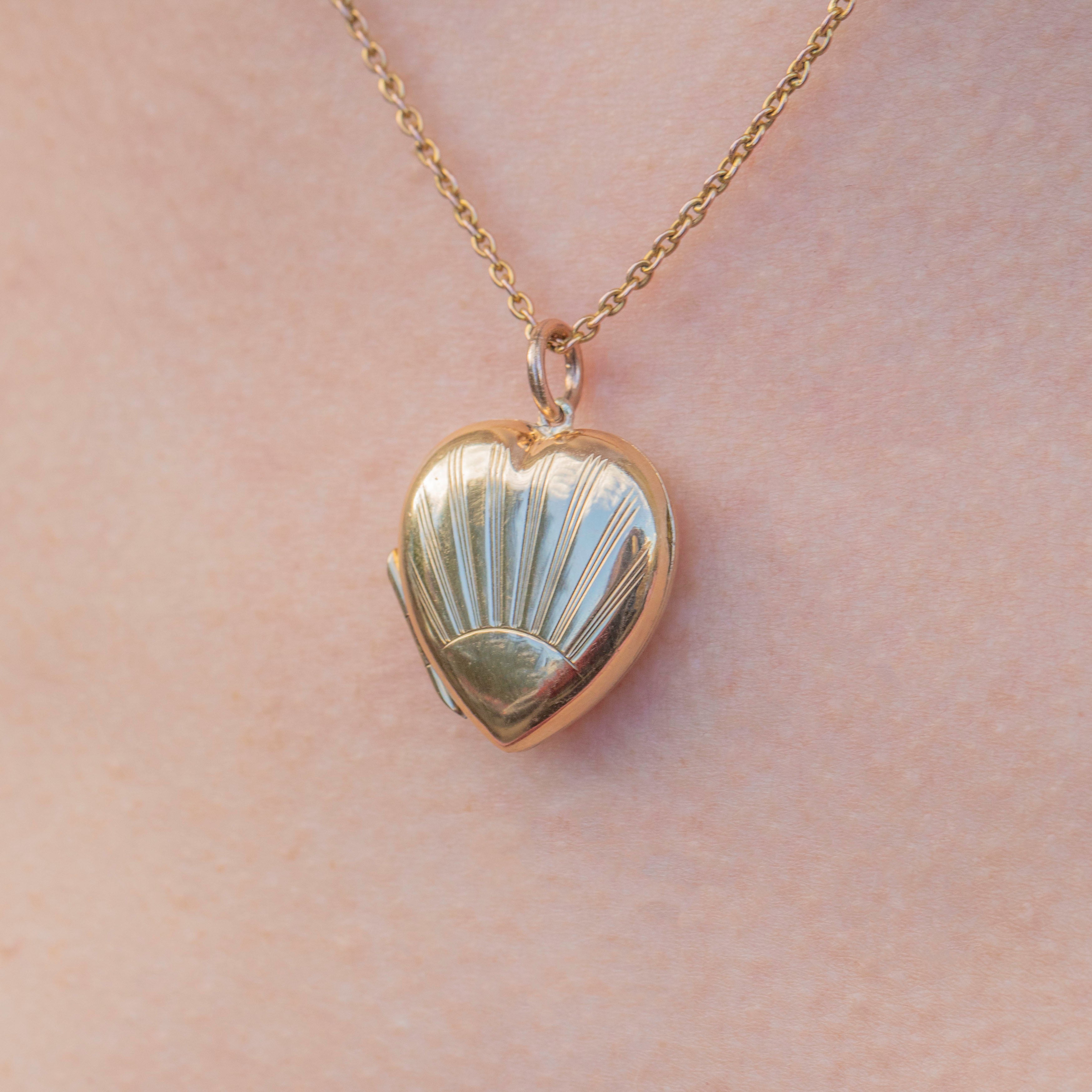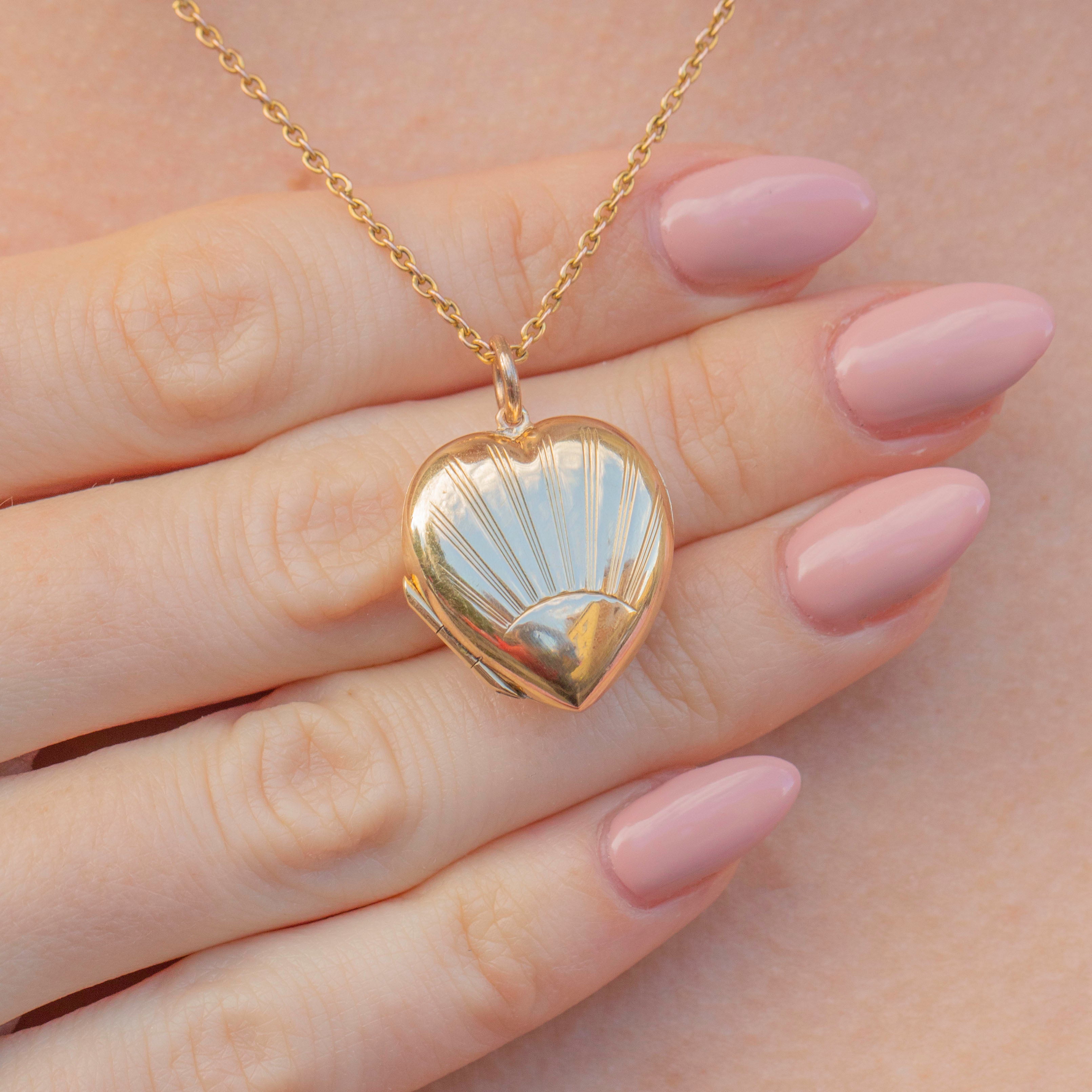 This striking Art Deco 9ct Gold Sunburst heart locket is a stunning representation of the bold, geometric style of the Art Deco period! Crafted from a richly saturated 9ct yellow Gold, the locket features a rising sun design radiating from her centre with beaming rays engraved into her glossy surface.