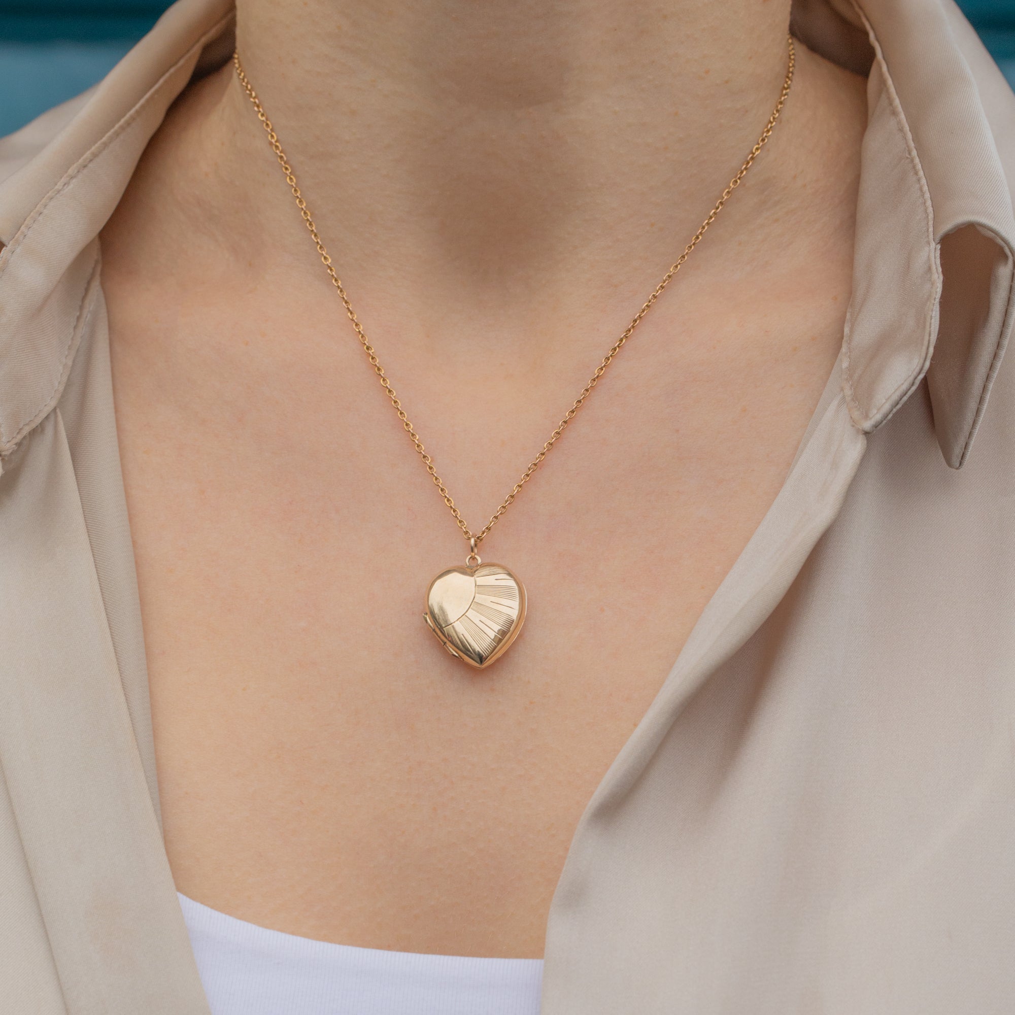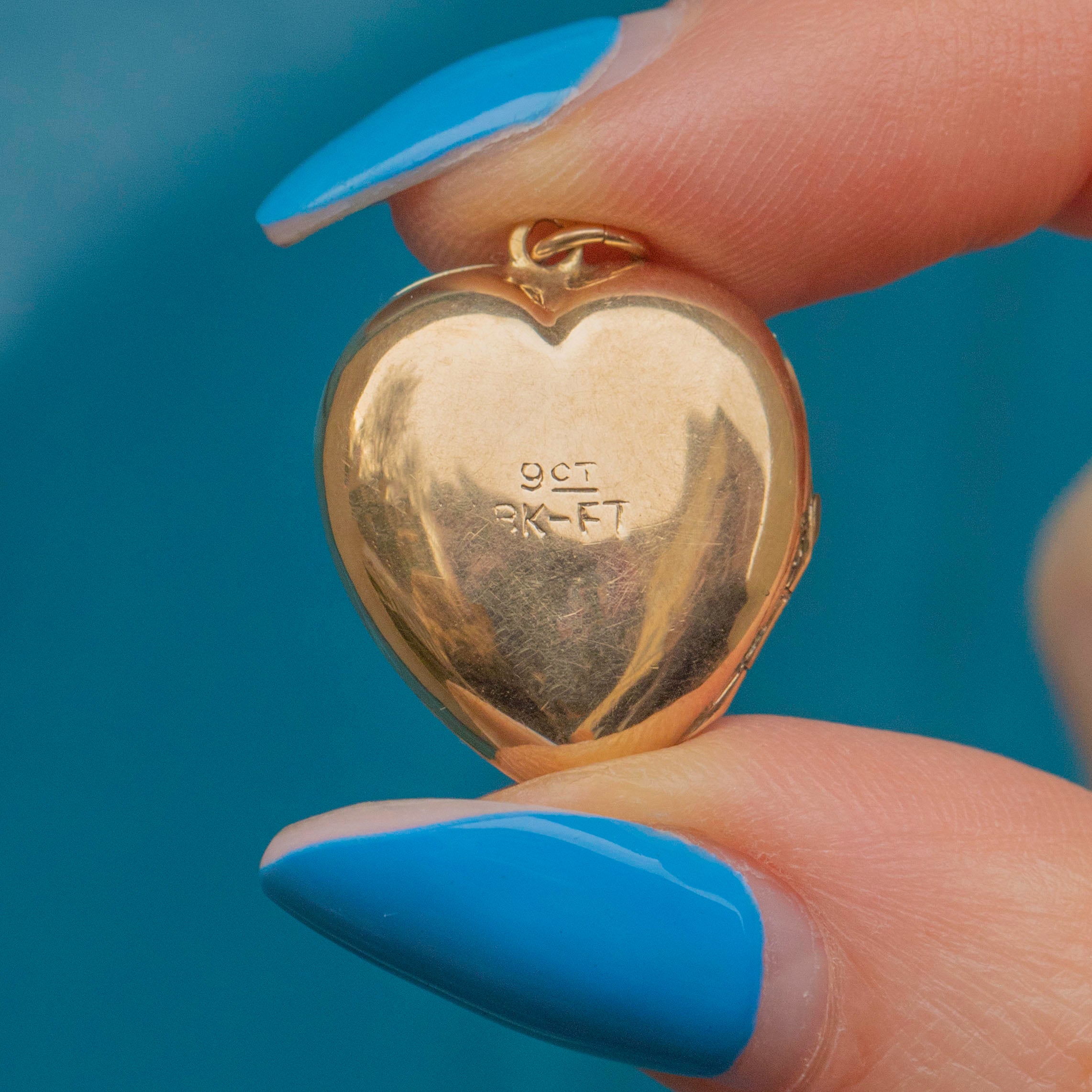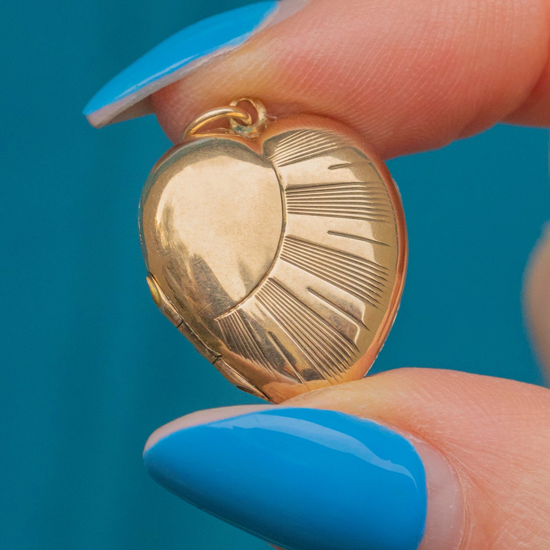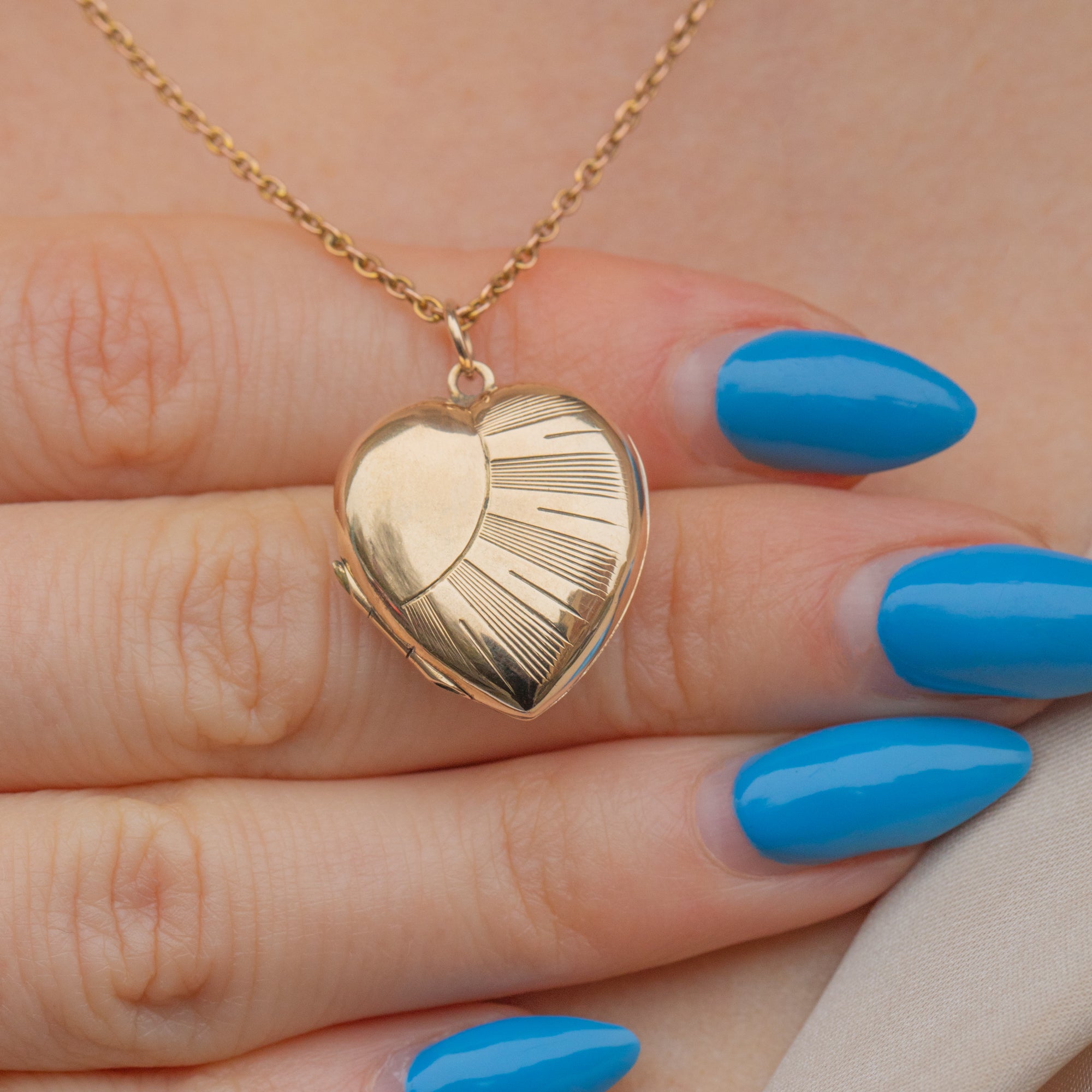 EXCELLENT. This Art Deco 9ct Gold sunburst heart locket is in excellent condition. The Gold is buttery and the engraved details have remained crisp. The locket comes complete with two frames inside and closes securely, allowing you to wear this antique heart locket with absolute confidence!