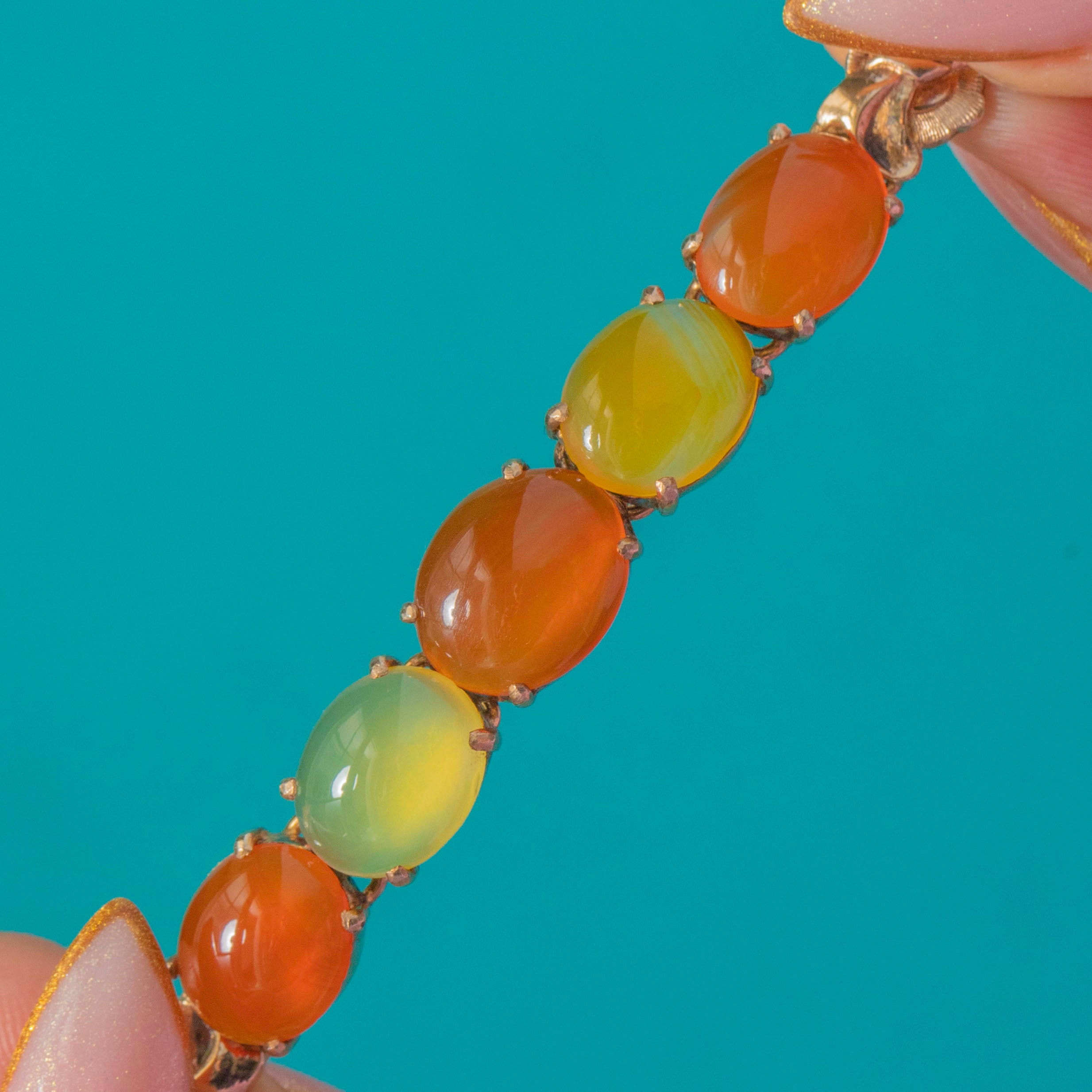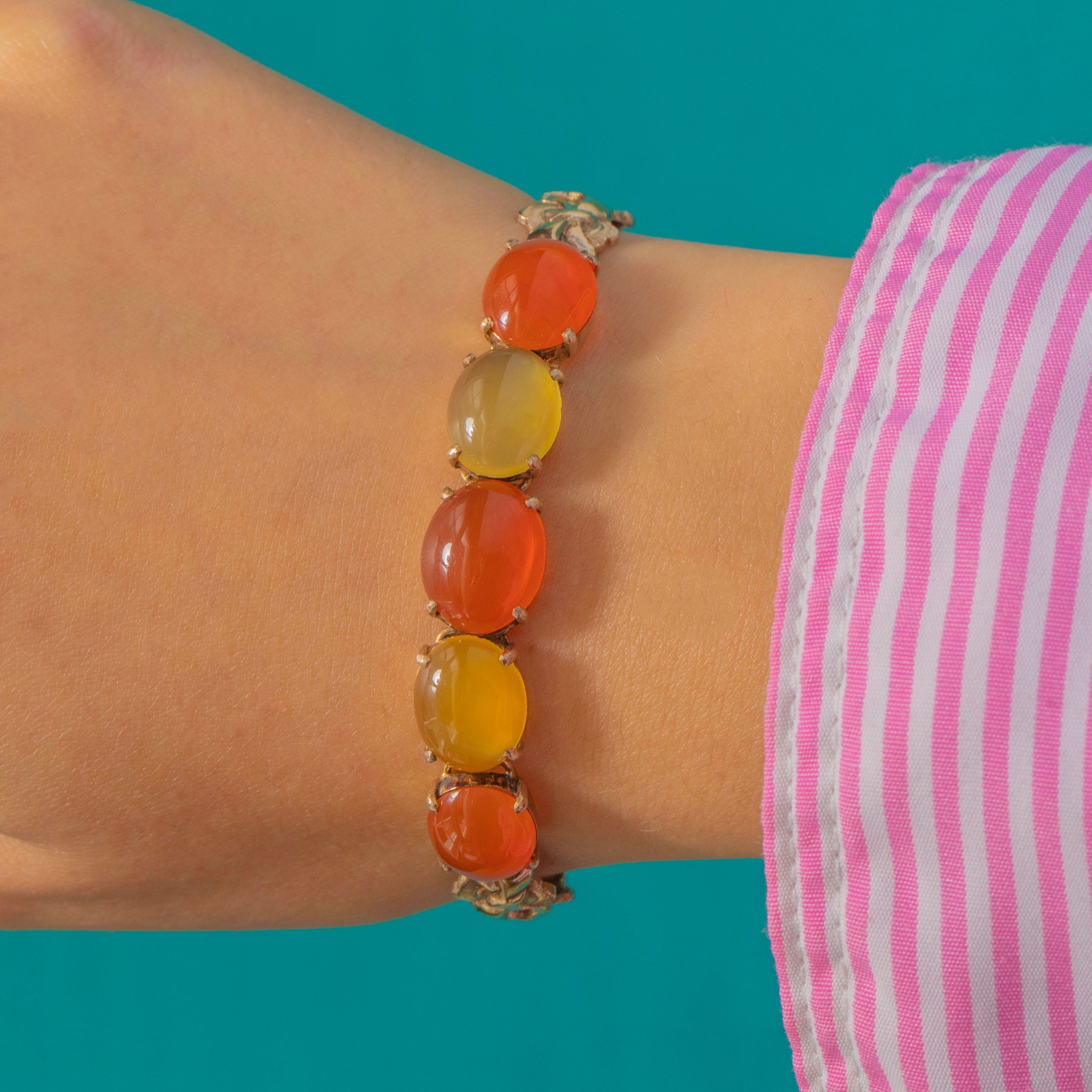 This vibrant Art Deco “Sweetie” bracelet captures the playful elegance of the 1920s with glossy bands of orange and yellow Agate. Each stone is smoothly polished and individually linked, graduating in size to create a wonderfully tactile feel on the wrist.