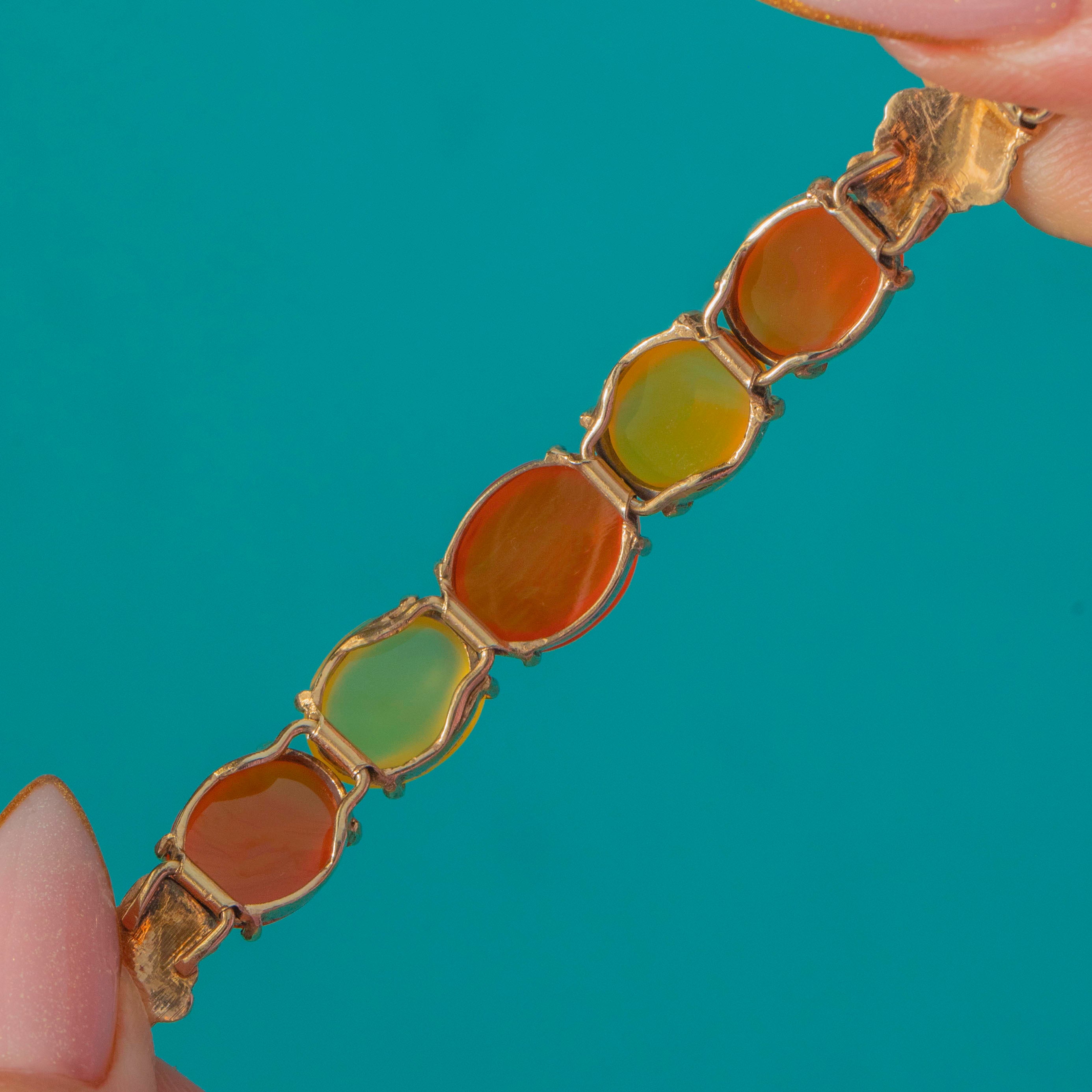 EXCELLENT: This Art Deco bracelet is in beautiful condition with bright, glossy Agates and minimal surface wear. The gilt remains rich and even in tone, and the clasp fastens securely. A striking and joyful piece of period jewellery.