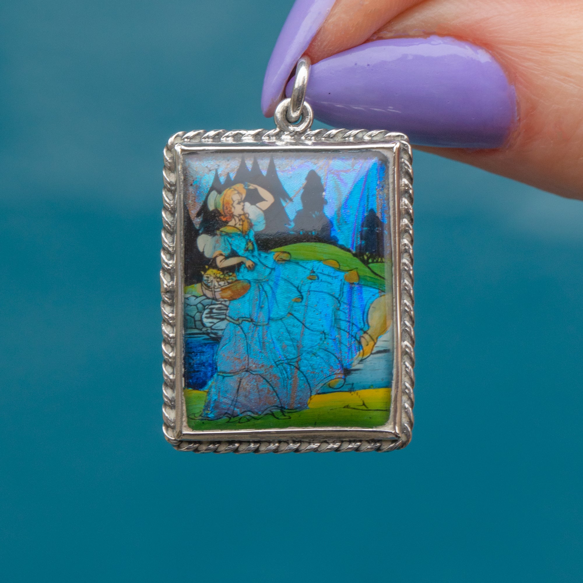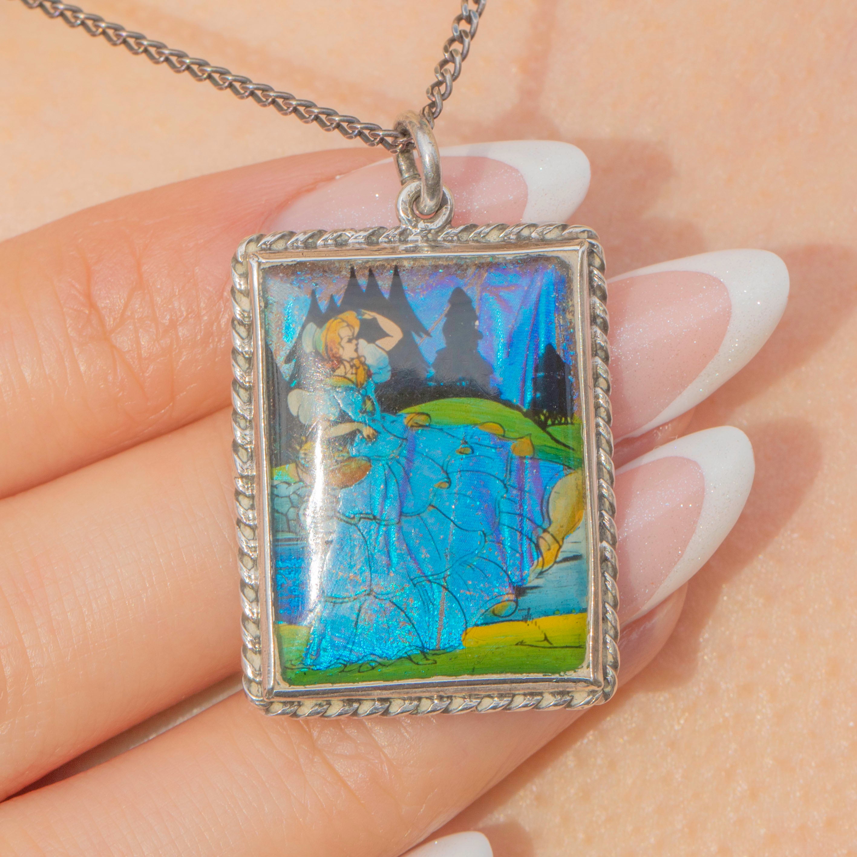EXCELLENT: This Art Deco Silver butterfly wing crinoline lady pendant is in excellent condition, making it a highly desireable piece of Art Deco jewellery! The Morpho wing has been exquisitely preserved, with no signs of wear on the wing or the hand-painted details. The Silver is bright and has accrued an admirable patina within the grooves of the rope border, making the details pop. With plenty of wear potential and steeped in British history, don't hesitate to make this outstanding Art Deco butterfly wing pendant your newest acquisition!
