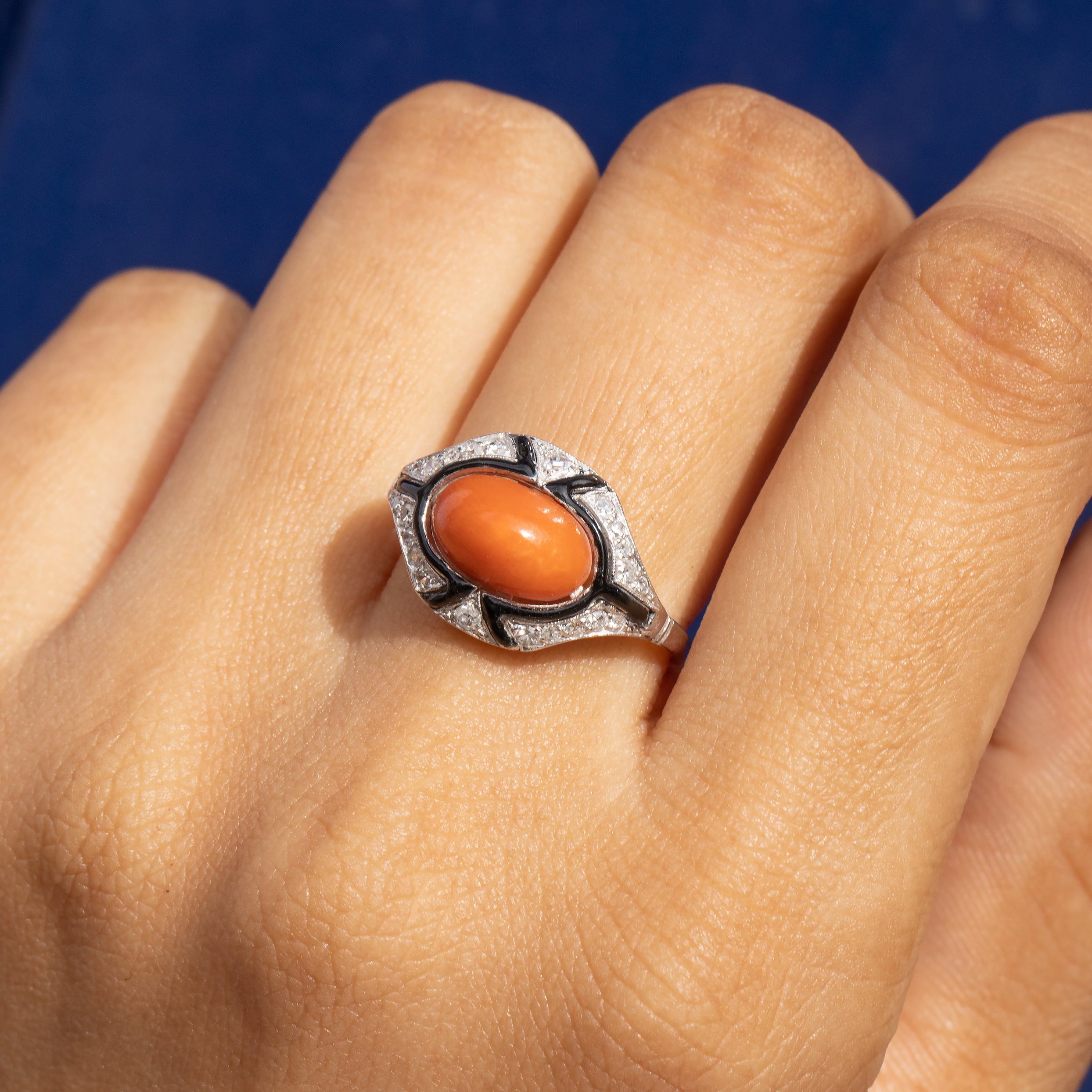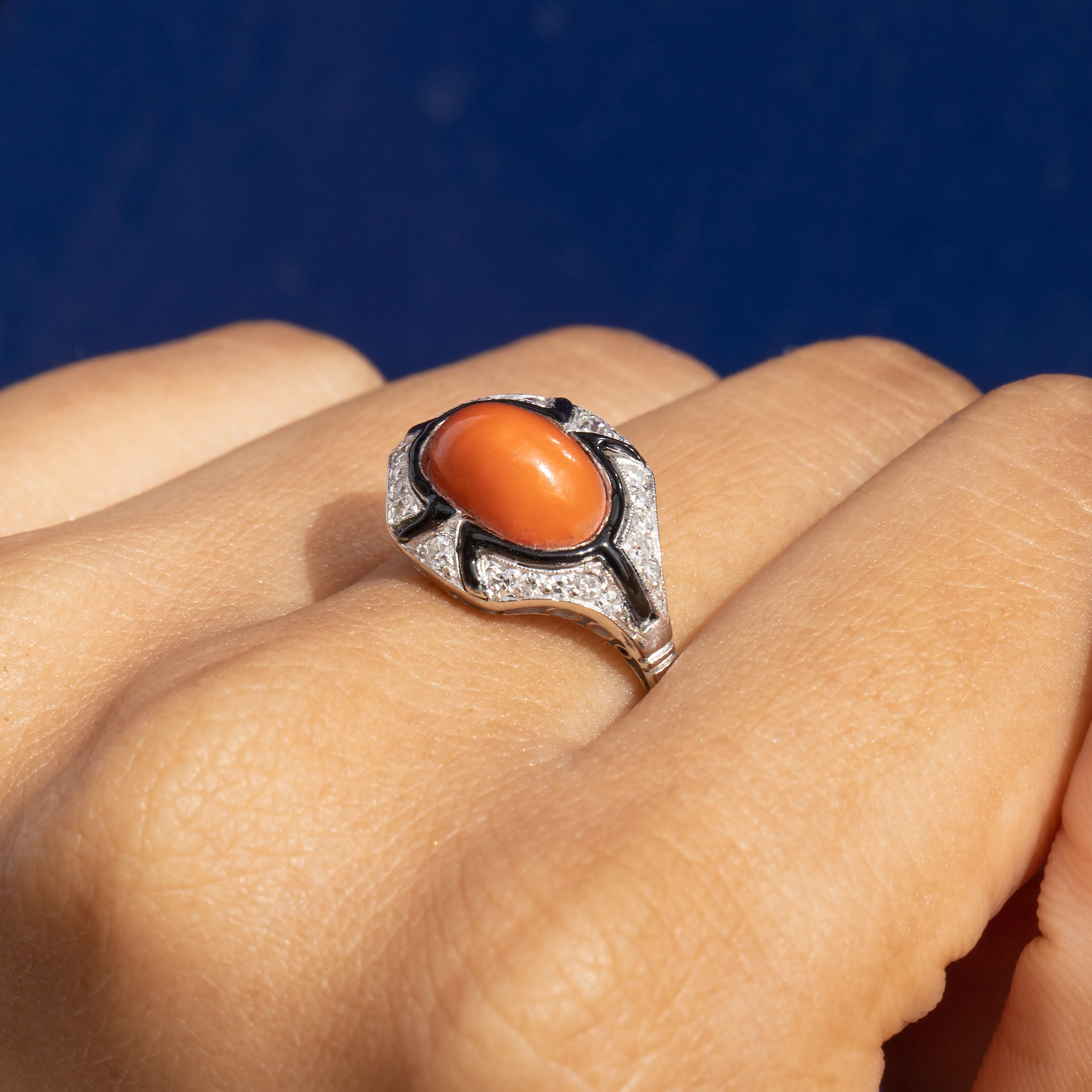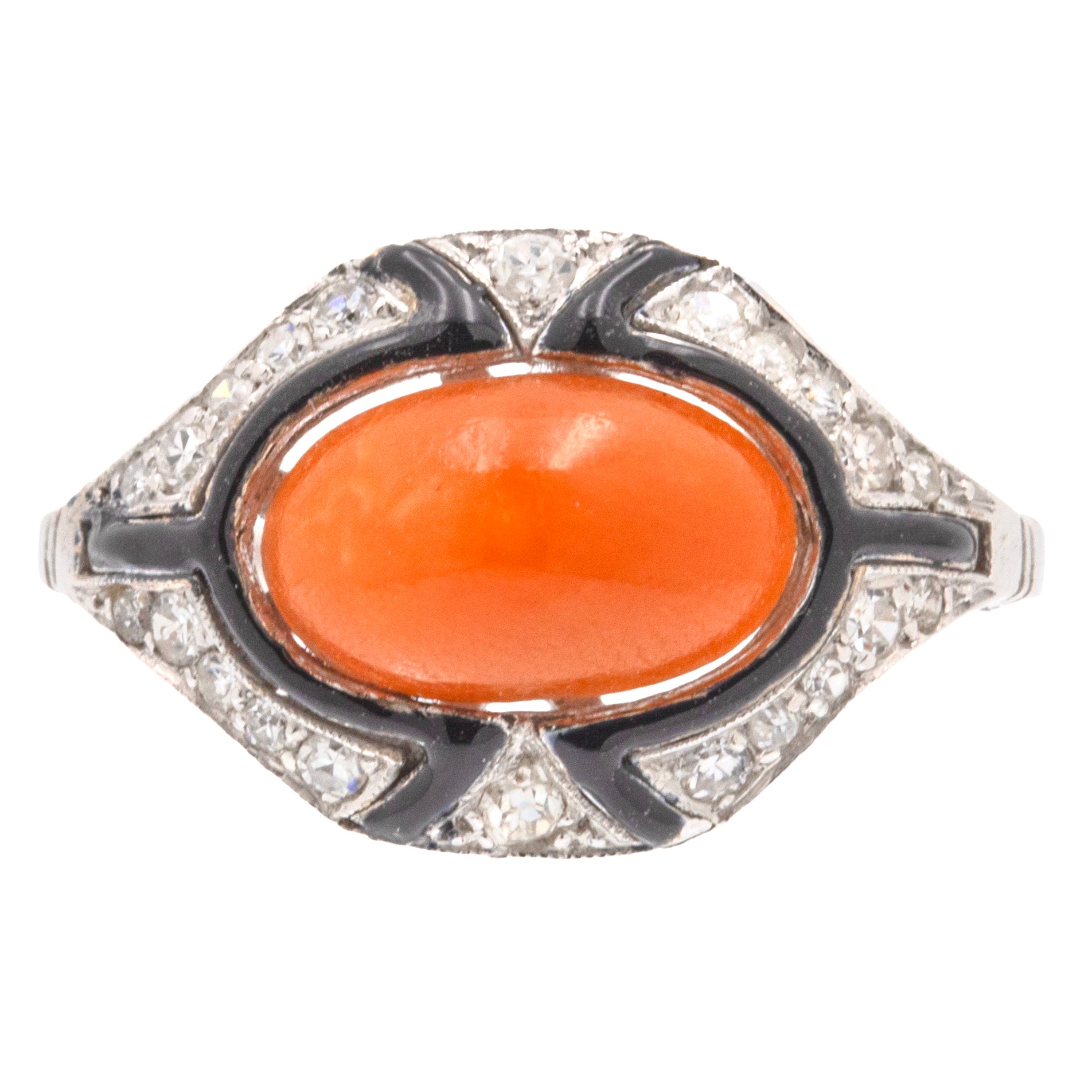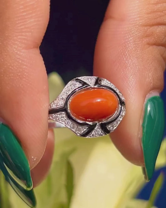 Bague Art Déco en corail, émail noir et diamant