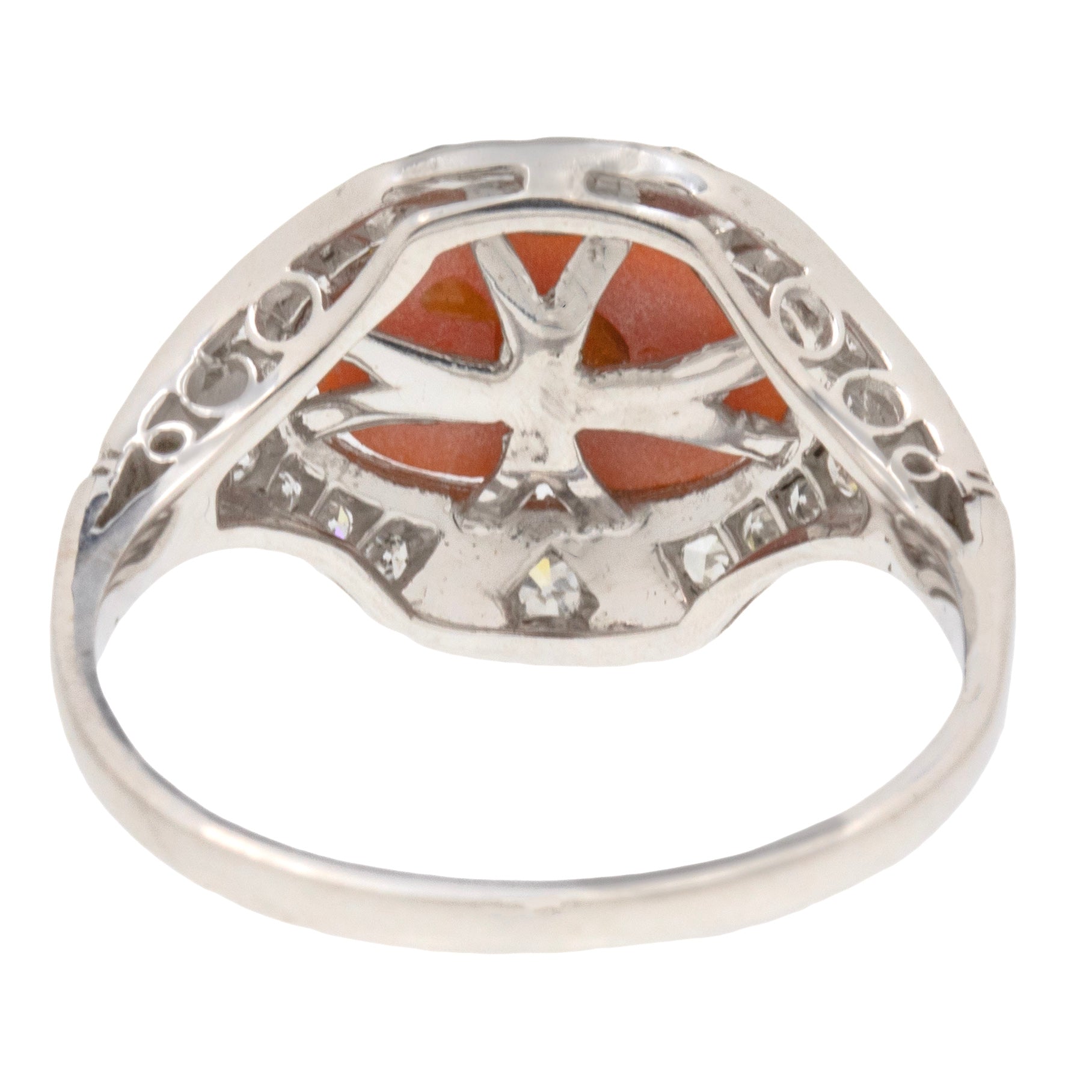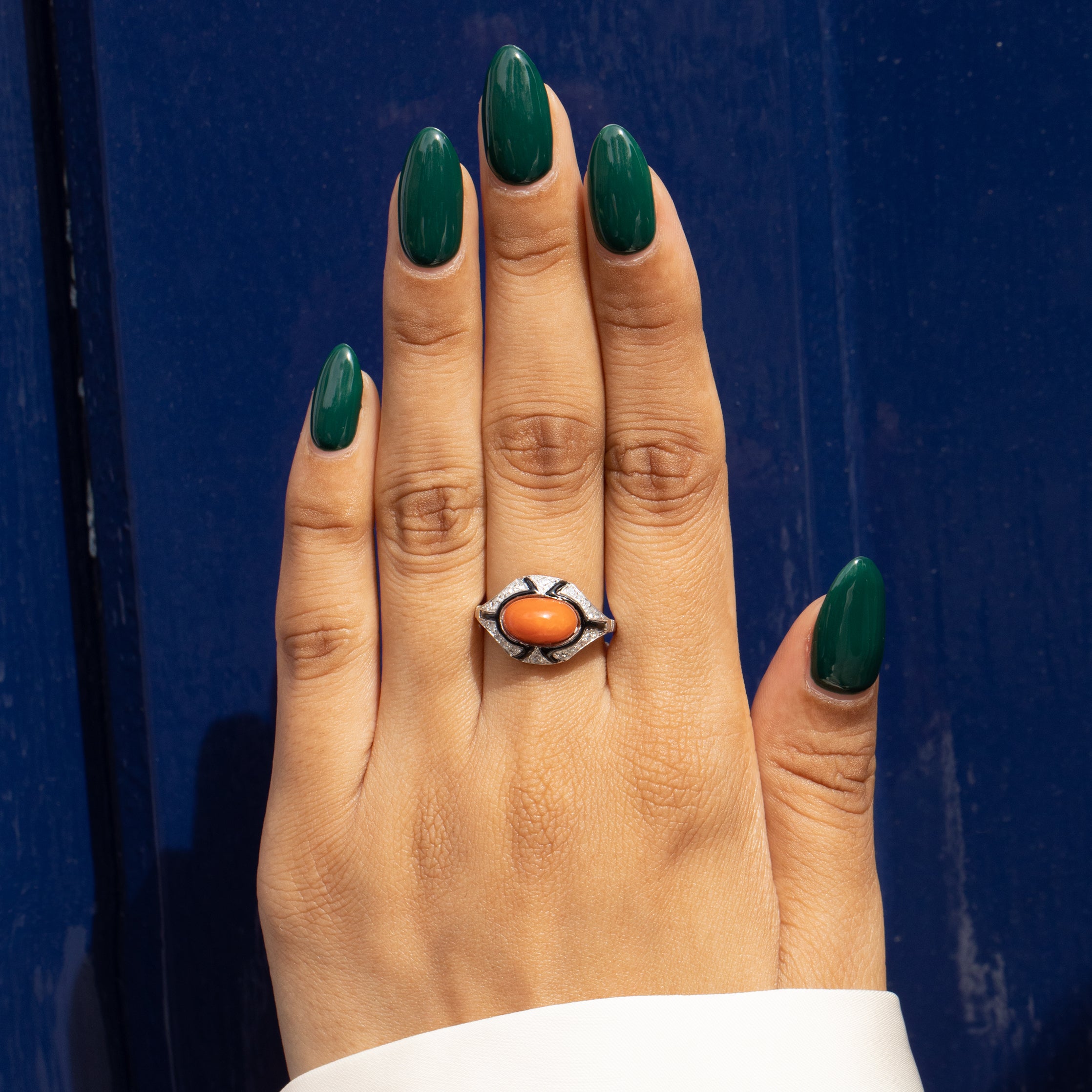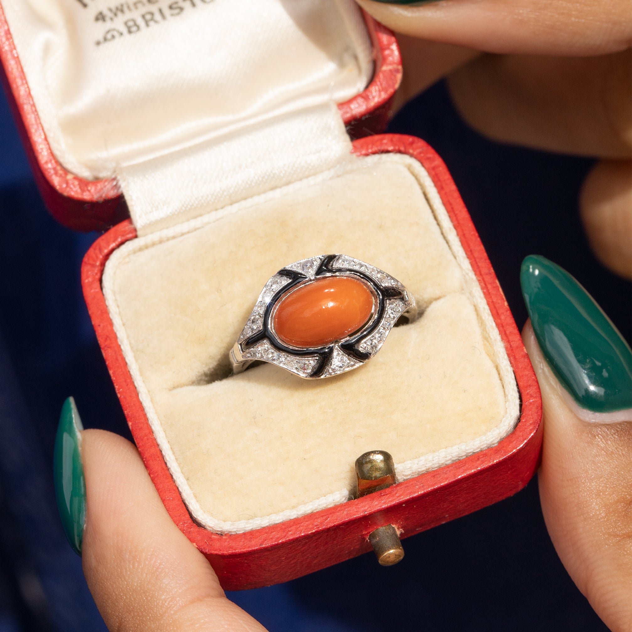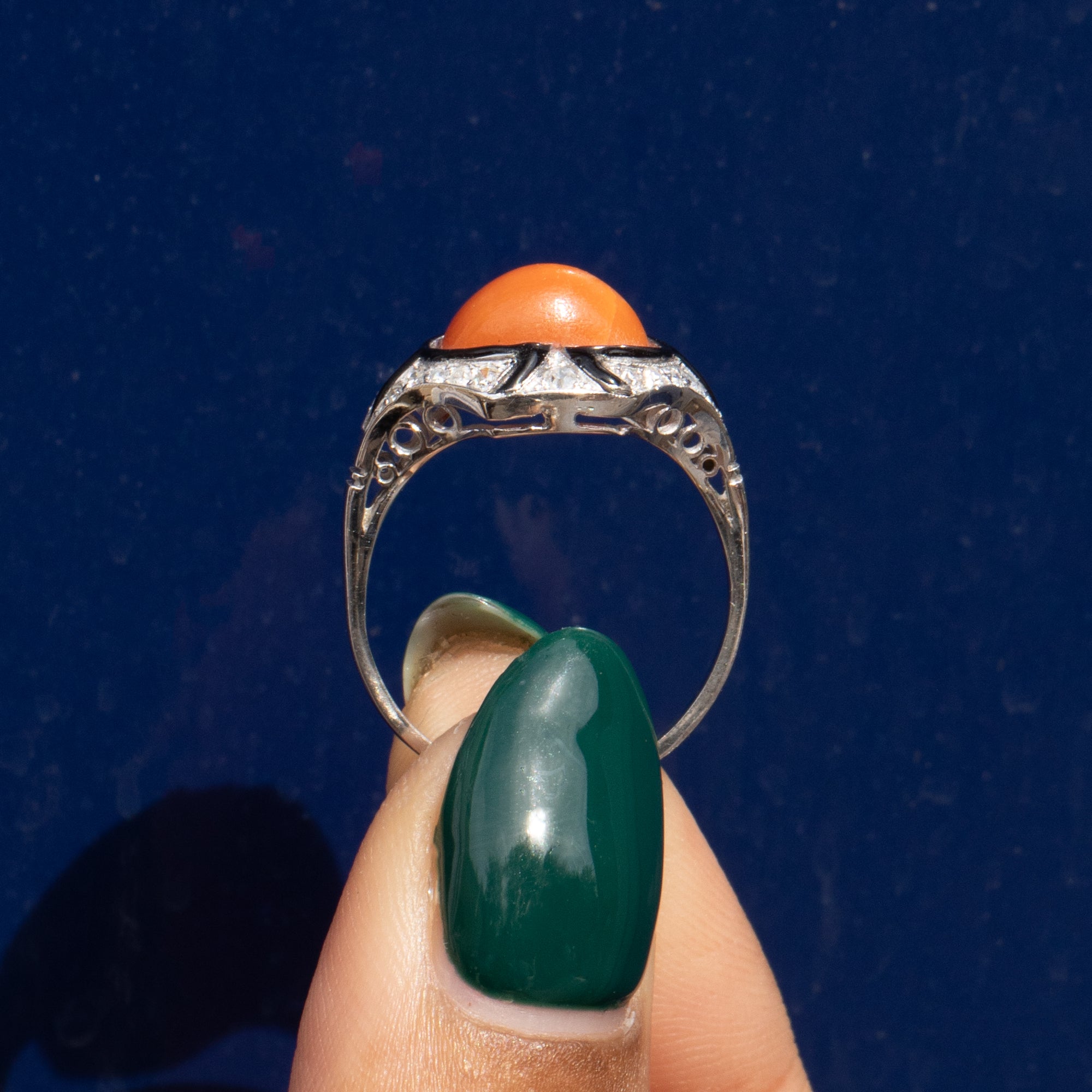 Bague Art Déco en corail, émail noir et diamant