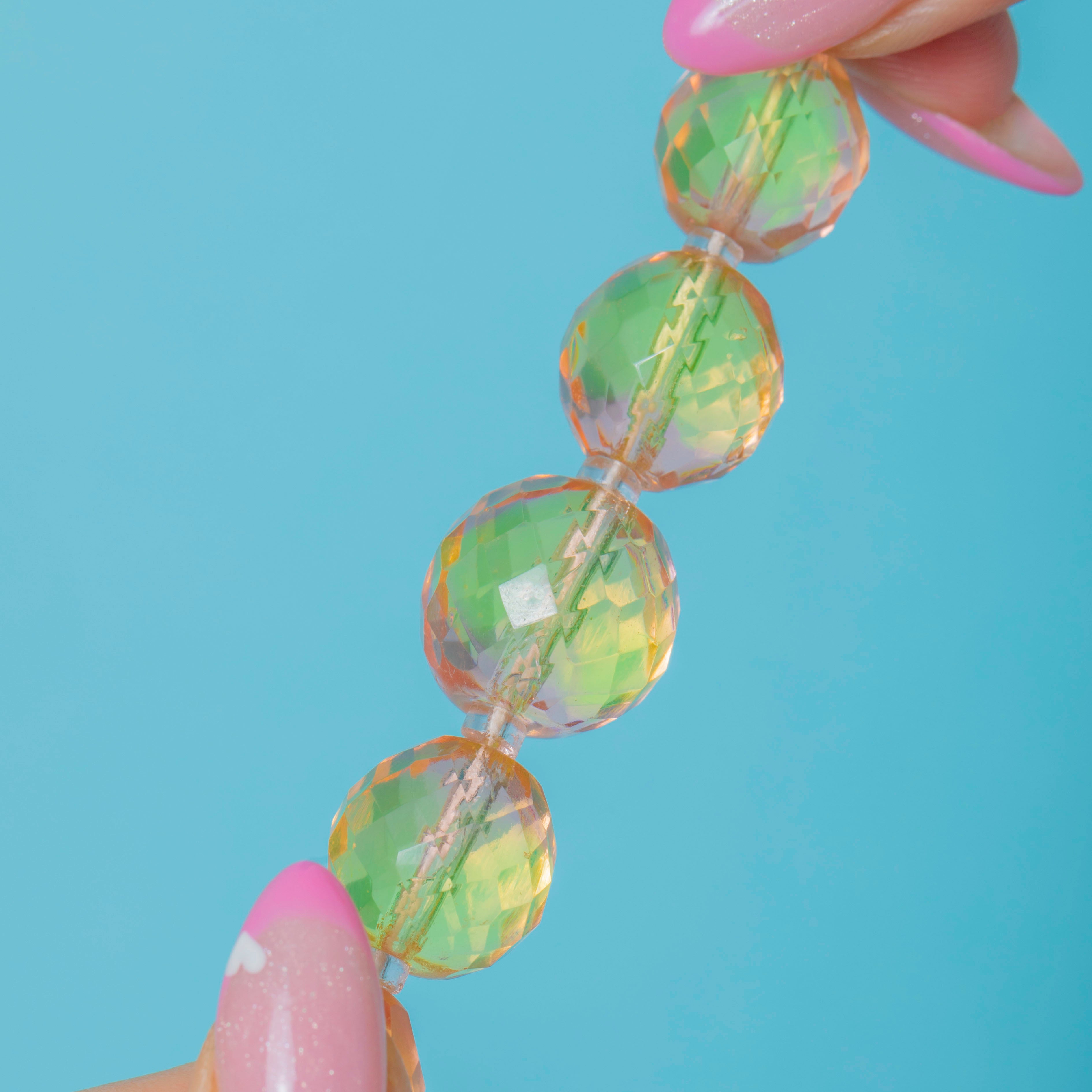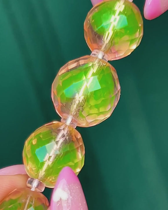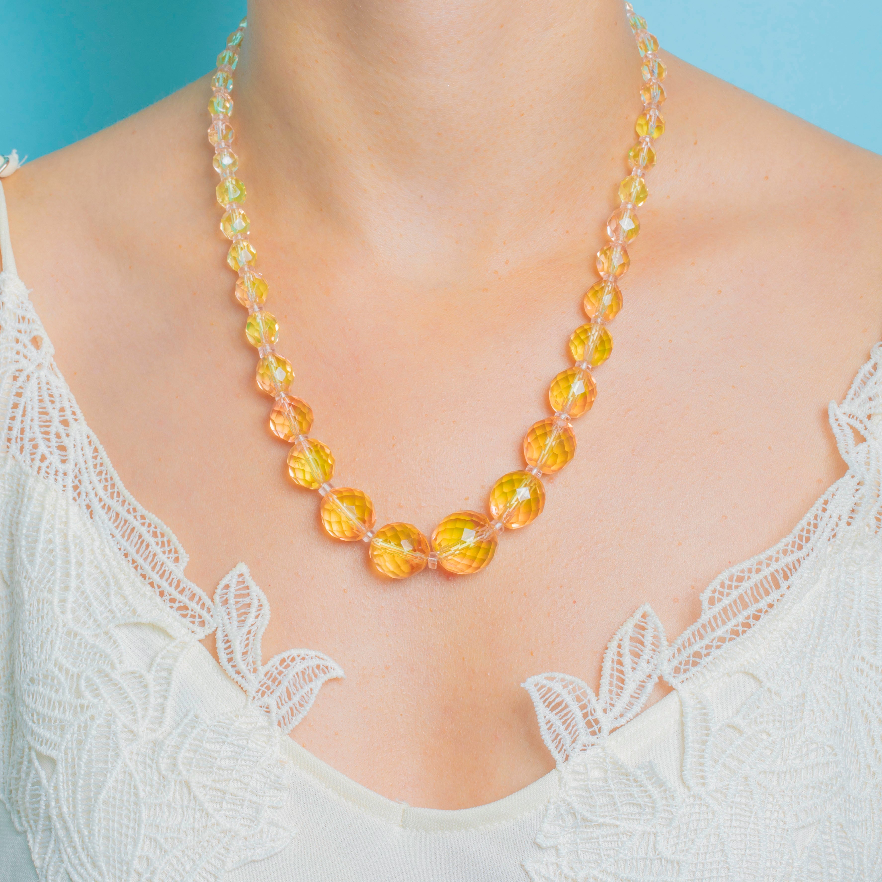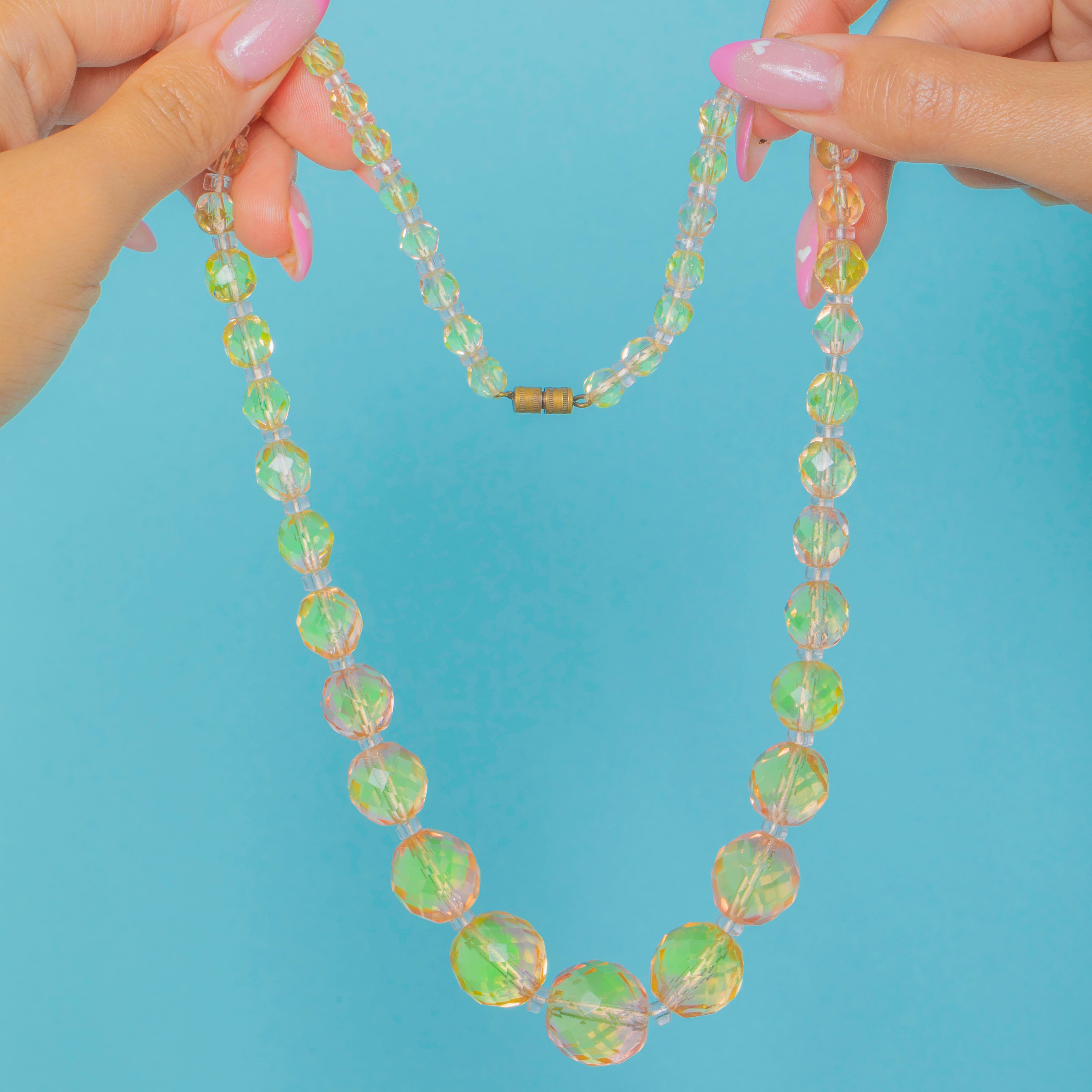 Striking Art Deco faceted Uranium Glass necklace dating to the 1920s–1930s. The graduated glass beads glow a vivid yellow-green, transforming under UV light with that unmistakable neon fluorescence so loved by collectors.