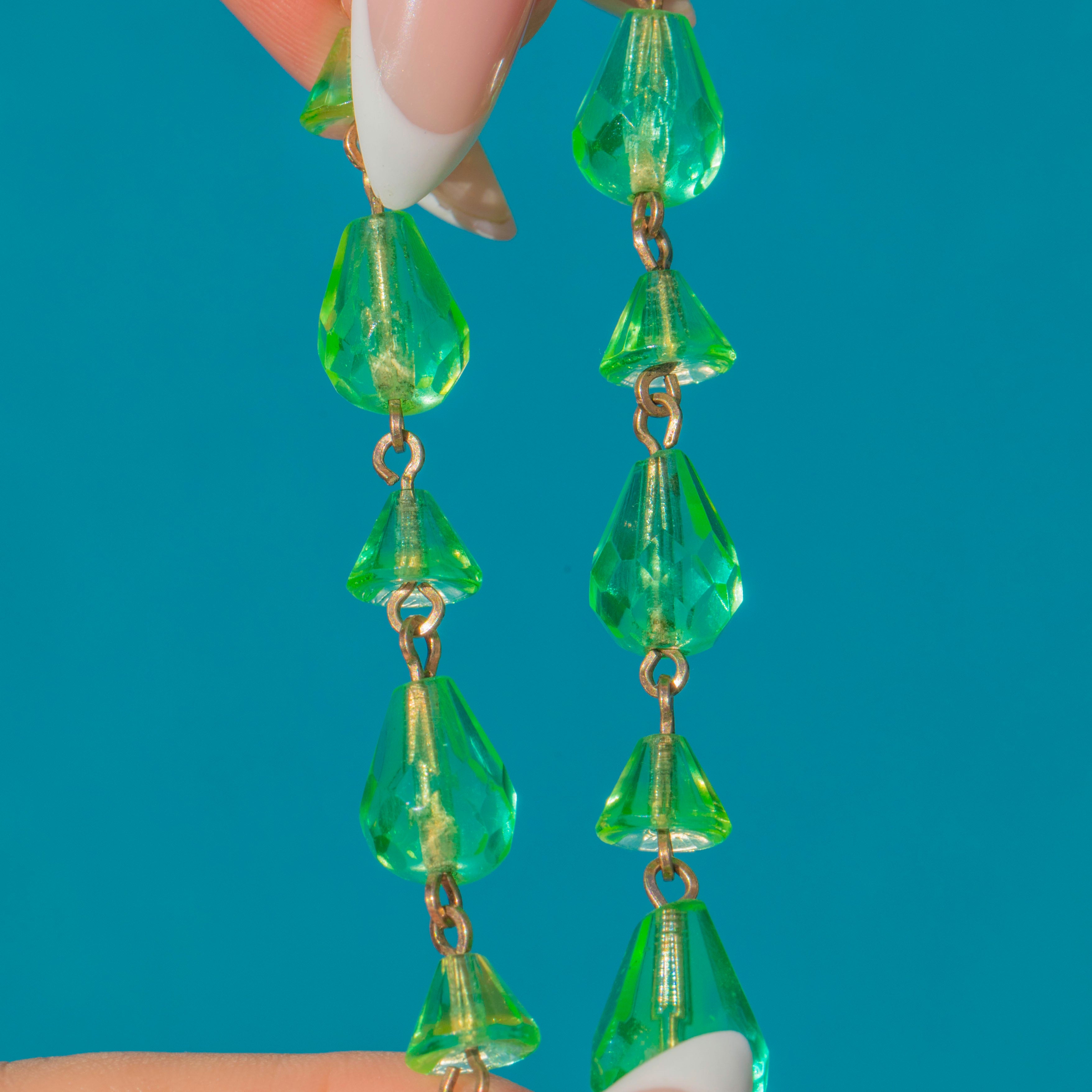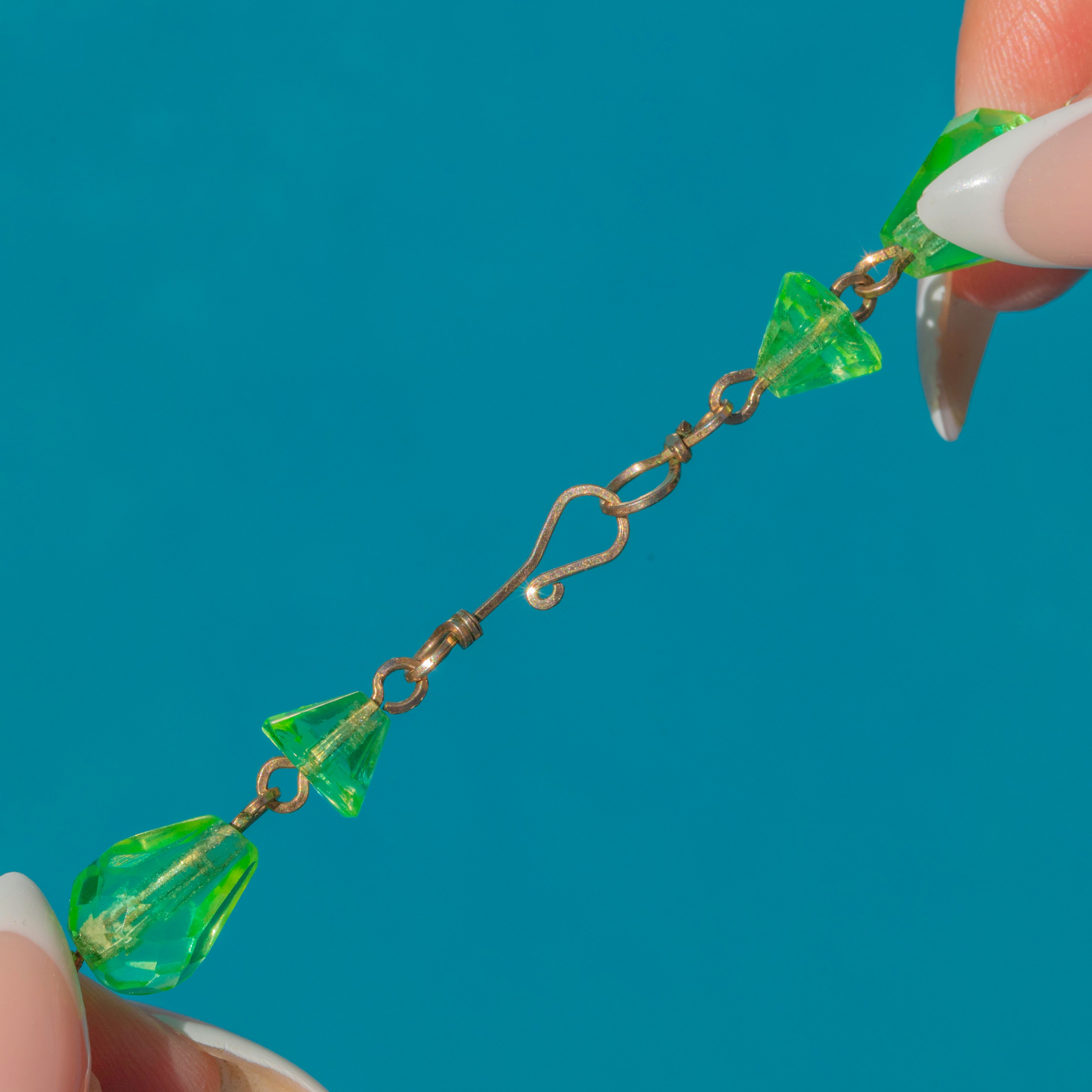 This striking Art Deco necklace is crafted from rare uranium glass, prized for its vivid neon-green glow. The fan-shaped drops are beautifully faceted to catch the light, while the graduated design creates a bold and eye-catching silhouette.