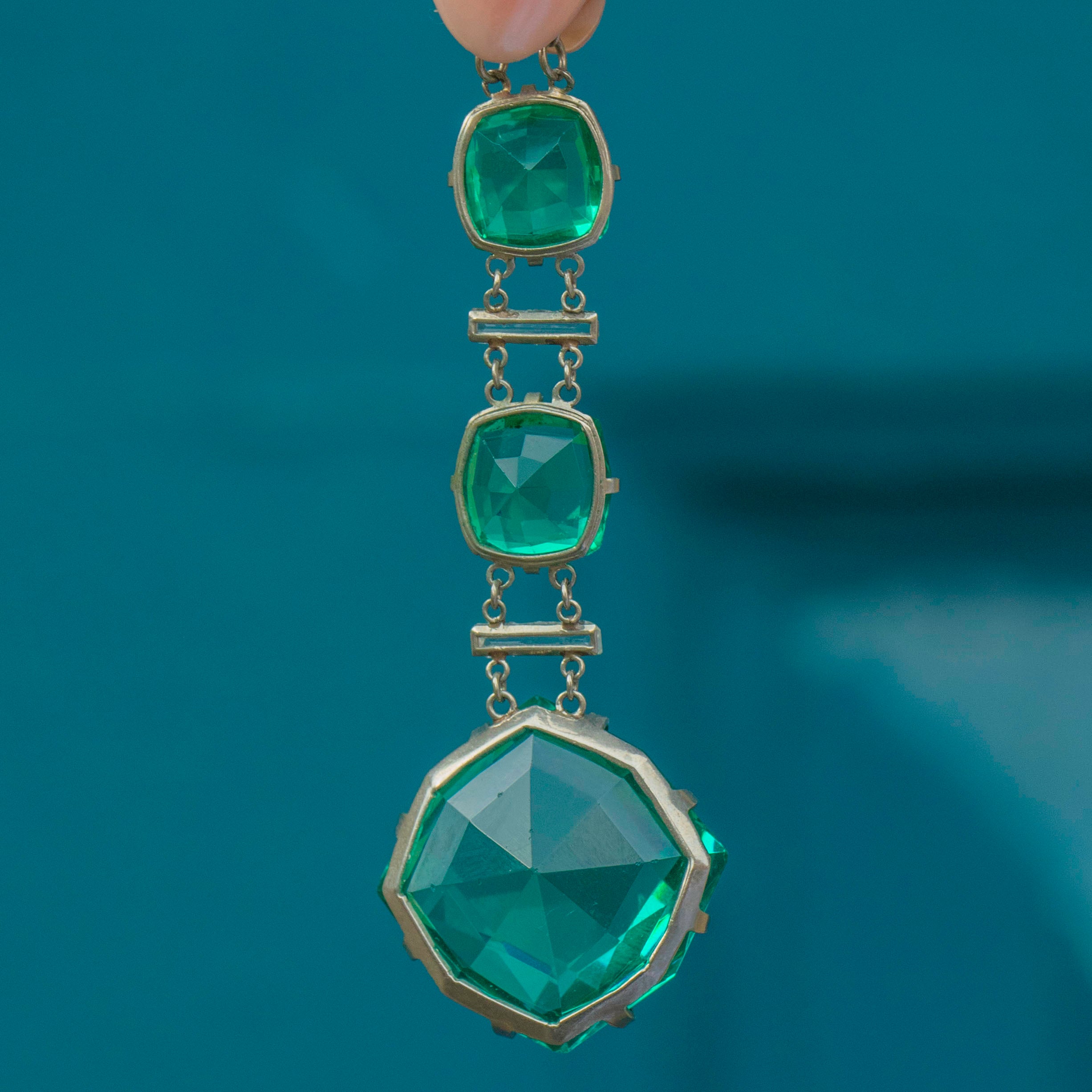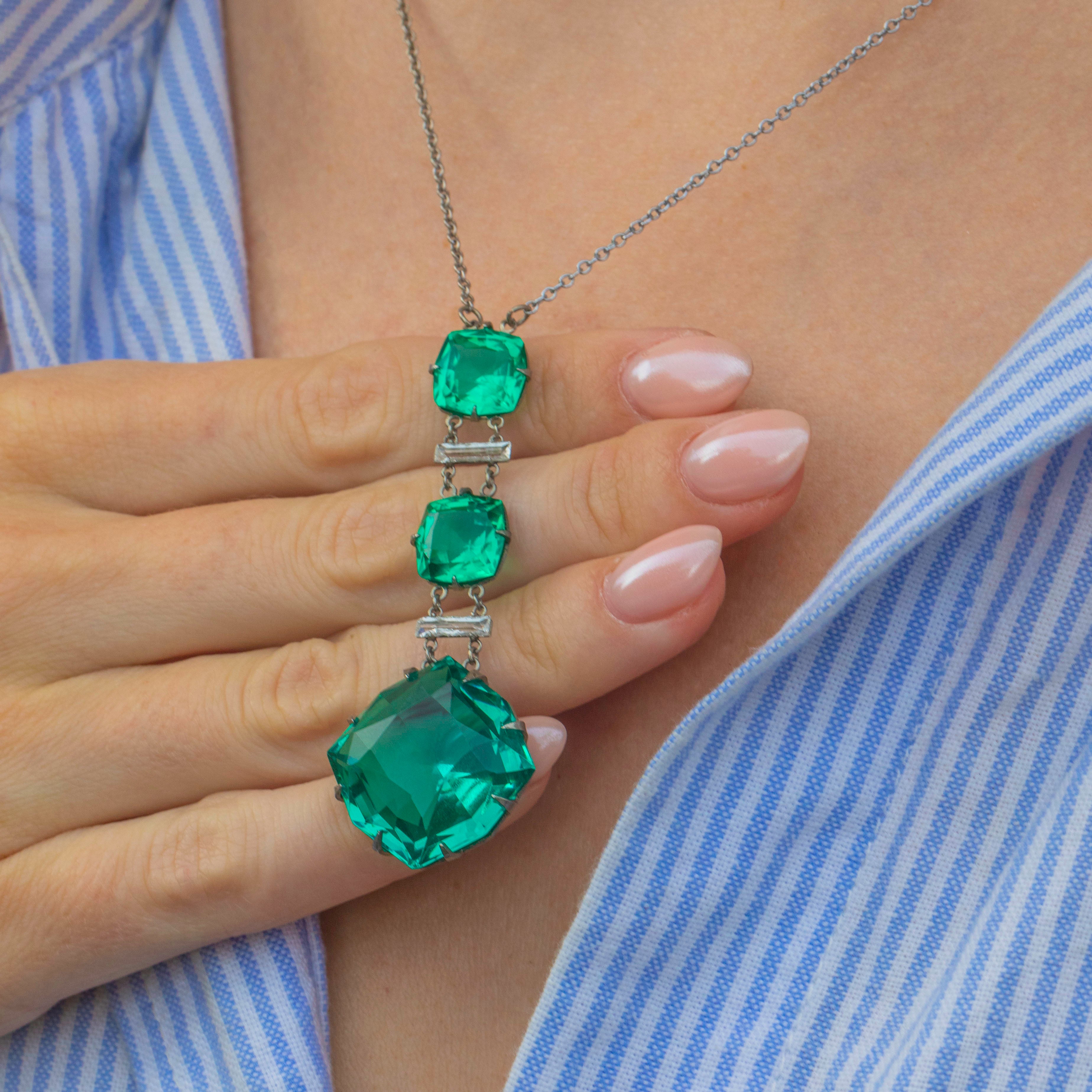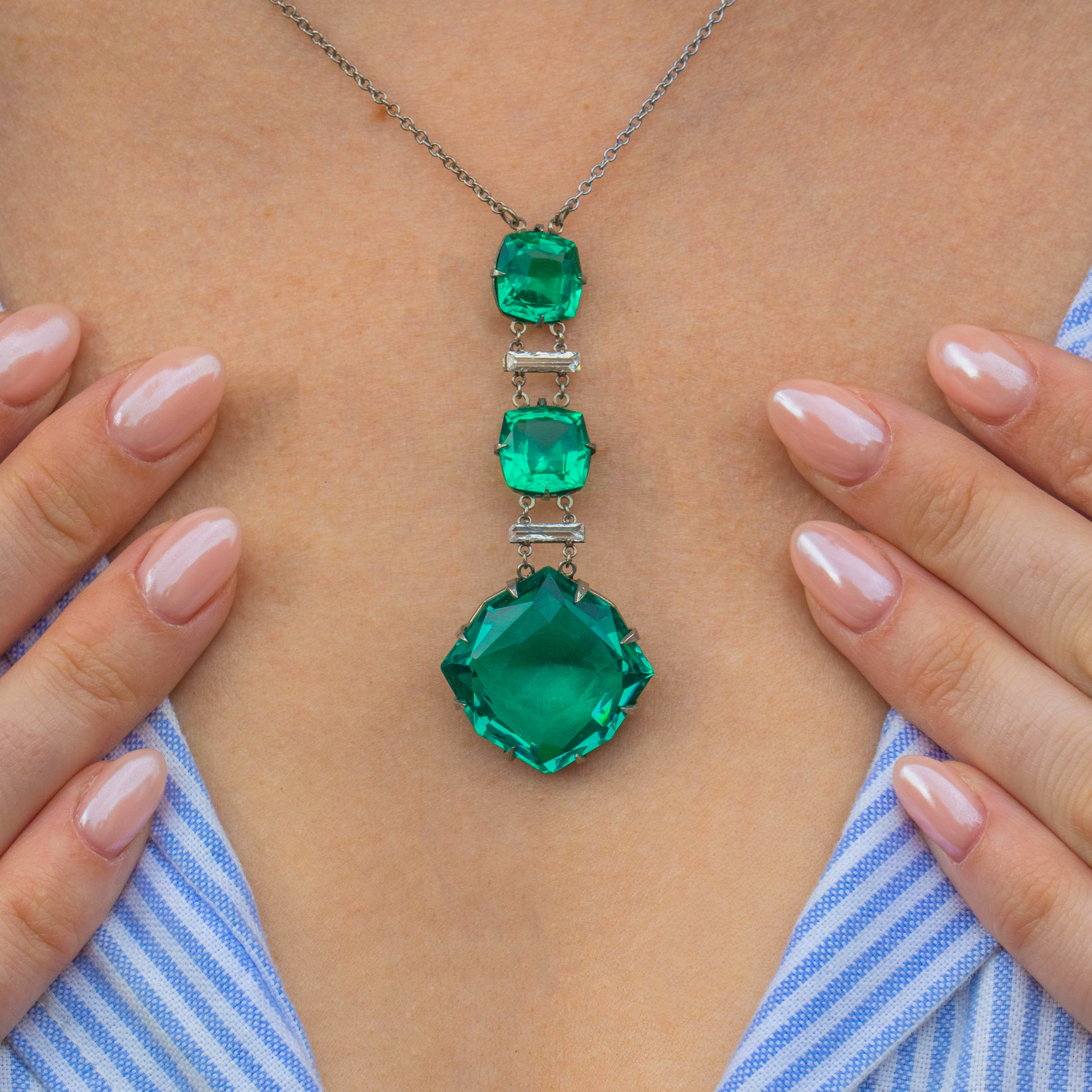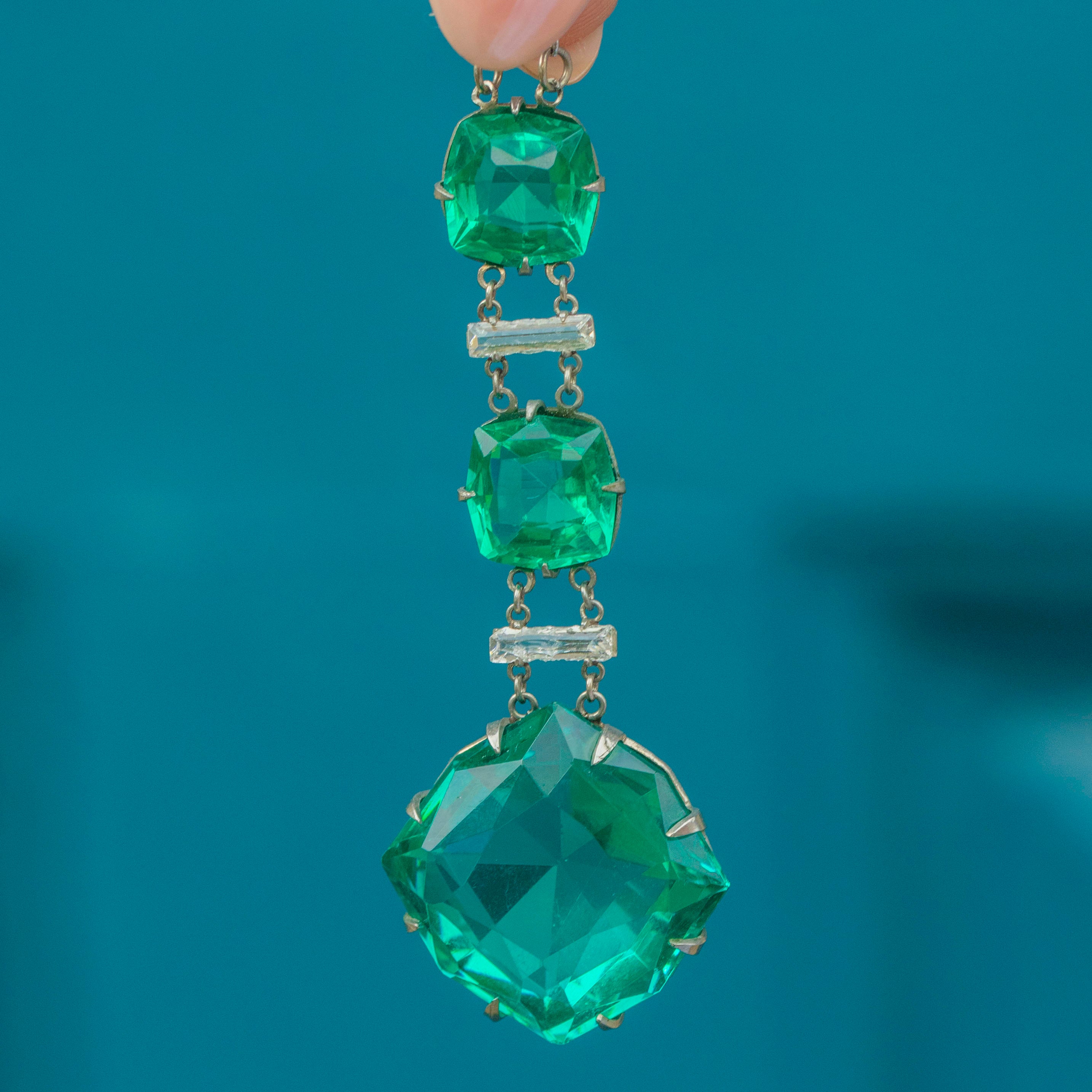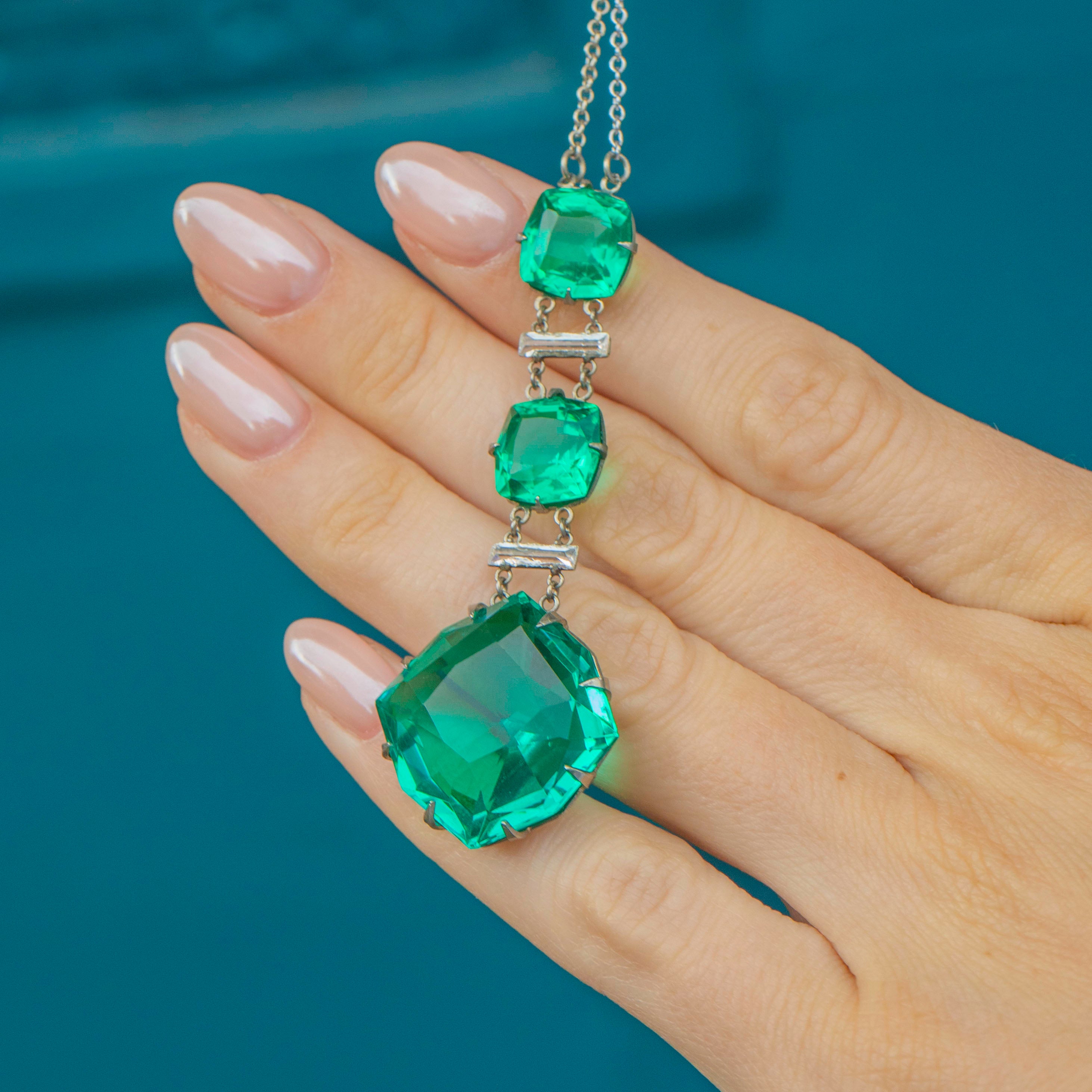 VERY GOOD. This Art Deco Green Paste drop necklace is in wonderful antique condition. The metal chain is smooth and well maintained with each link remaining securely connected. The Emerald Paste have crisp facets with no chips or scuffs, each one securely held within its setting. There is a little wear to the baguette-cut Diamond Paste, commenusrate with age, but this is only visible under close inspection. With a fully functioning bolt ring to finish, you can wear this outstanding antique Paste necklace with absolute confidence!