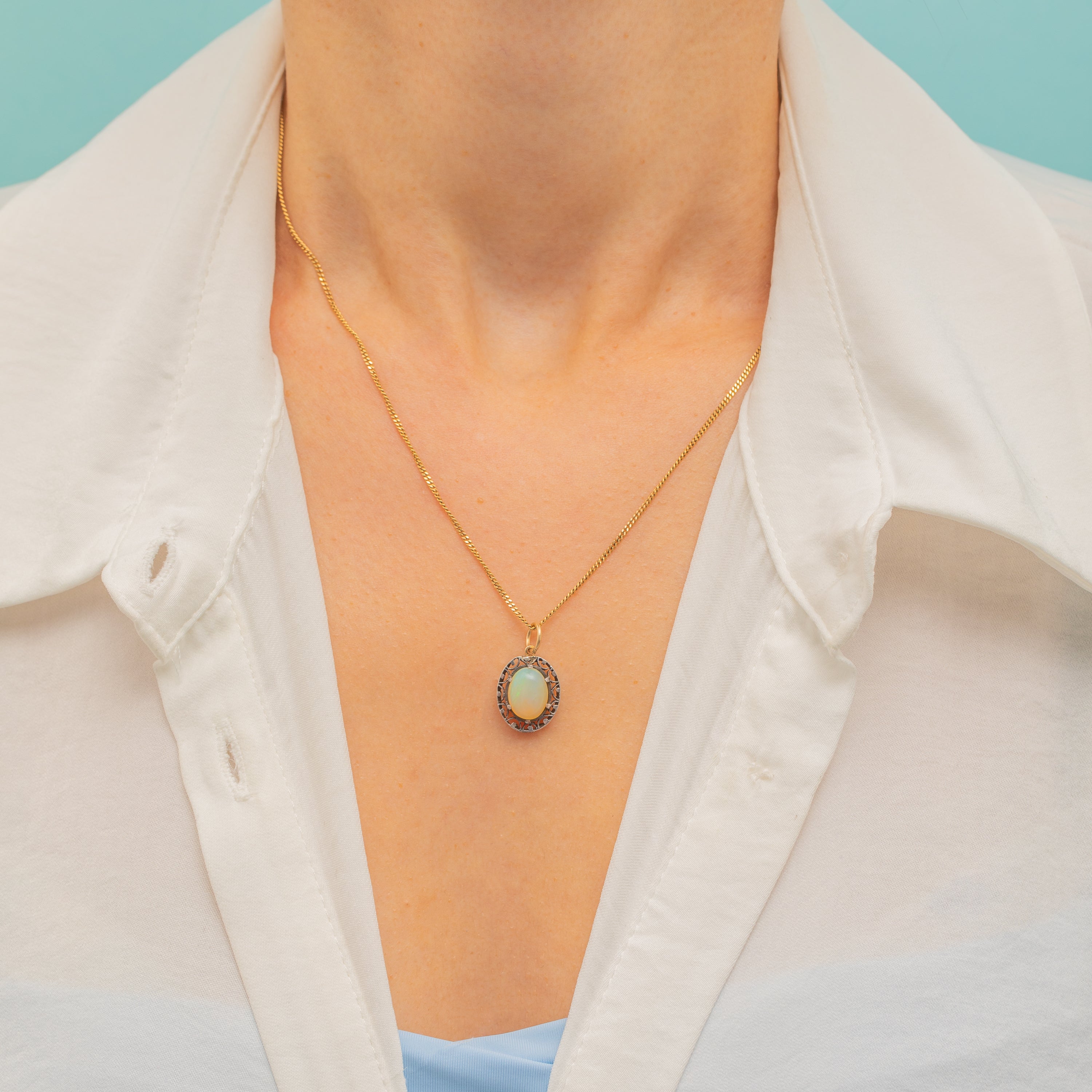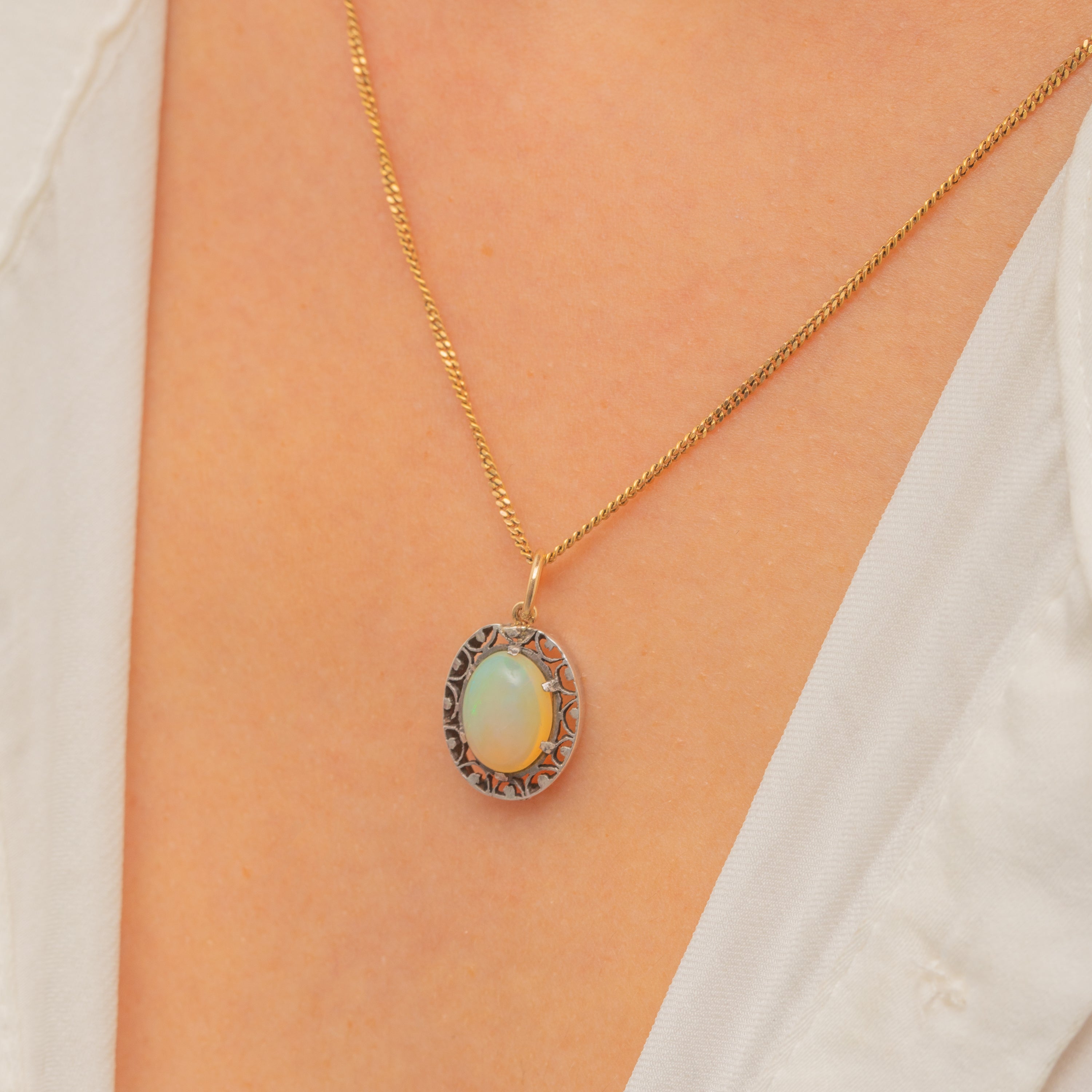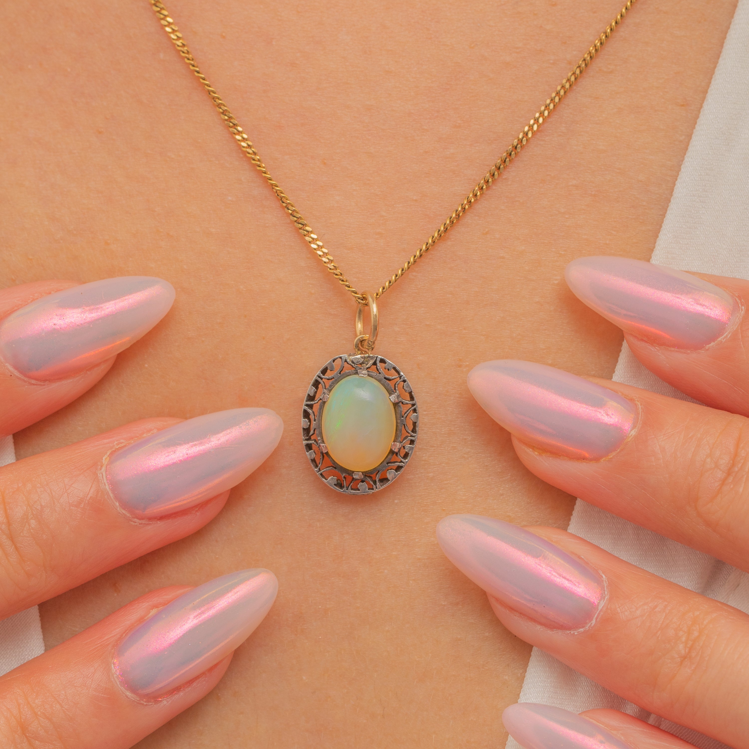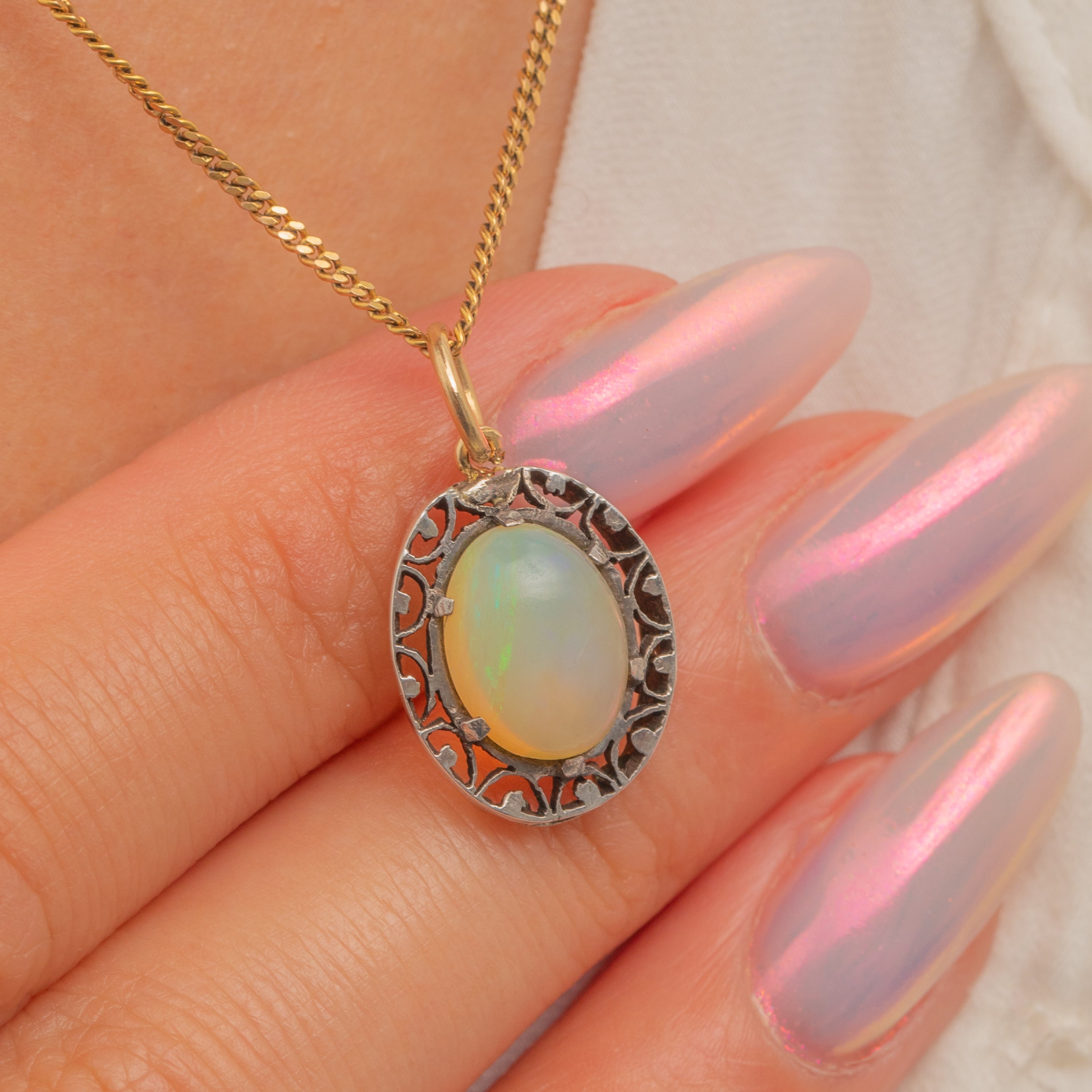 Centred by a plump oval Opal, this dainty Art Deco pendant radiates soft pastel sage and sky blue hues with flashes of striking orange. This antique pendant catches the light wonderfully. Her 0.65ct Opal is set within ornately detailed Silver openwork settings in quintessential Art Deco style.