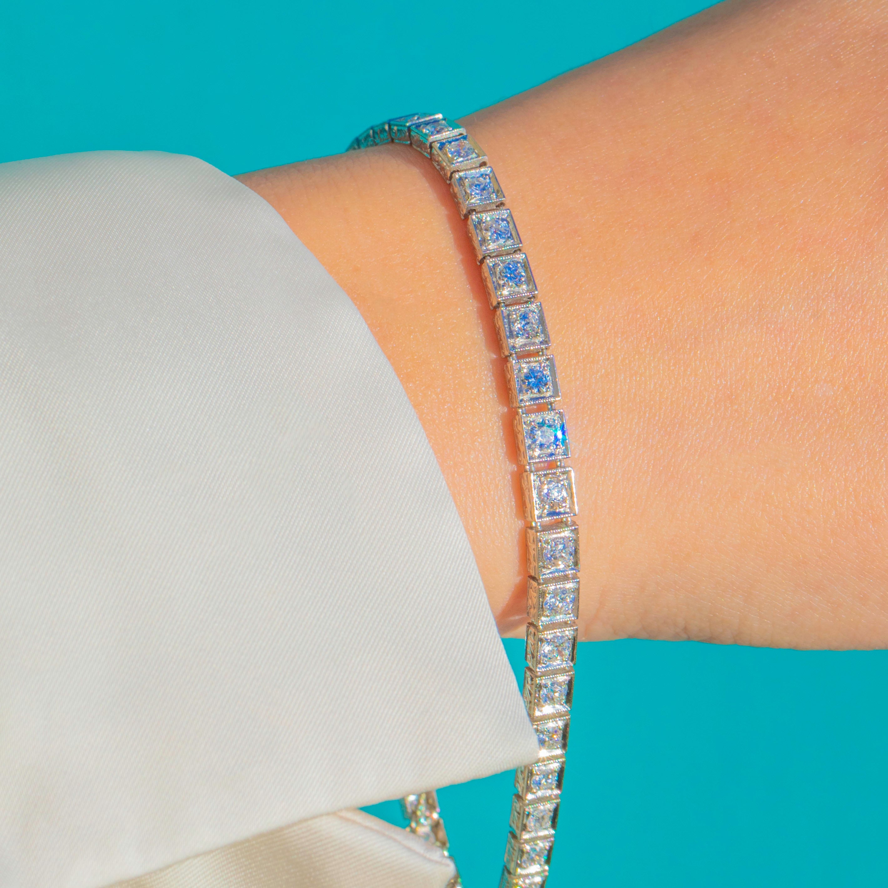 The Diamonds are bright & beautifully matched. Full of fire, giving the bracelet that iconic Deco sparkle from every angle. At 7 & 2/4" long, it drapes elegantly across the wrist with timeless sophistication. (Can be shortened if needed!)